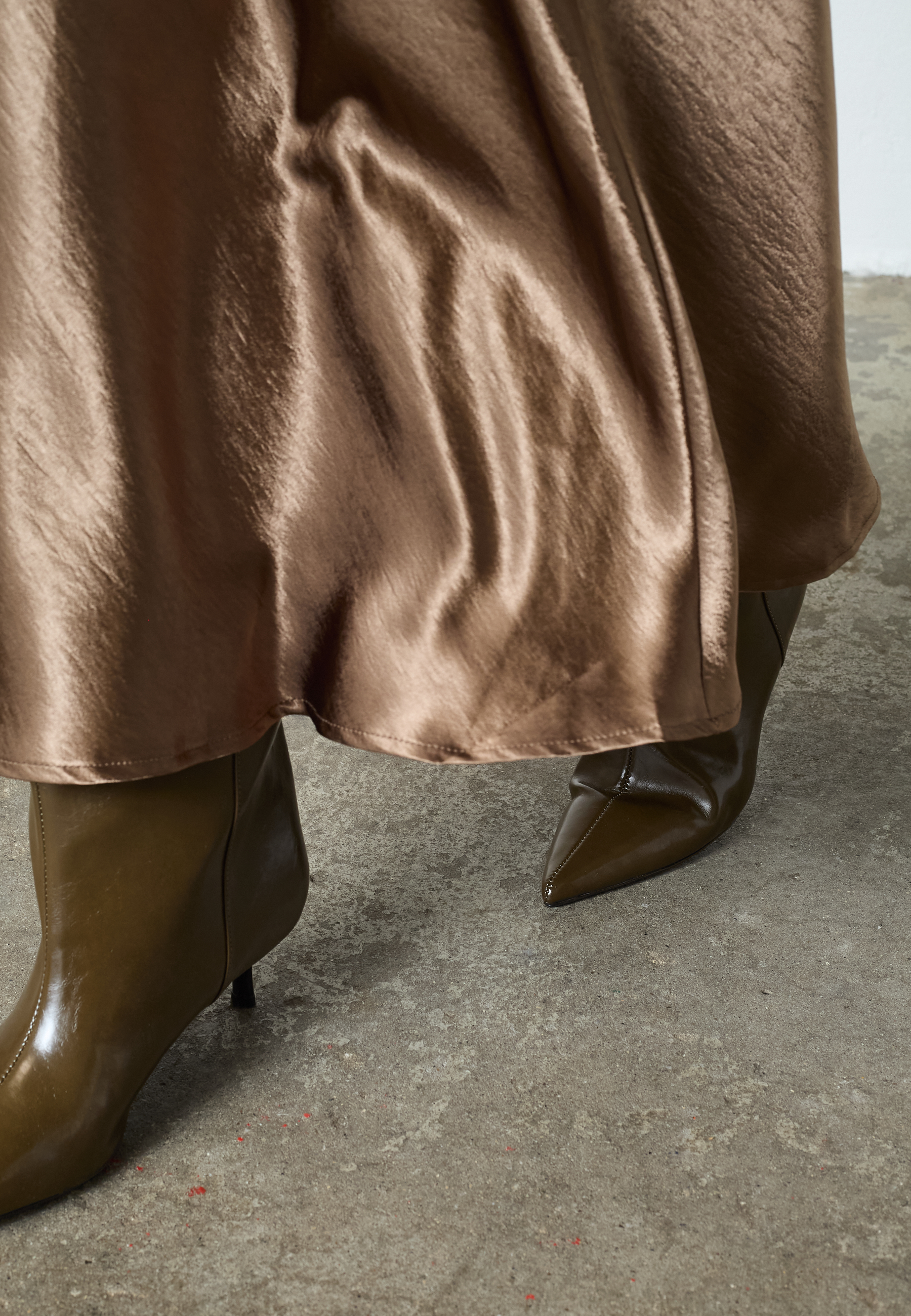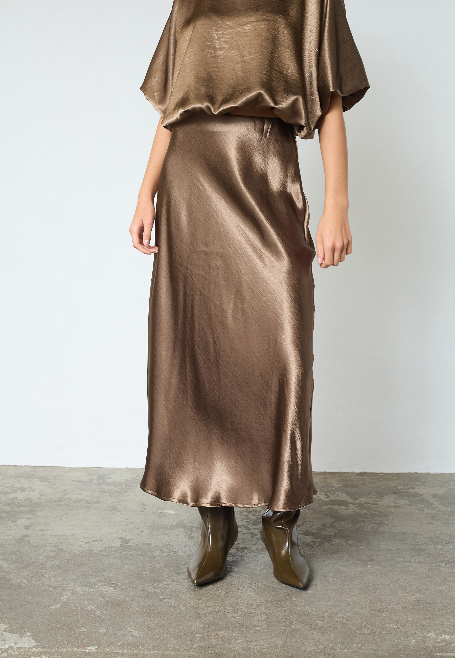 N.GEWO-SK4 er en satin midi-nederdel med en flatterende A-line facon, der fremhæver figuren elegant. Modellen har en størrelse S.