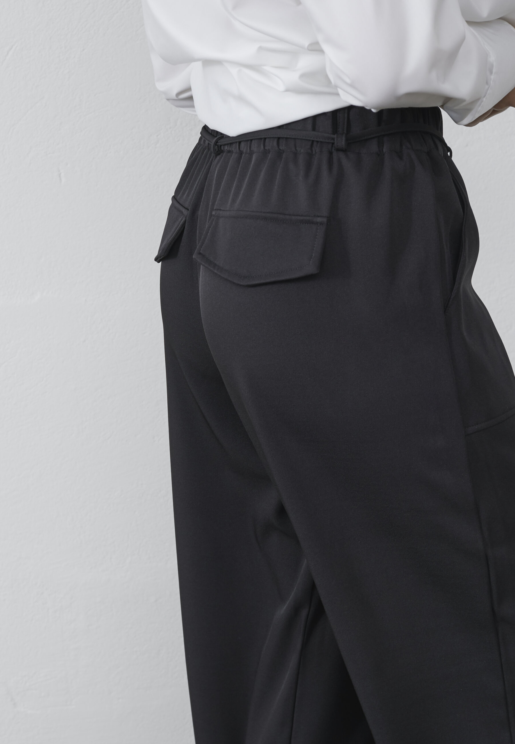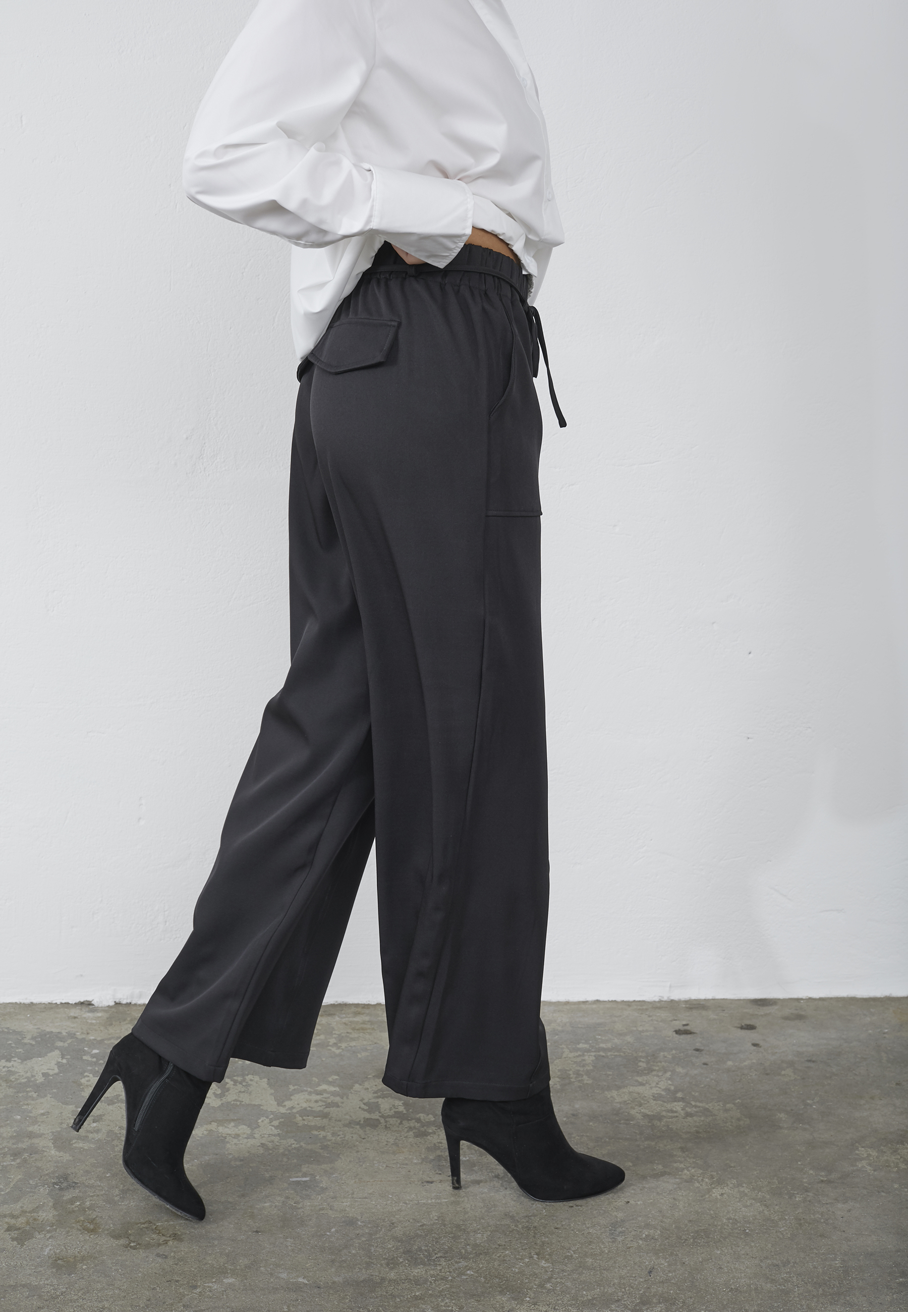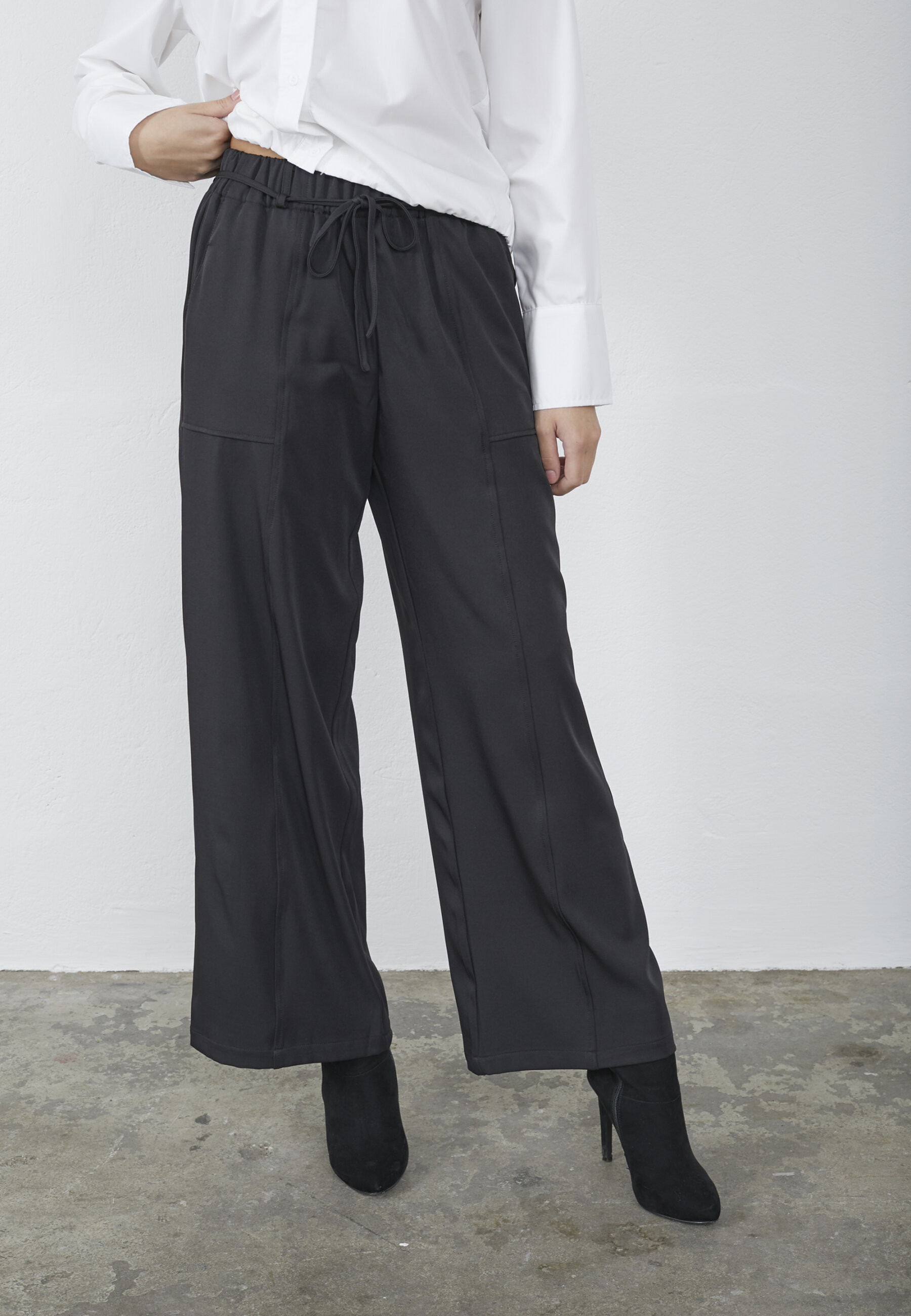 GRIPA-PA1 er en klassisk buks med brede ben og en lomme i hver sidesøm. Buksen har en høj talje med elastik og snøre. Modellen har en størrelse S på.
