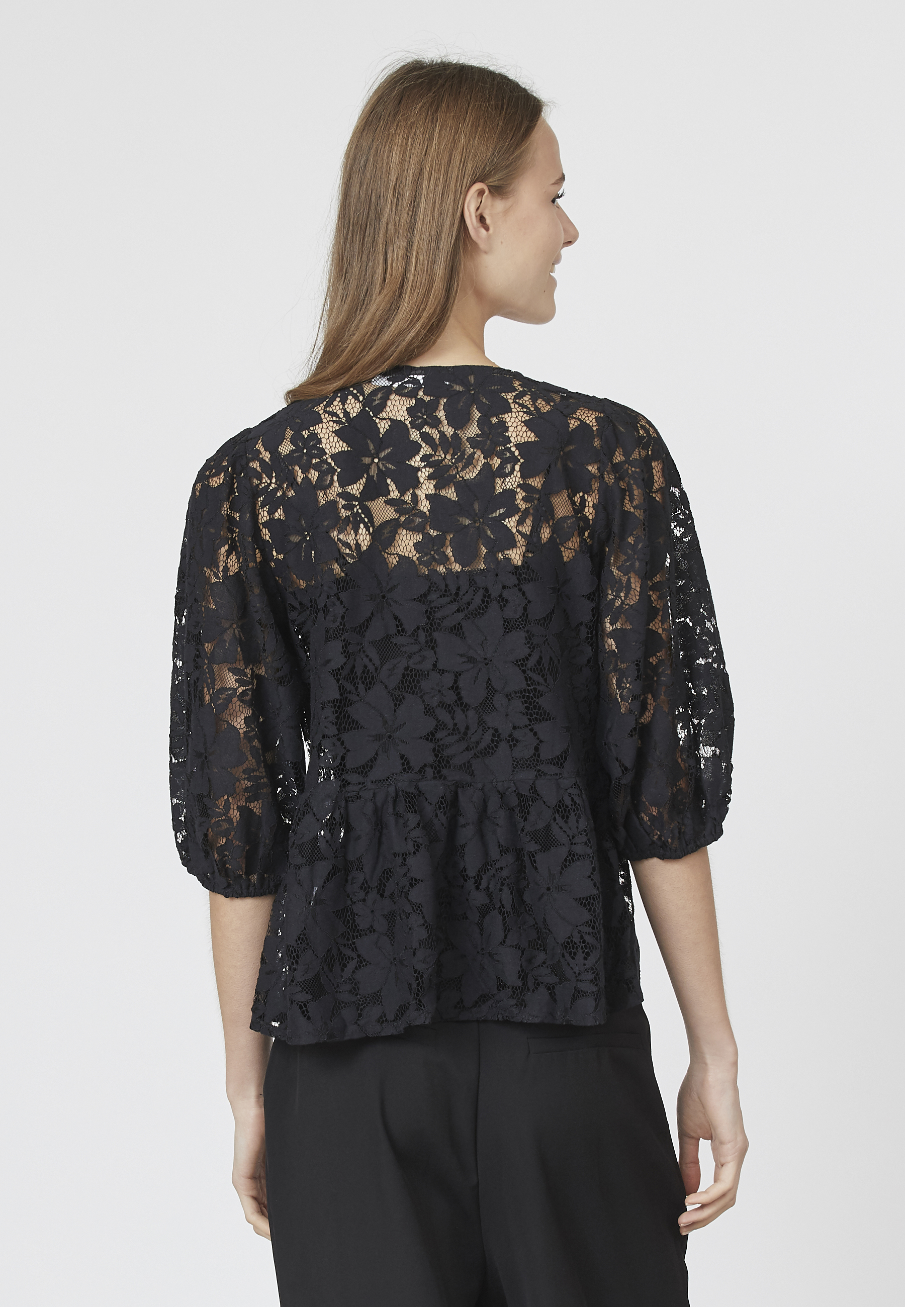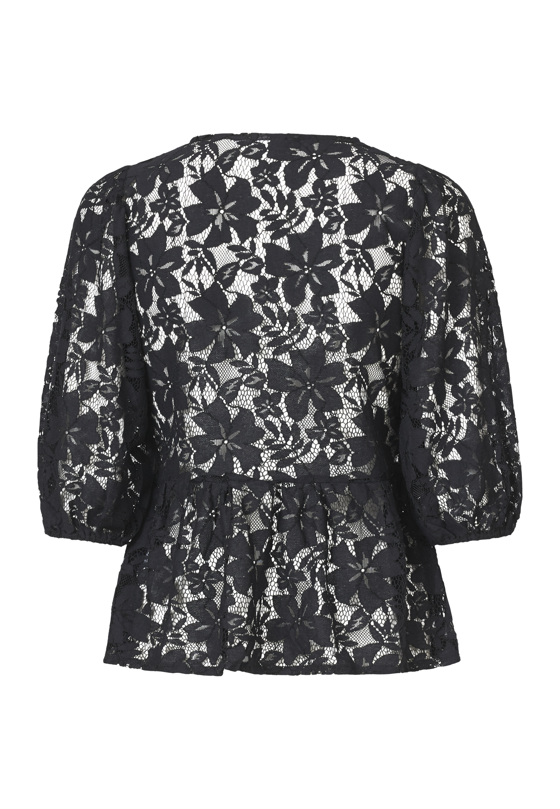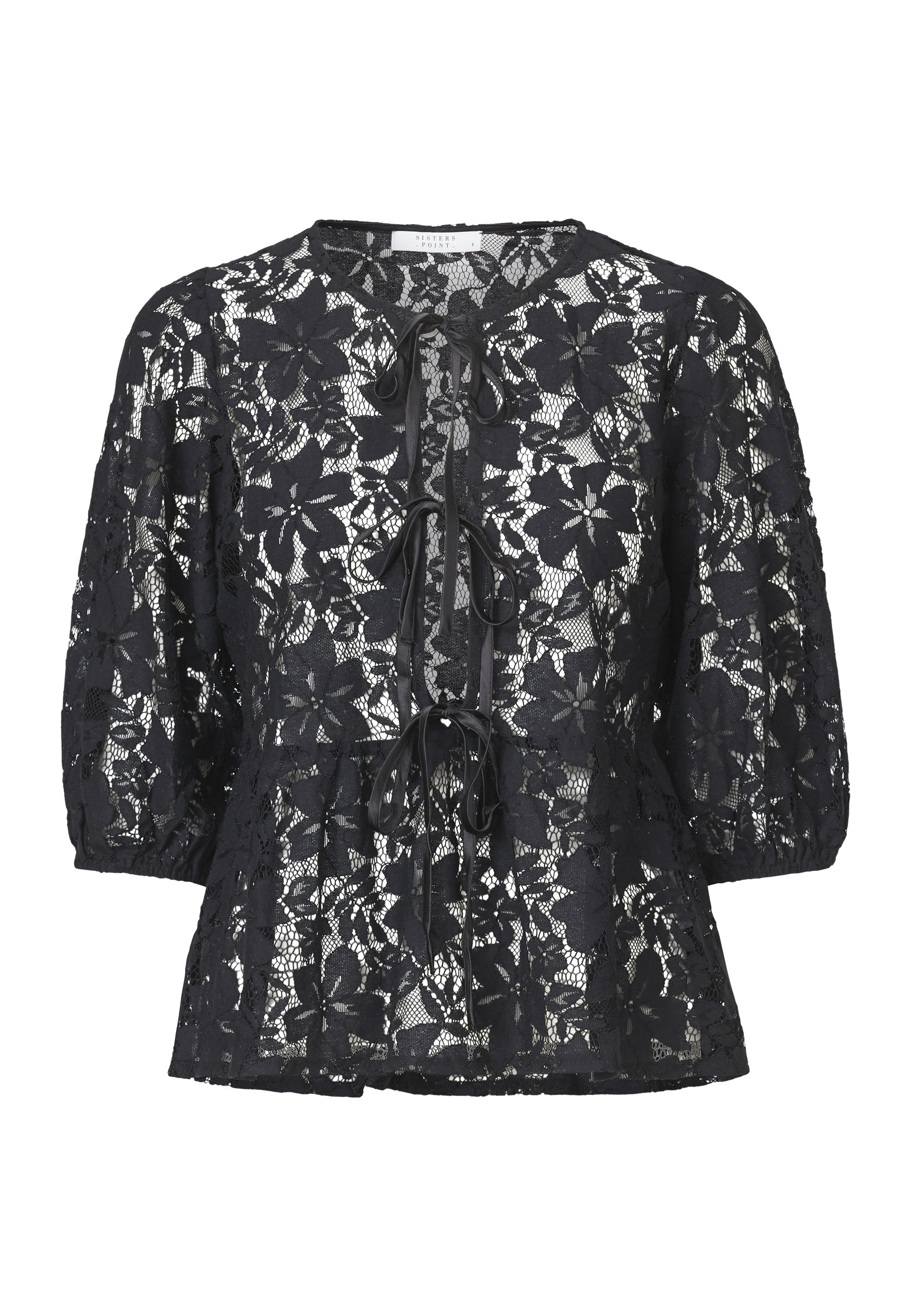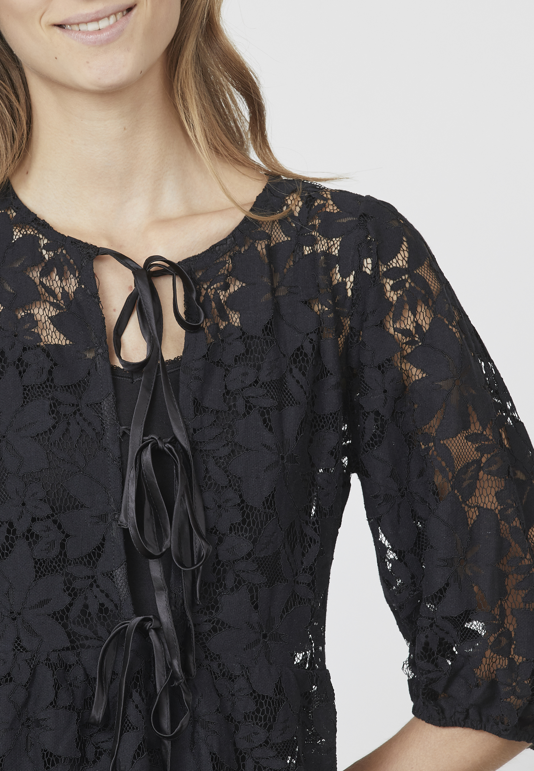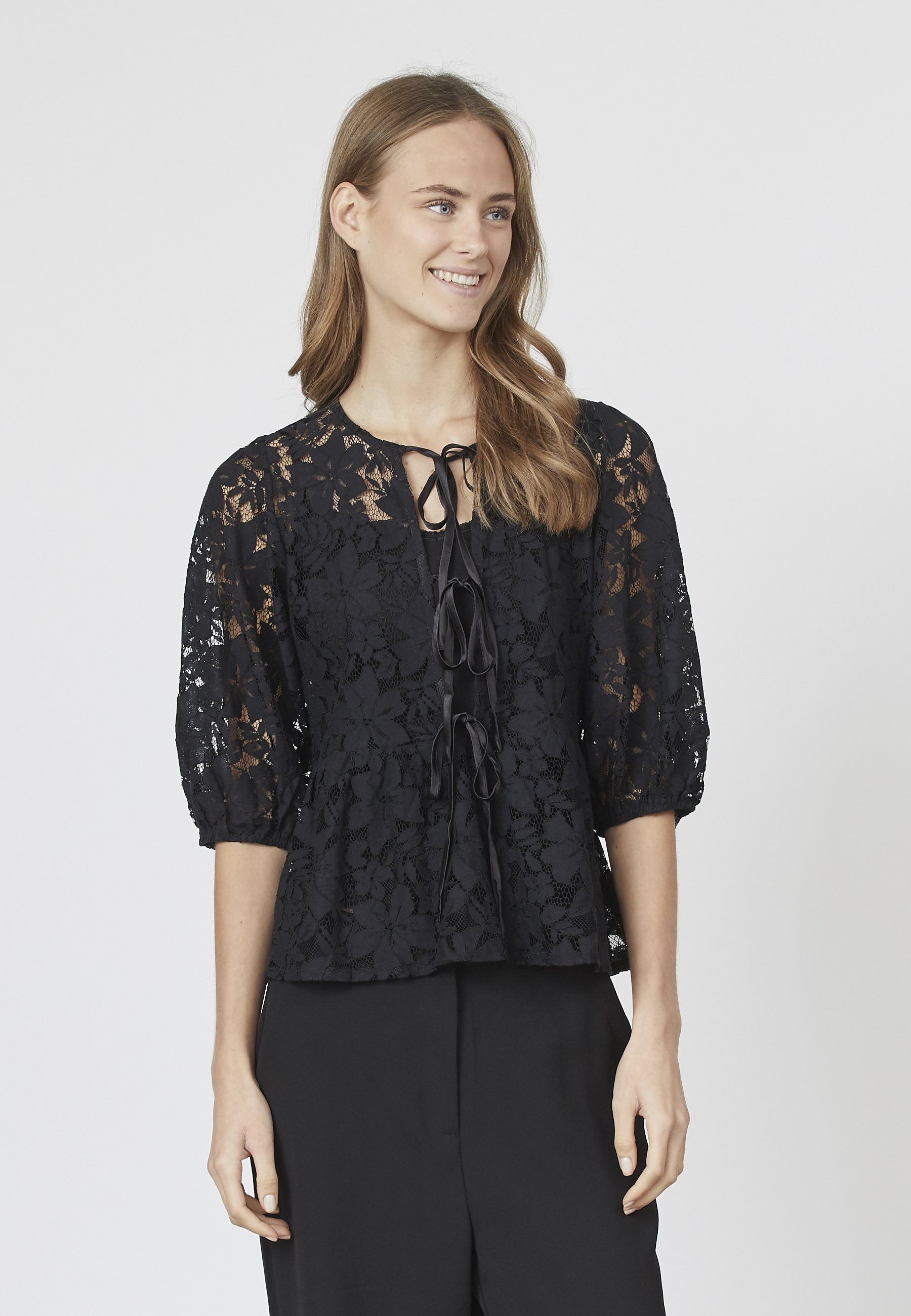 NELL-P.TOP2 er en feminin transparent blonde bluse med to bindebånd på midten. Blusen har trekvartærmer med elastik manchetter. Modellen har en str. S på.