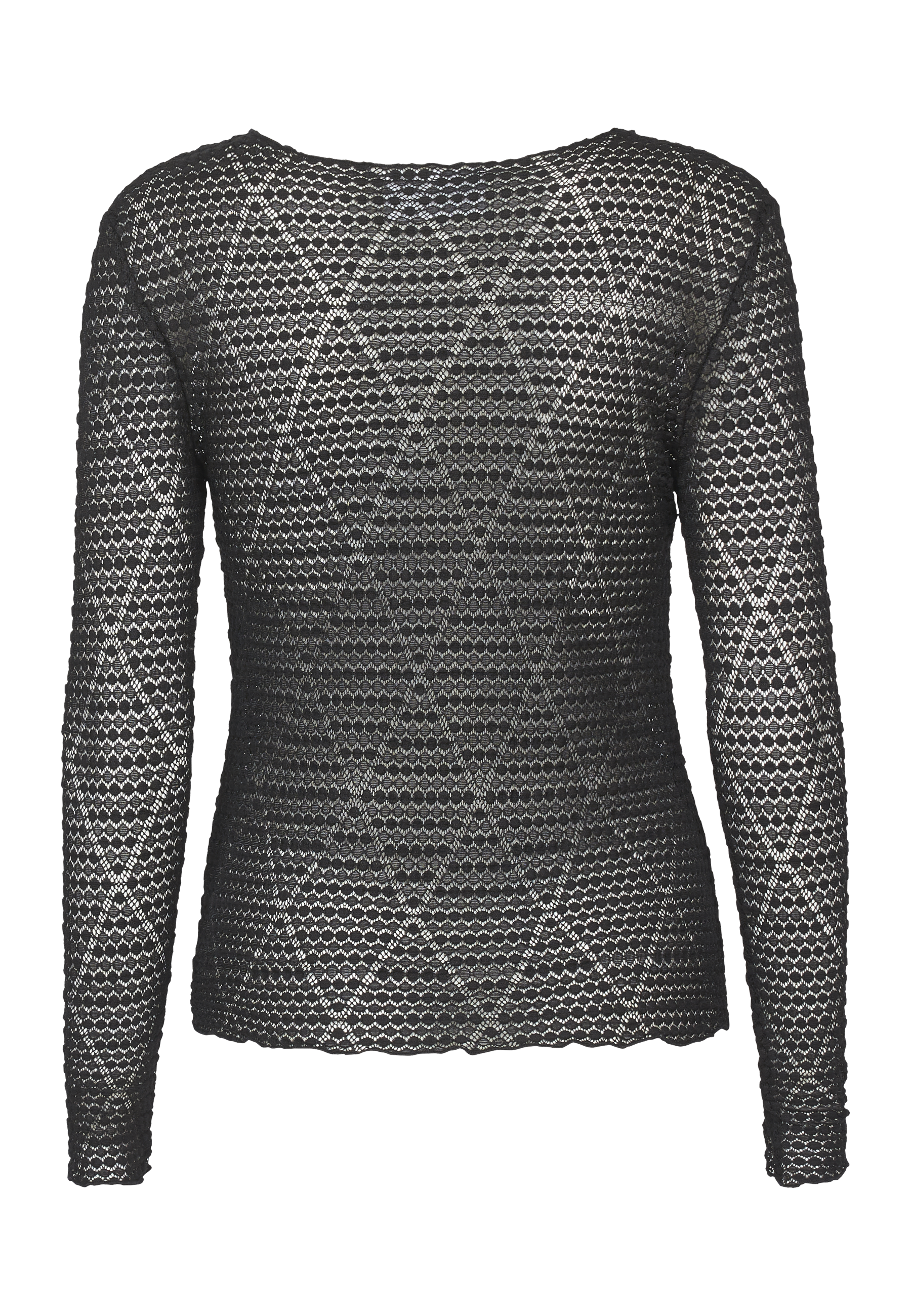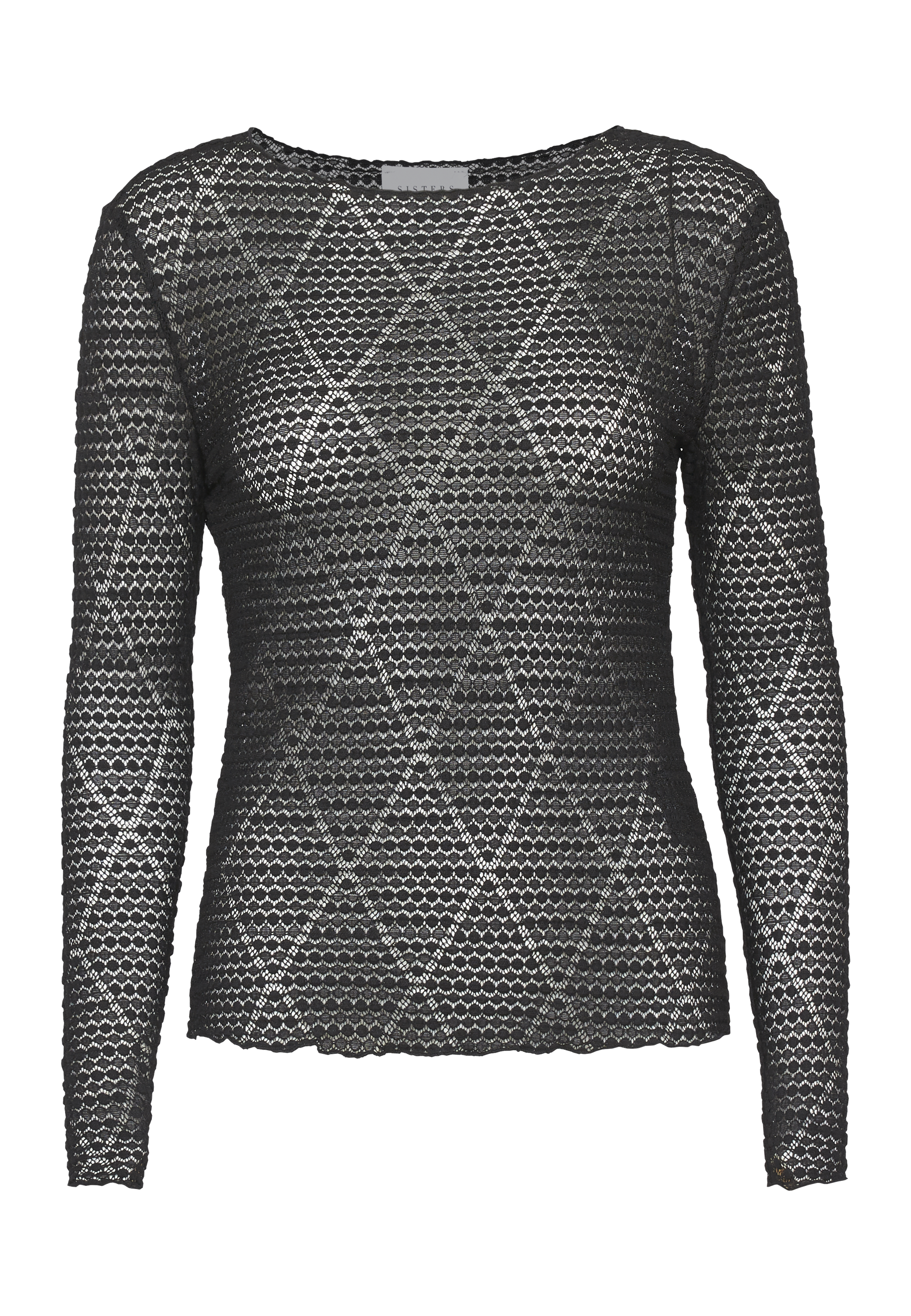VELKA-LS er en tætsiddende mesh trøje med lange ærmer og rund hals. Trøjen er forholdsvis gennemsigtig og har flæser ved håndled og talje. Modellen har en størrelse S på.