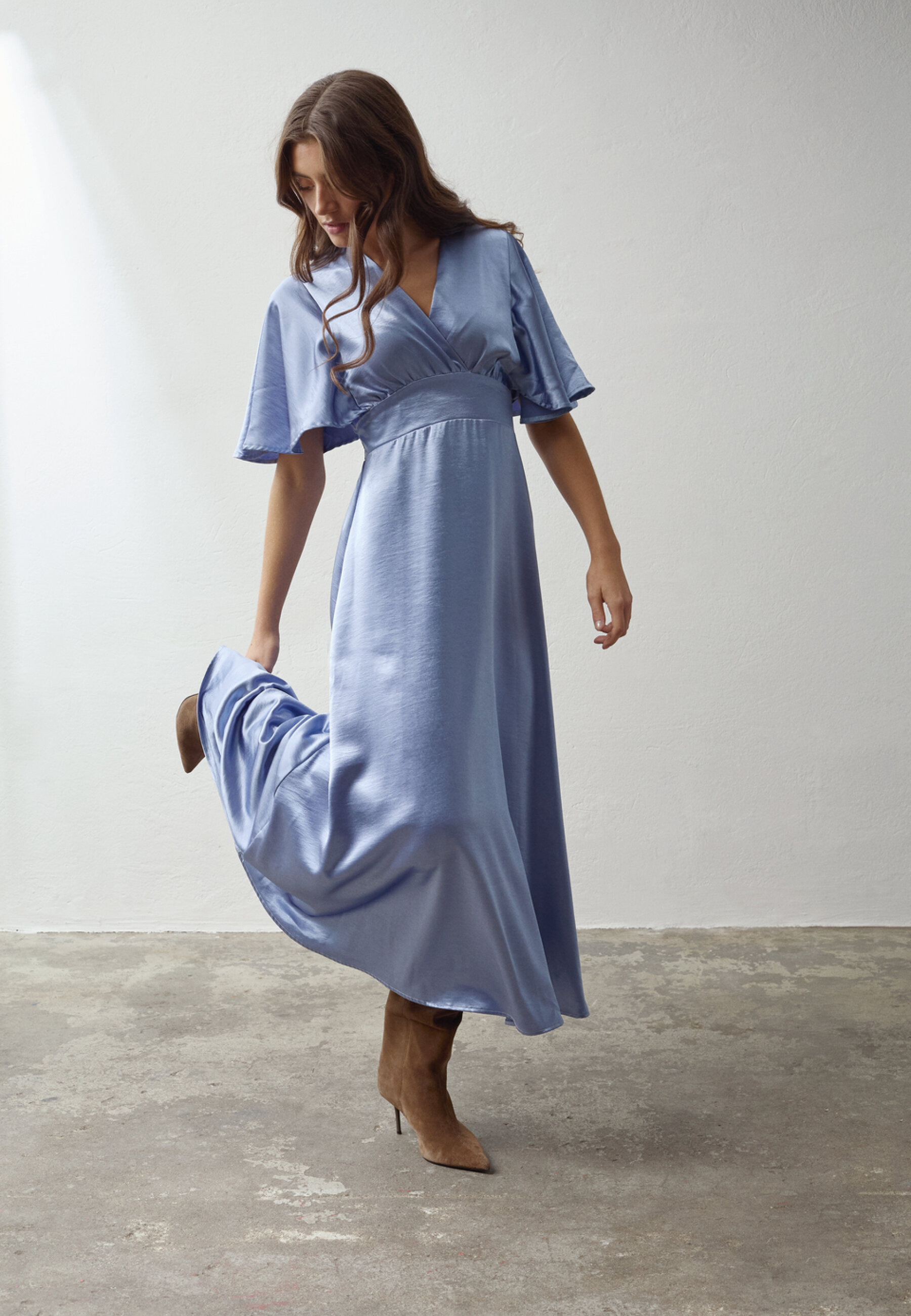 GISELA-DR16 er en elegant, lang kjole i en glat, skinnende kvalitet. Kjolen har en flatterende V-halsudskæring med slå-om-effekt, korte flagermusærmer og en bred linning i taljen, der giver en smuk silhuet. Modellen har en str. S på
