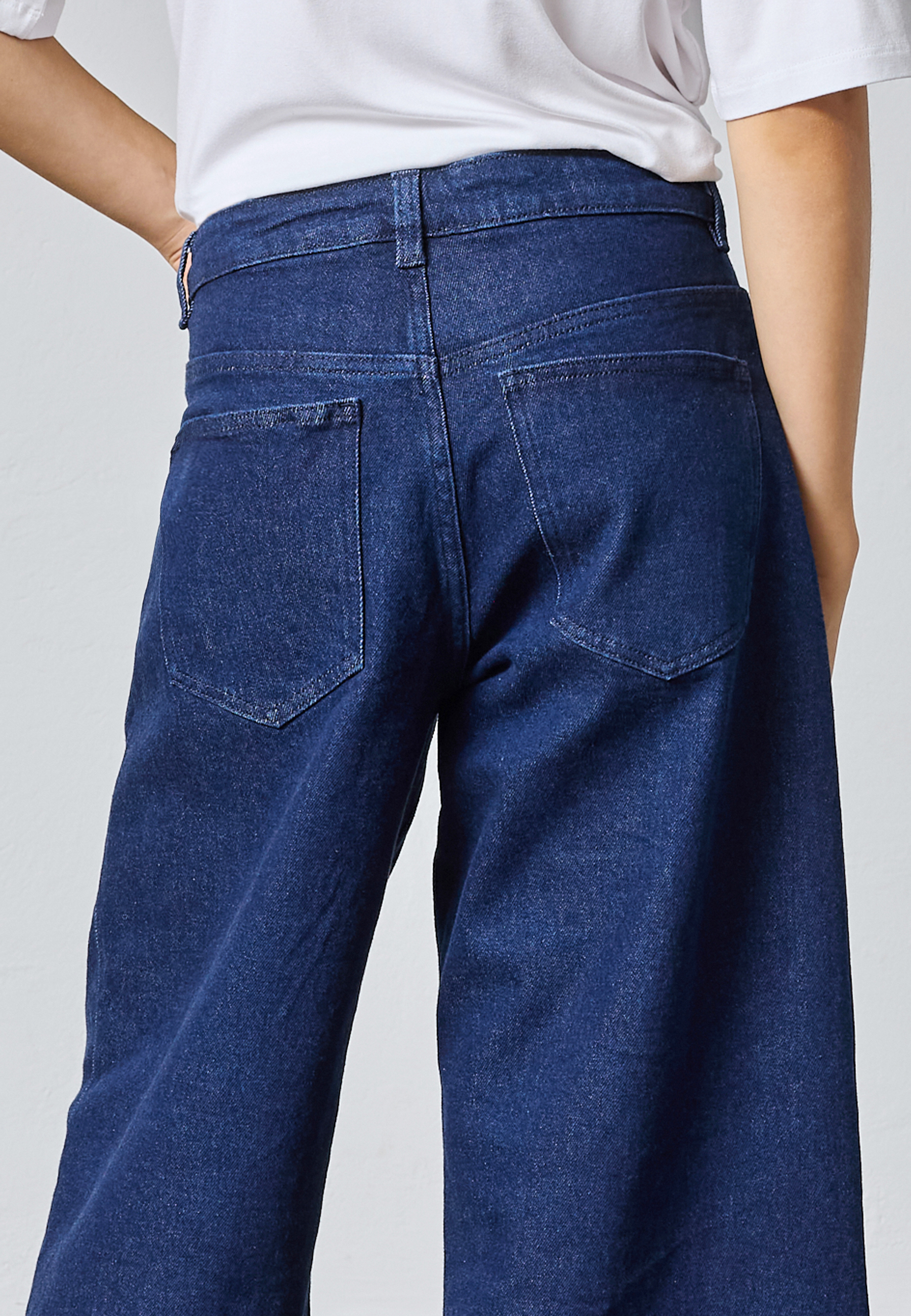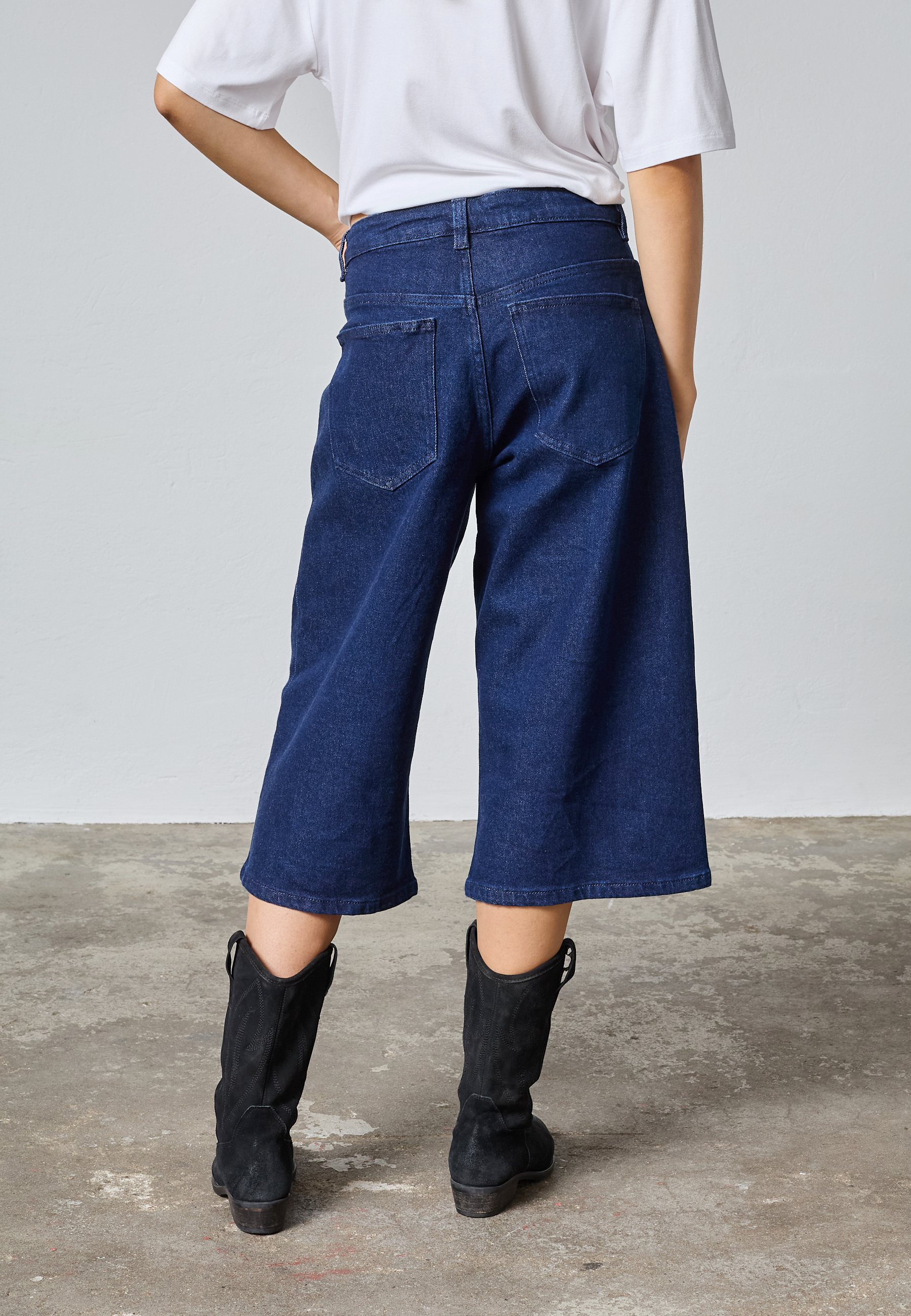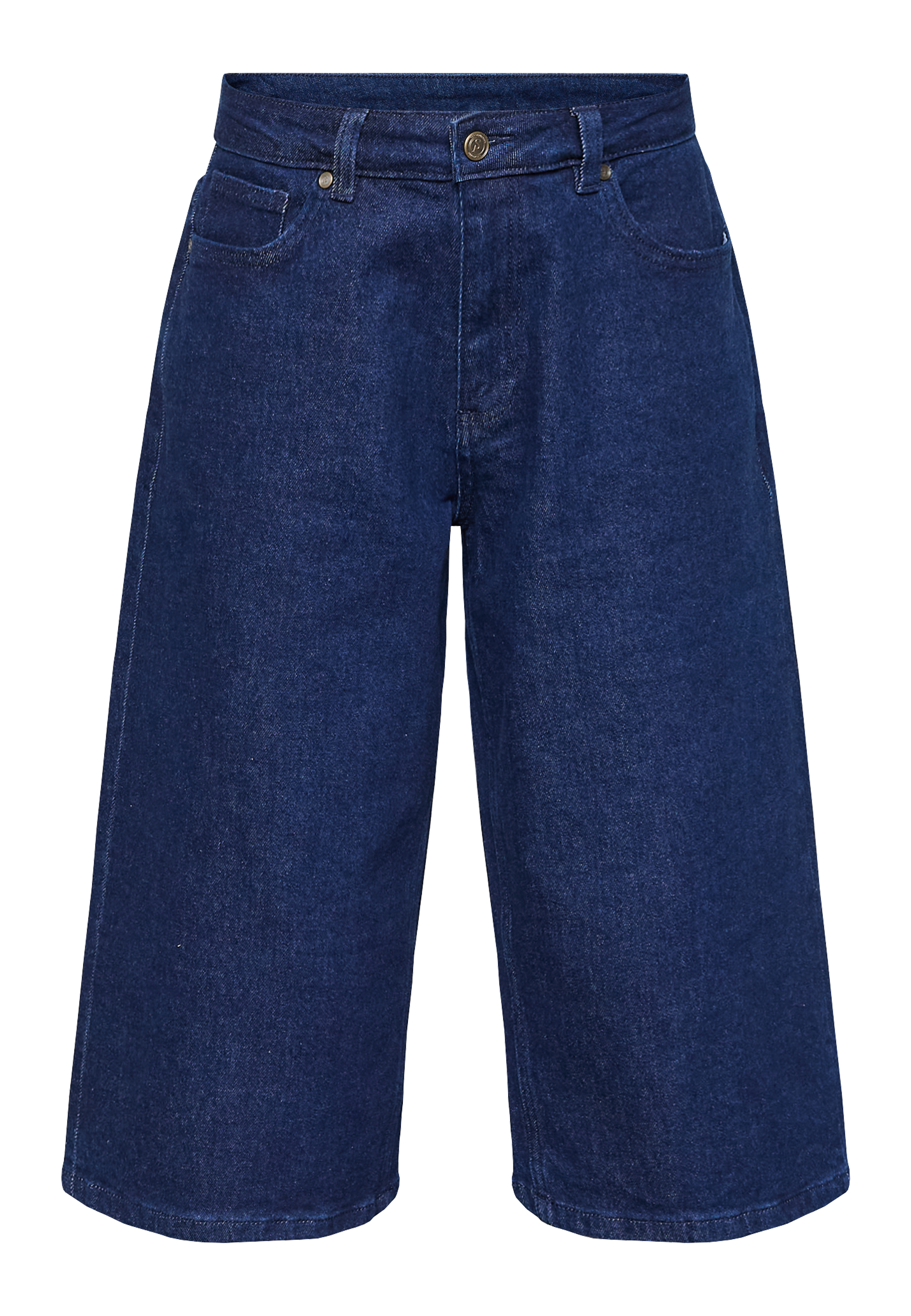 OLINA-JE1 er et par lange shorts med en bred pasform og lige ben. De har en mid-waist pasform med lynlås, knaplukning og har baglommer. Modellen har en str. S på