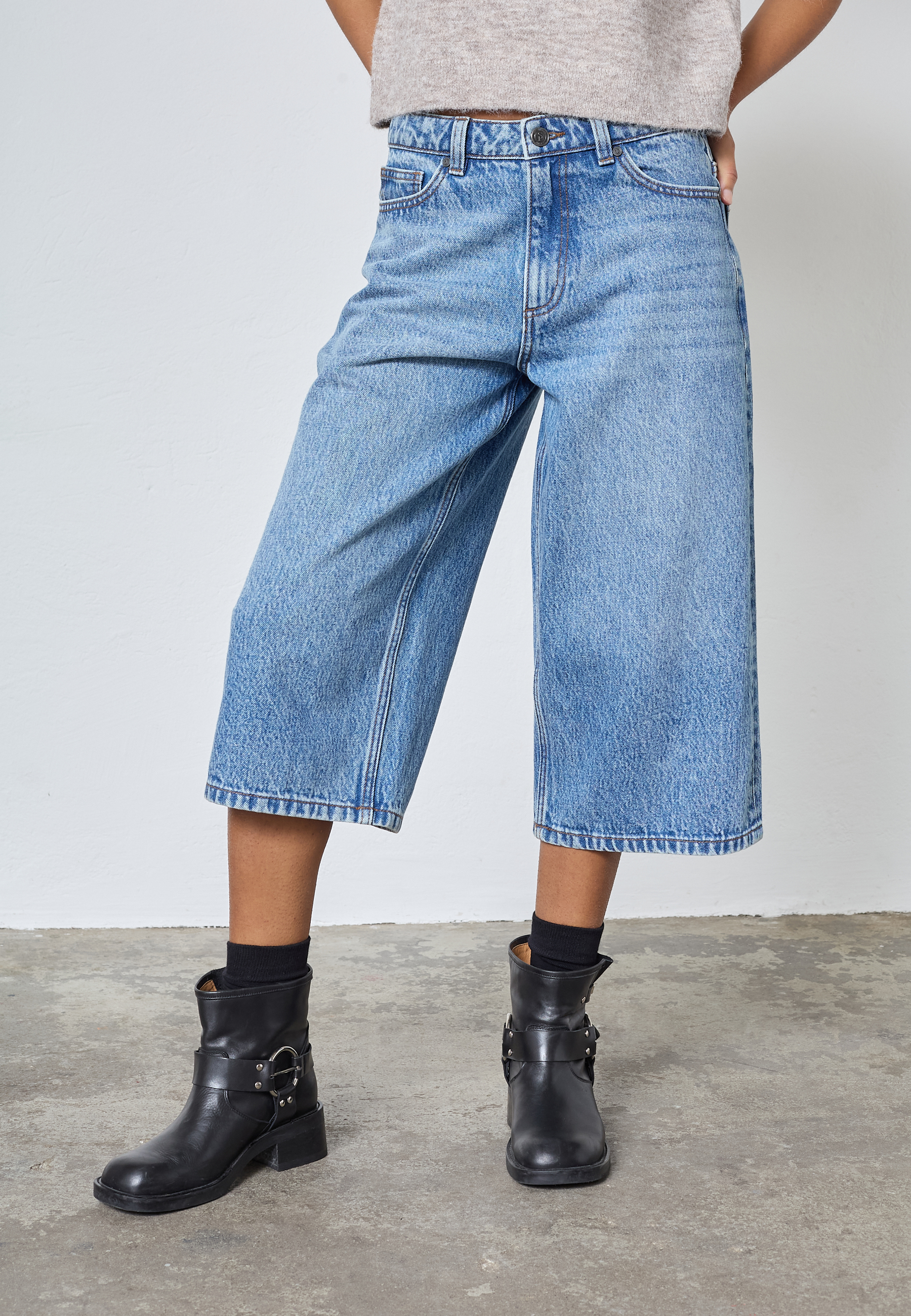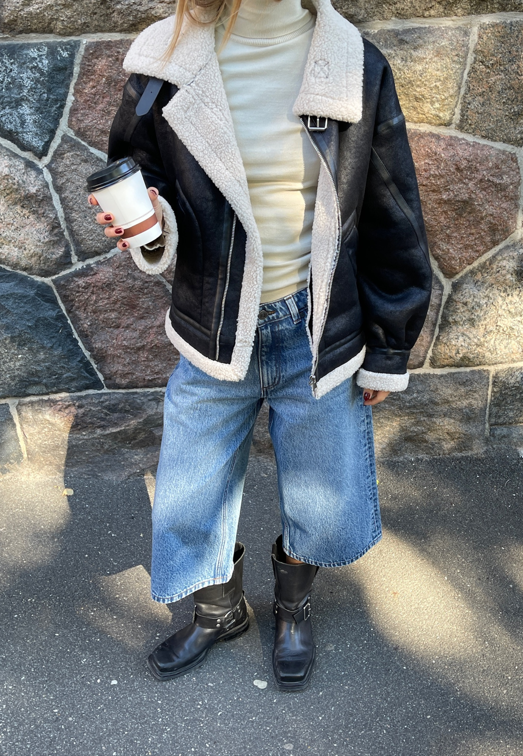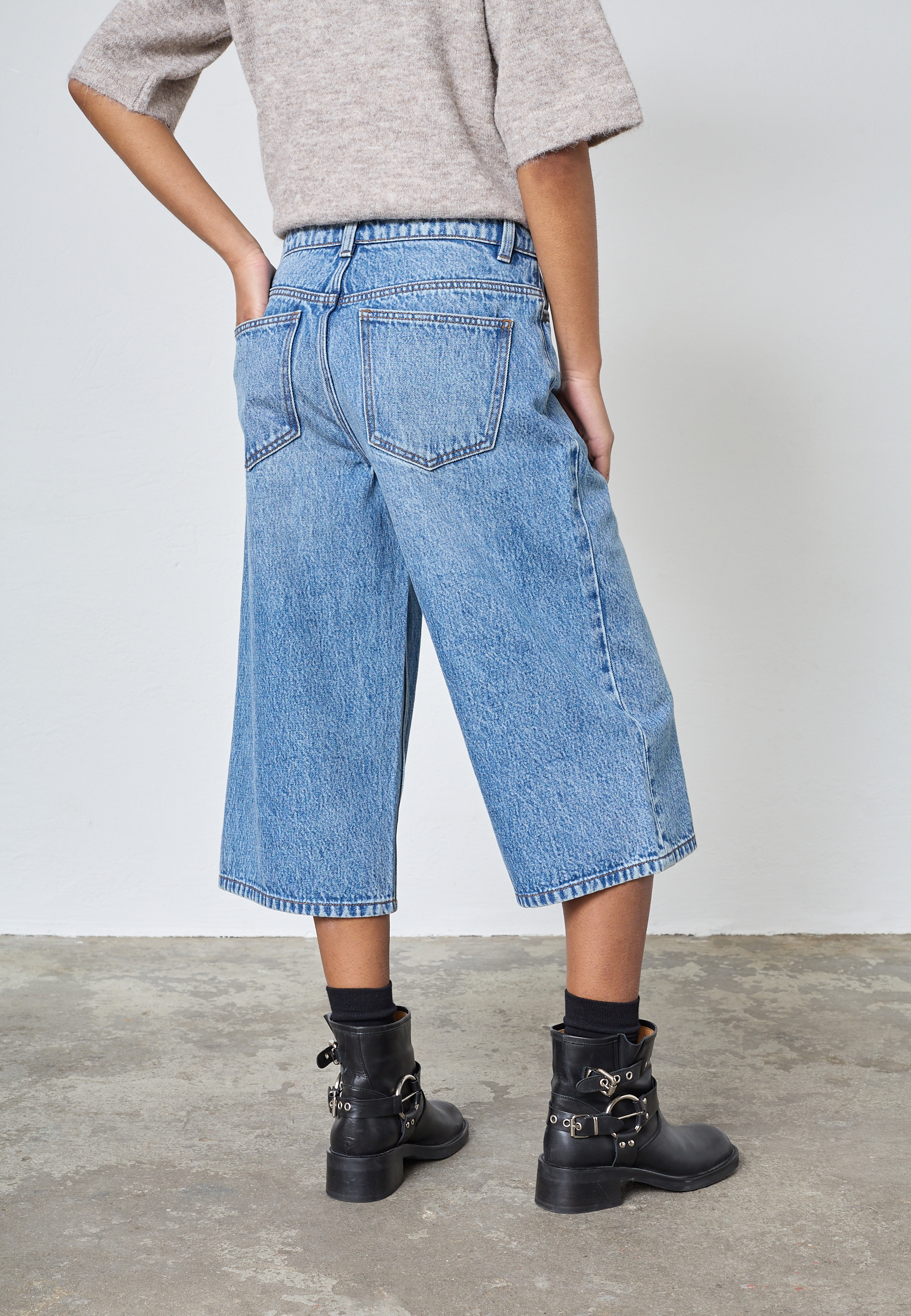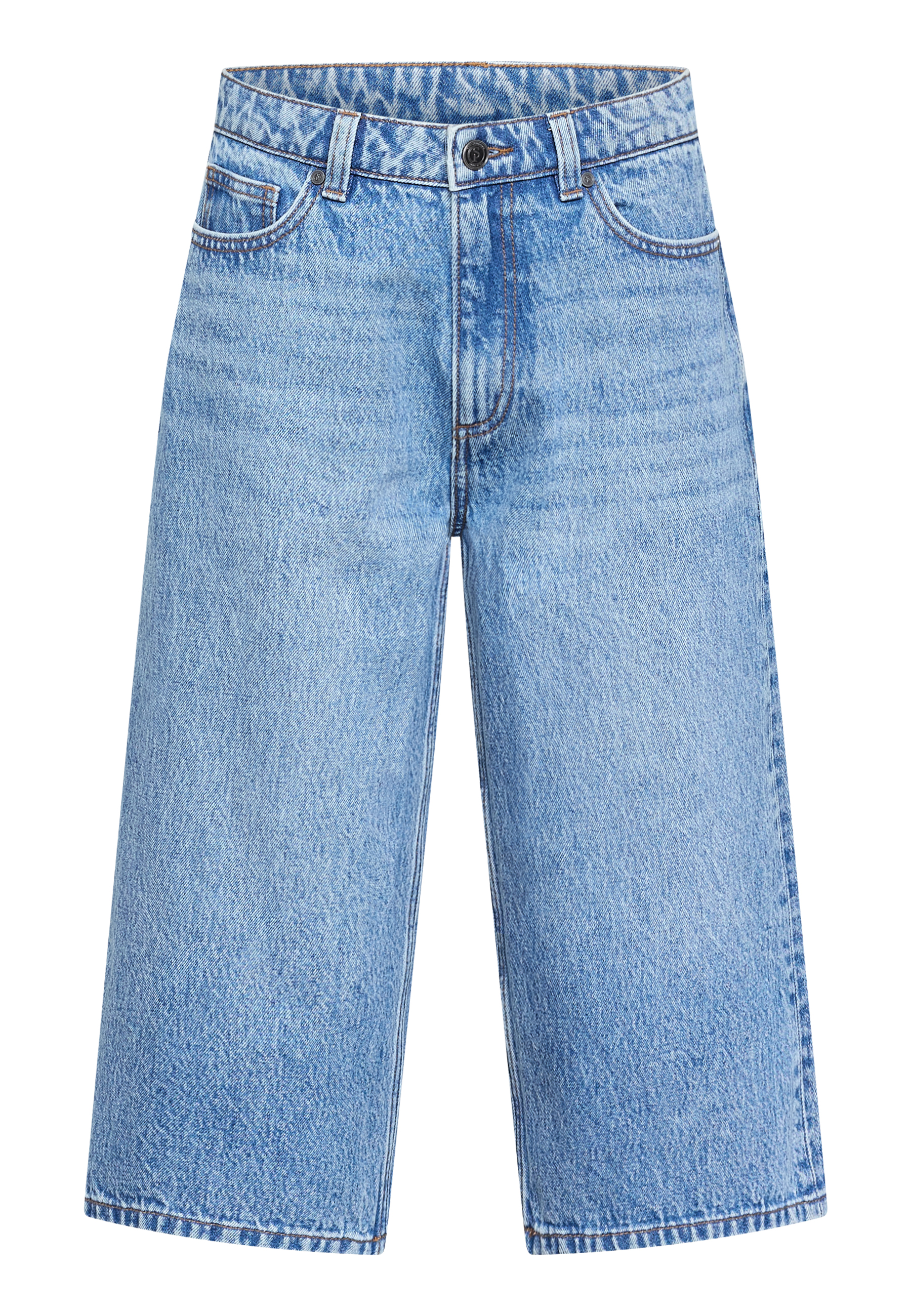 OLINA-JE er et par lange shorts med en bred pasform og lige ben. De har en mid-waist pasform med lynlås, knaplukning og har baglommer. Modellen har en str. S på.