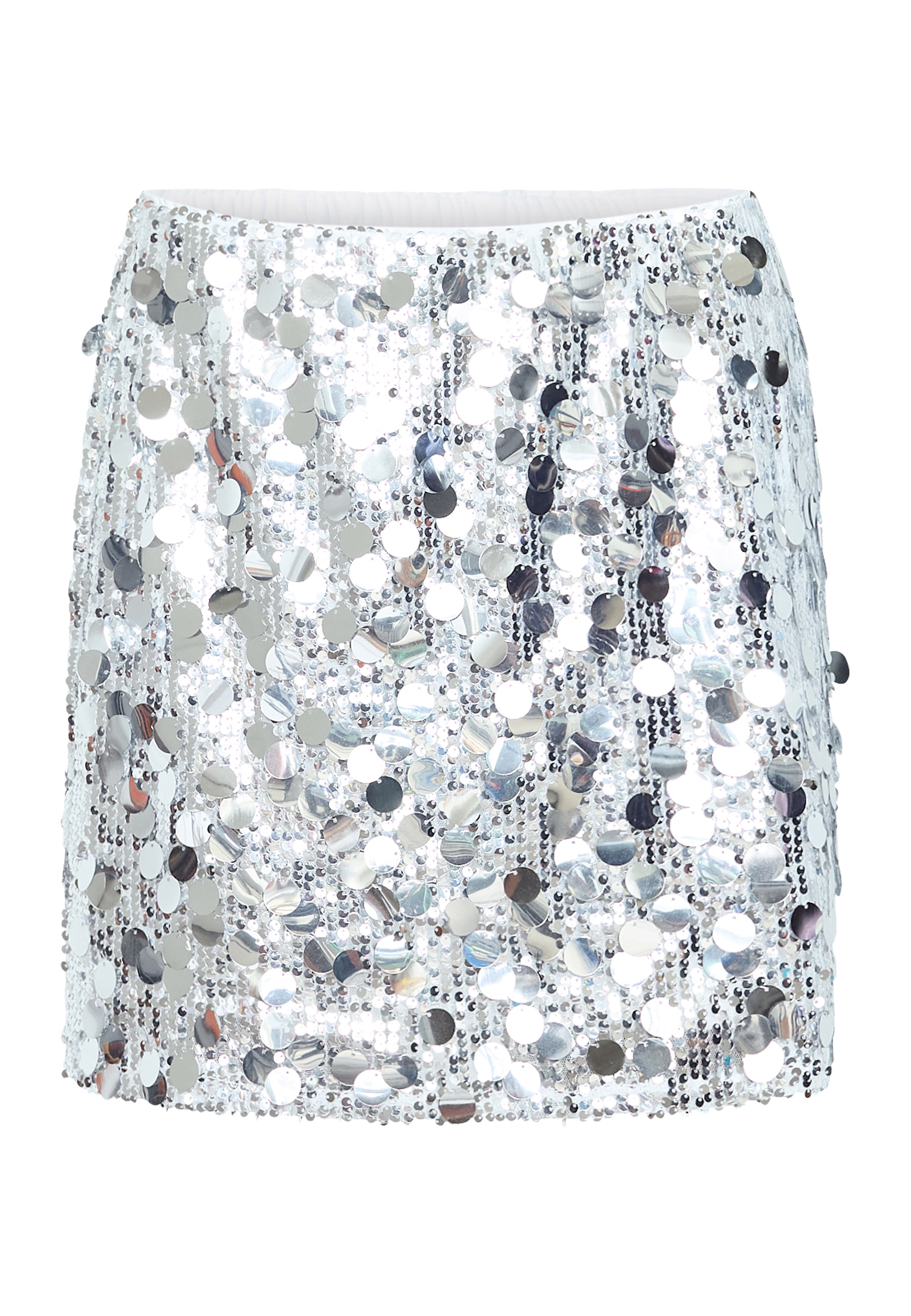 GAVEA-S.SK er en kort mininederdel. Nederdelen er dækket af skinnende pailletter i forskellige størrelser, som overlapper hinanden og skaber en tekstureret overflade, der reflekterer lys. Modellen har en str. S på.