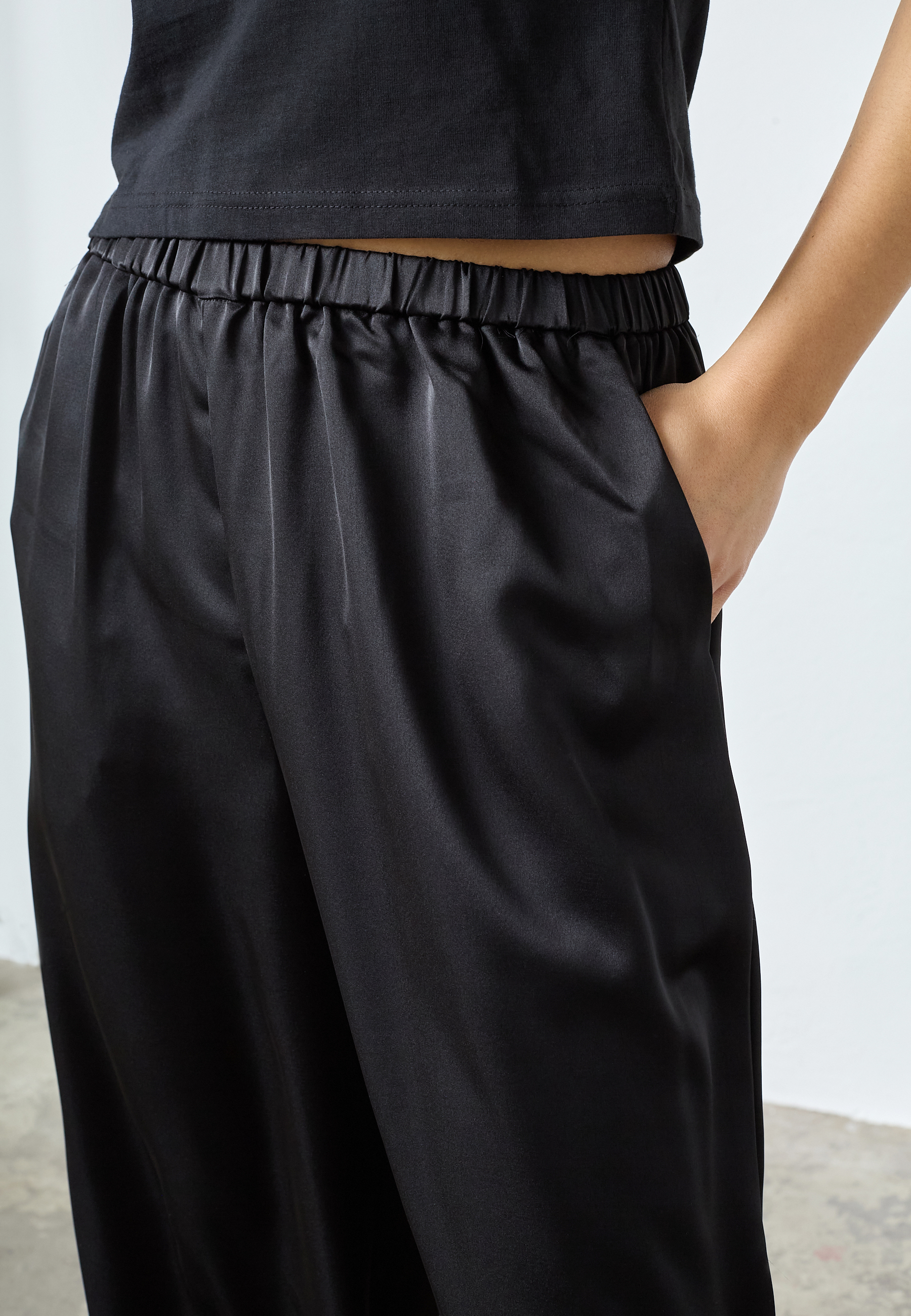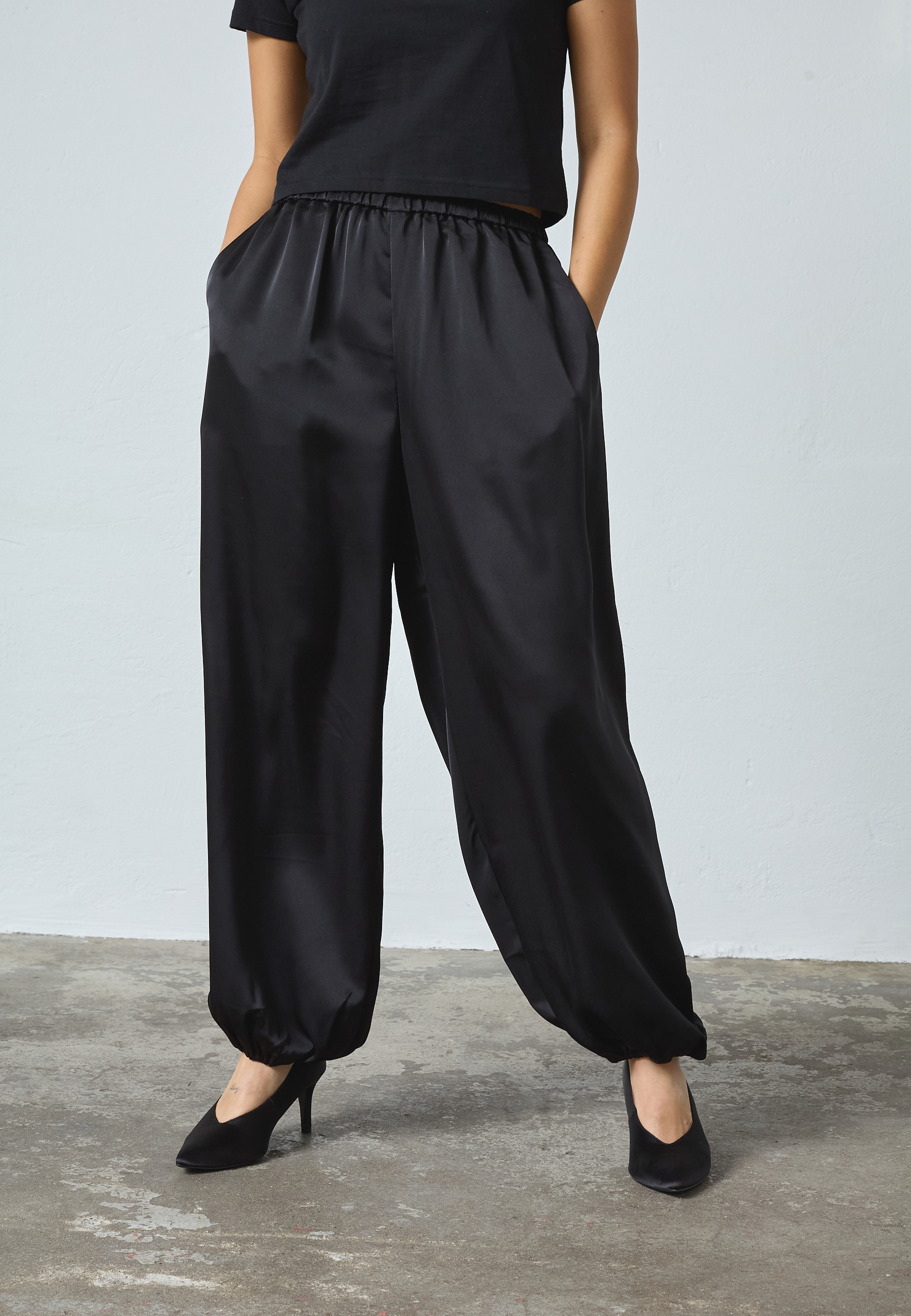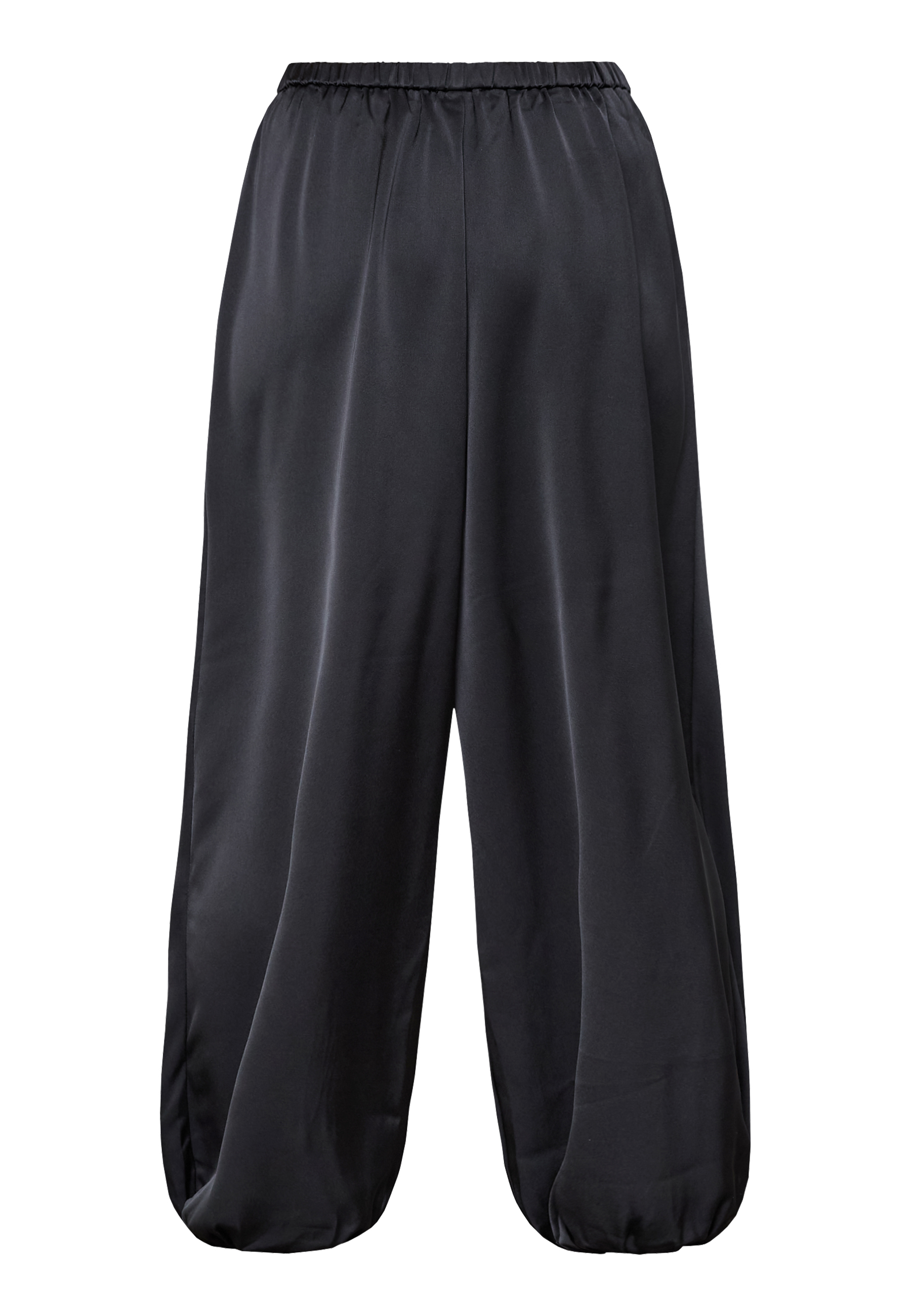 GEWO-PA1 er et par bukser er i et glat, skinnende materiale med en elastisk linning i taljen. De har en voluminøs, afslappet silhuet med sidelommer og er afsluttet med et elastikbånd ved anklen for en ballonformet effekt. Modellen er str. S