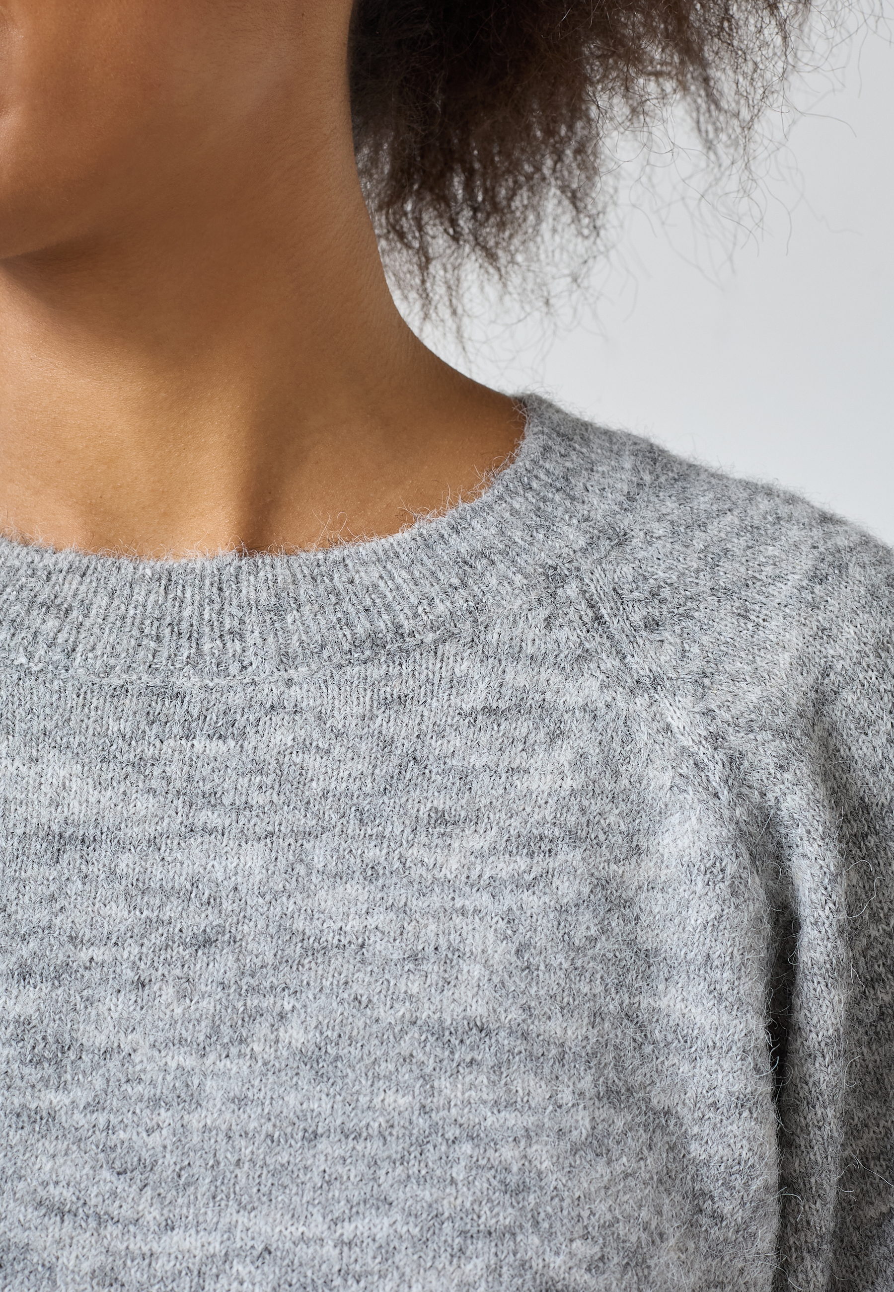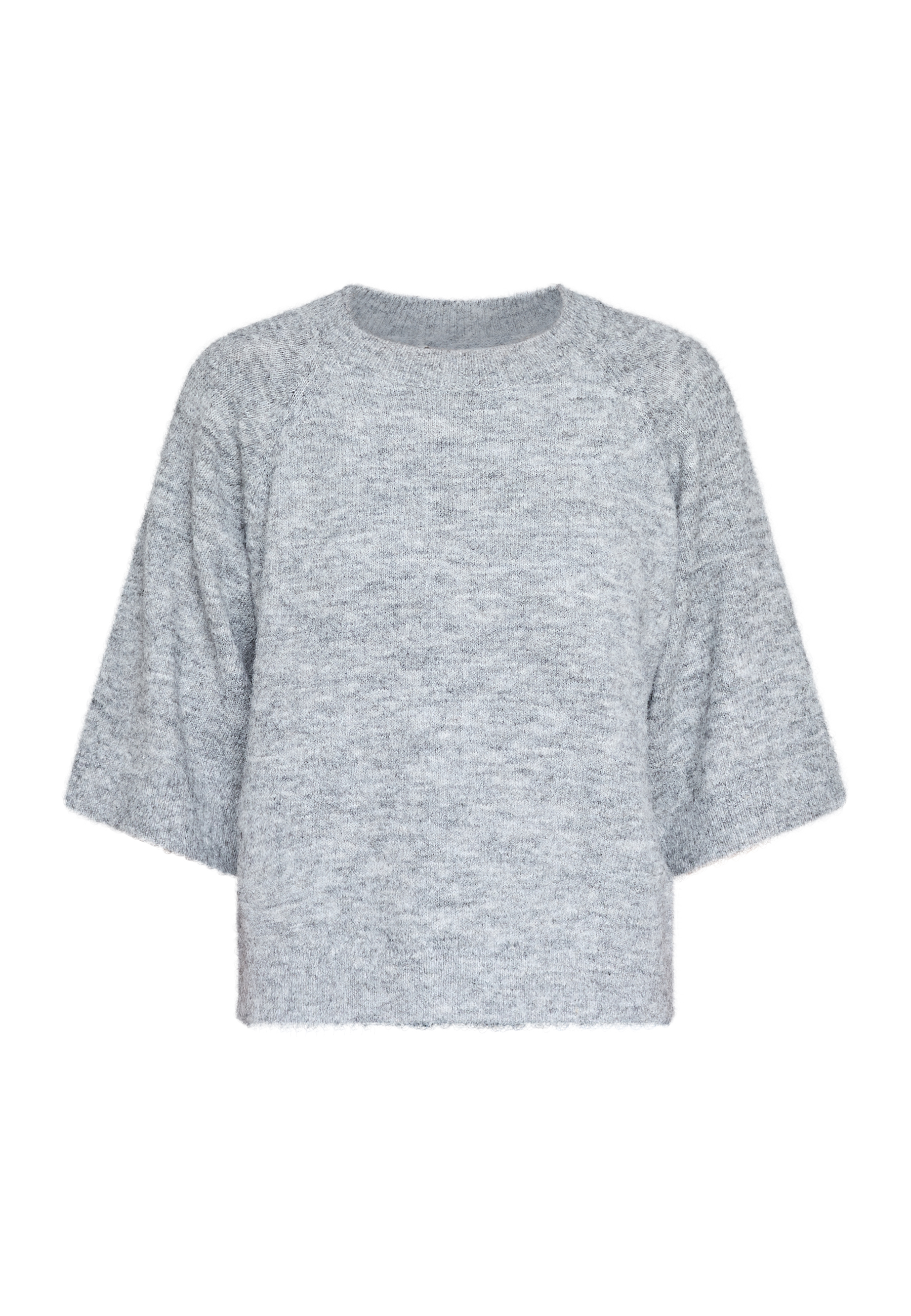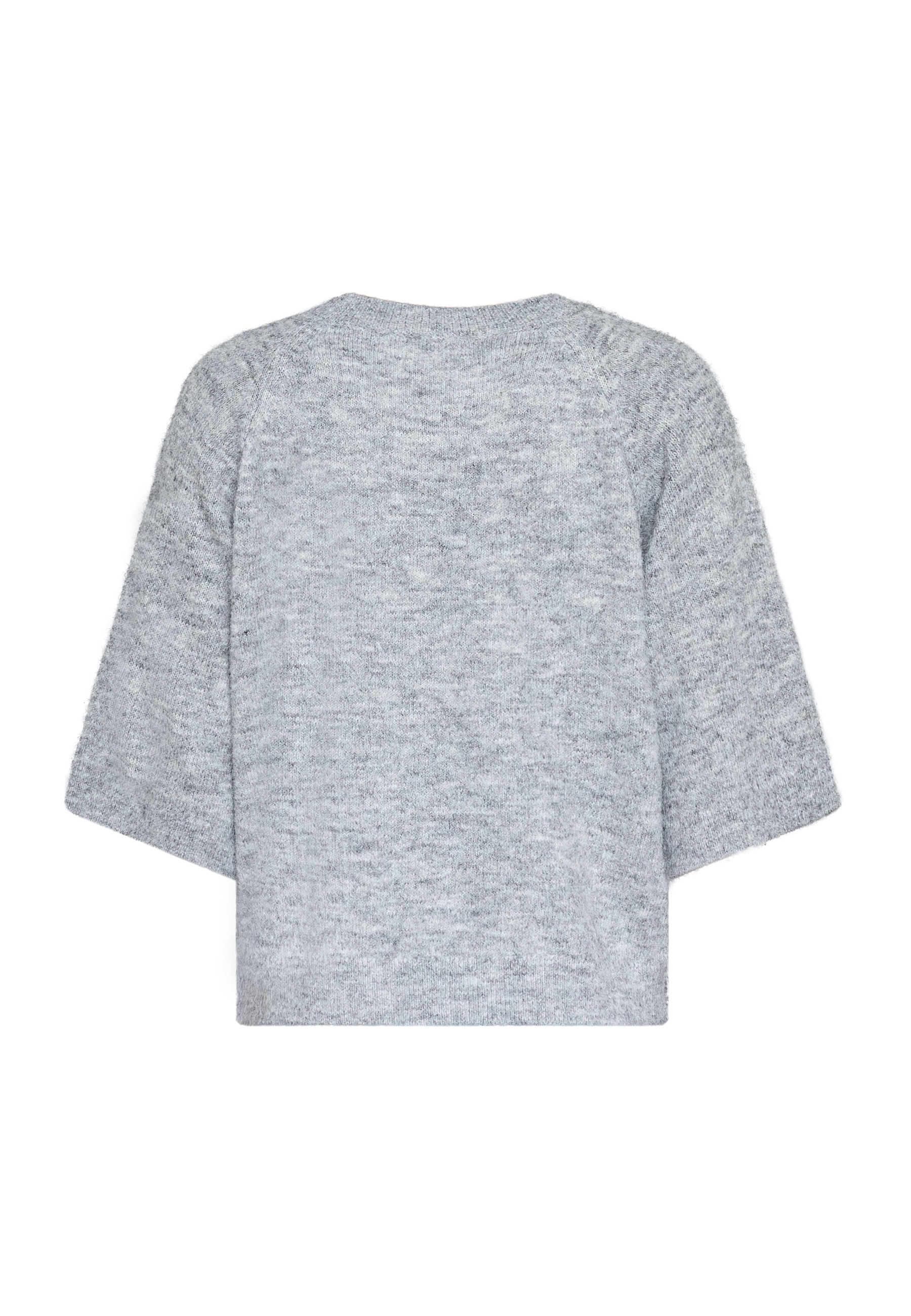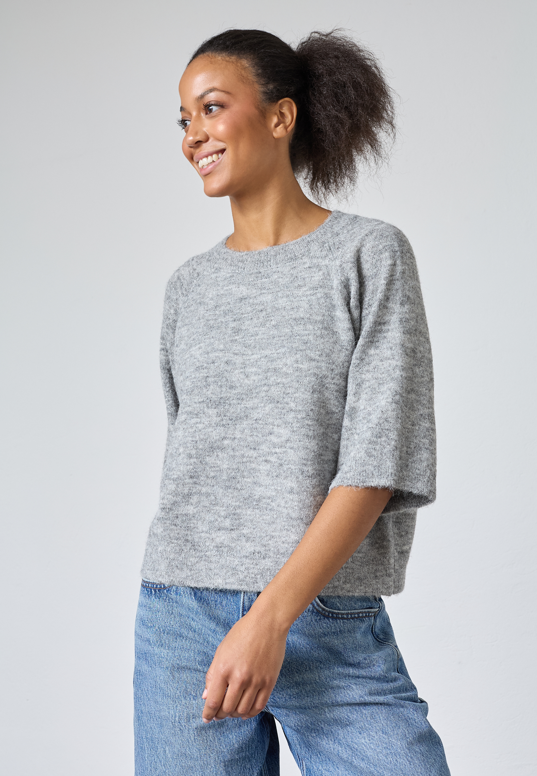 KAPPO-PU er en striktrøje i et blødt, meleret garn og har en kort, let facon. Den er designet med vidde i kroppen, en rund halsudskæring og trekvartlange ærmer. Modellen har en str. S på.