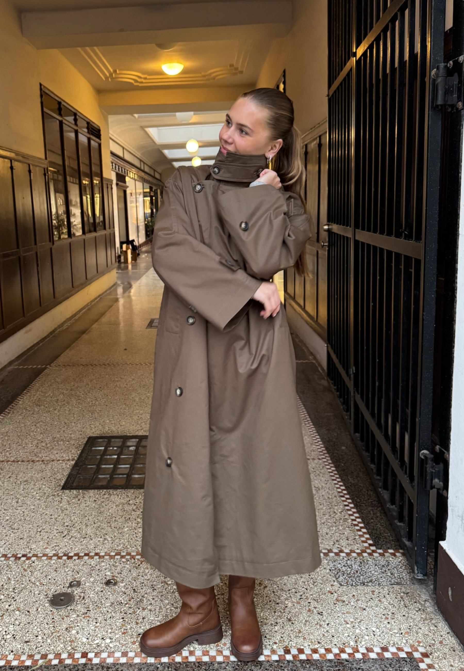 DAR-N.TRENCH1 er en trendy lang og oversized trenchcoat. Jakken har to lommer, en knappelukning og en høj hals, med en aftagelig knappelukning. Modellen har en størrelse S på.