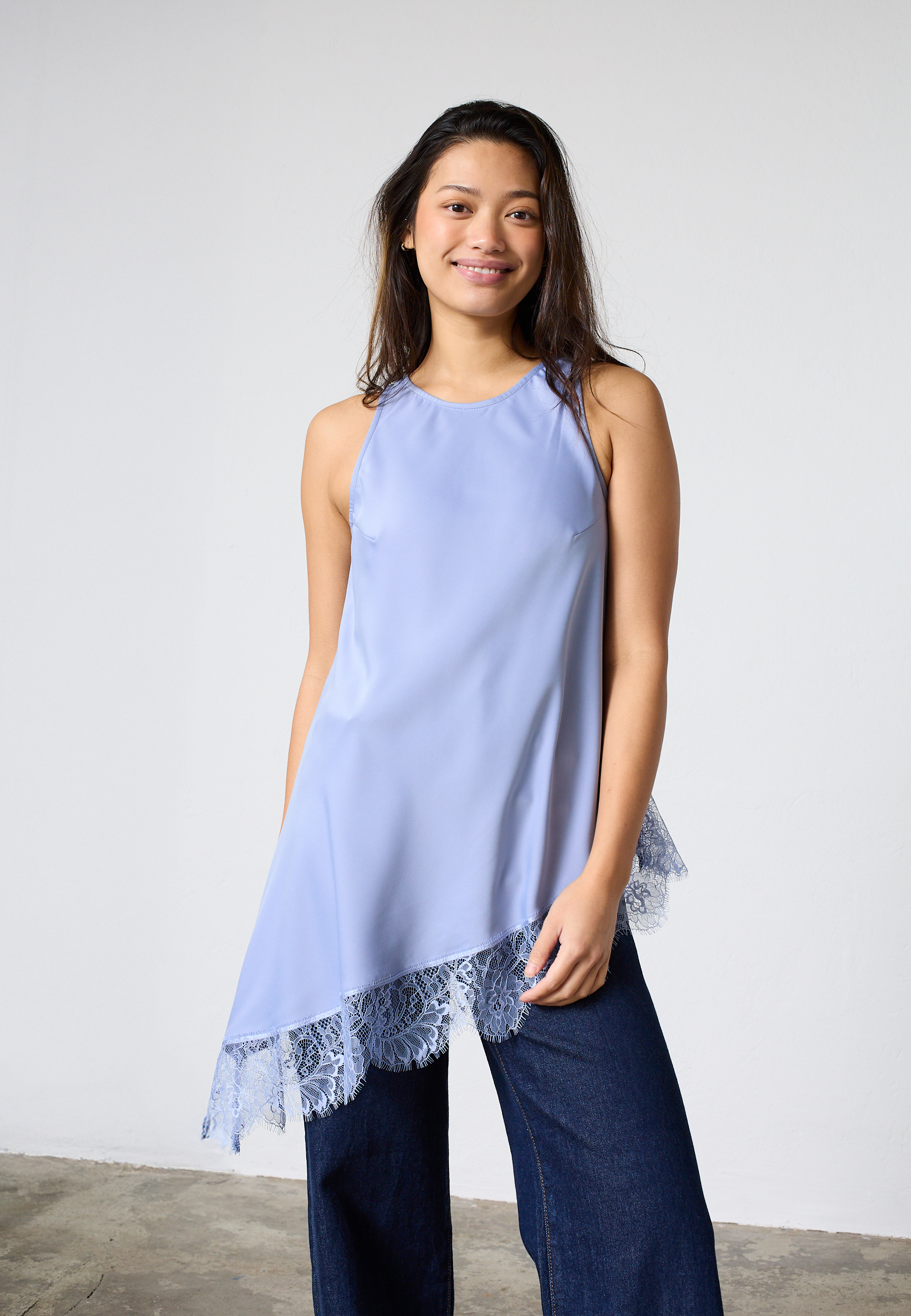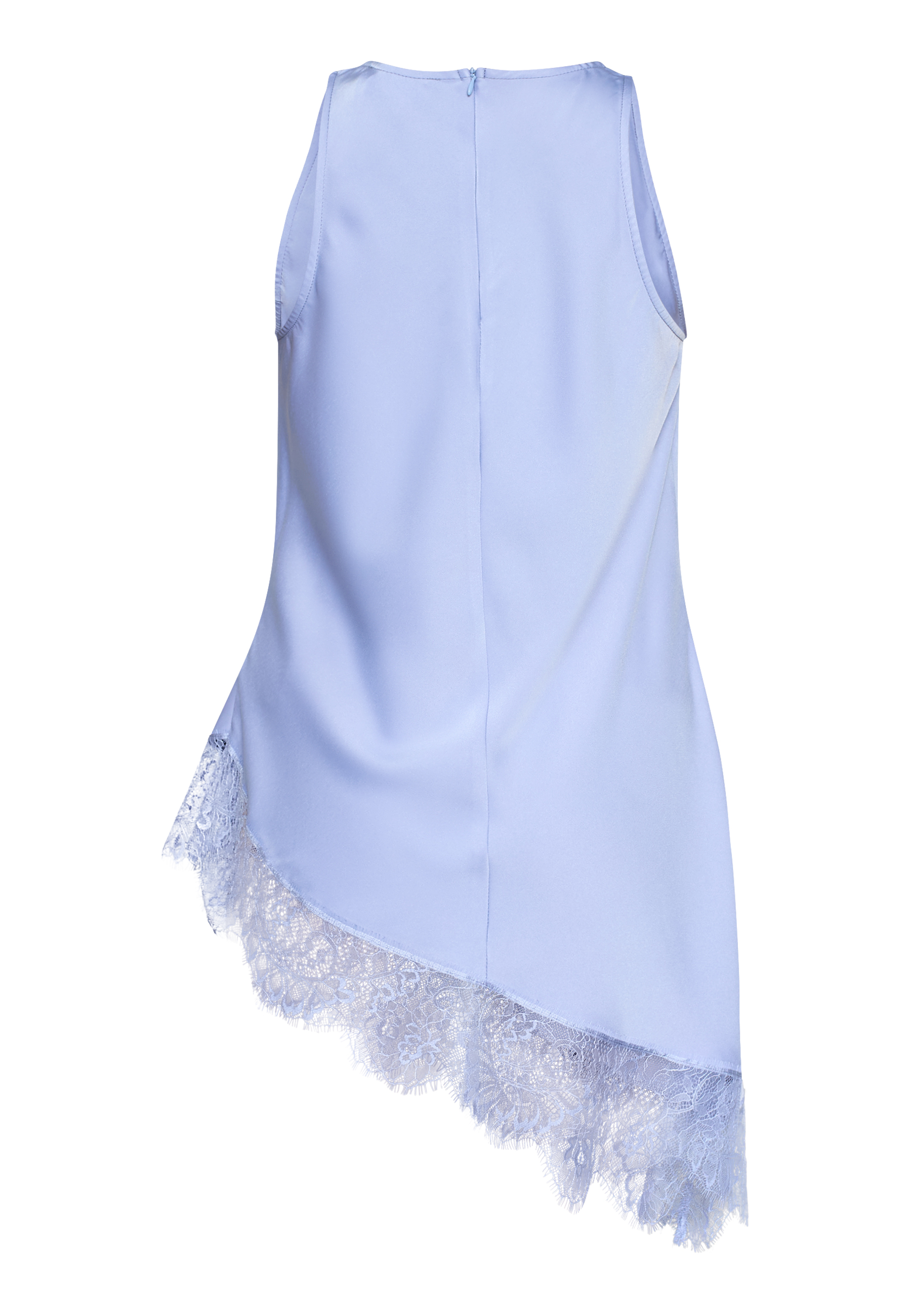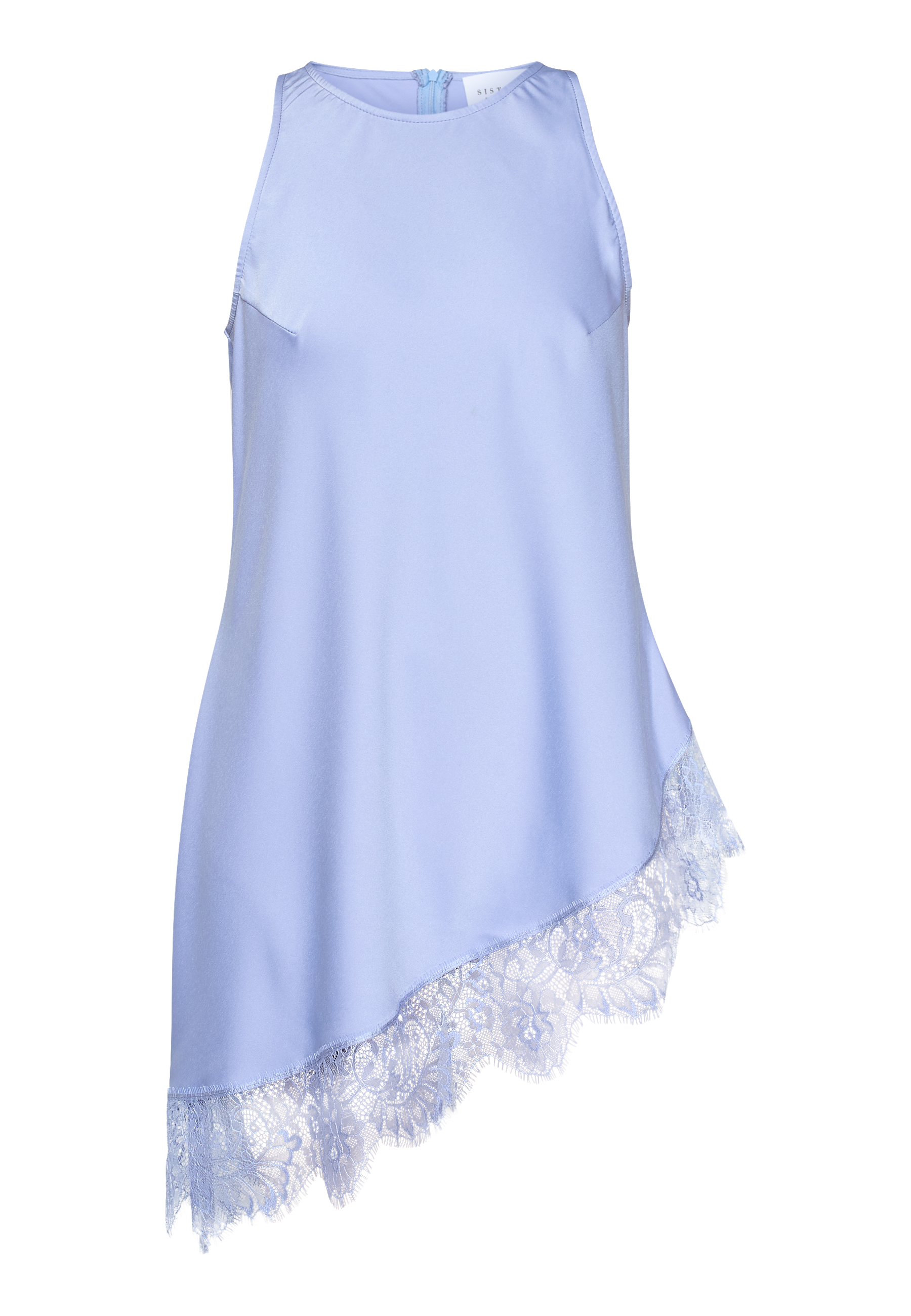 VIOL-TA er en top i satin-look med minimalistisk rund hals og ingen ærmer. Den har et asymmetrisk snit i bunden, dekoreret med delikat blondekant. Modellen har en str. S på og er 171 cm høj.