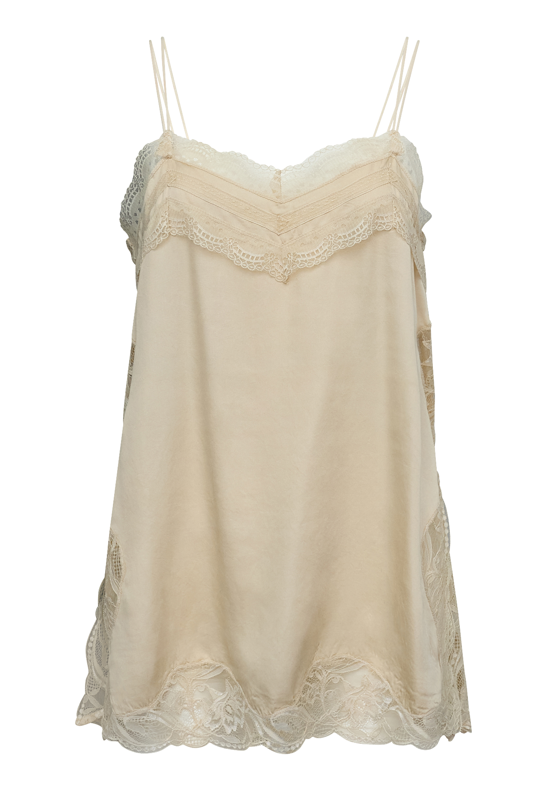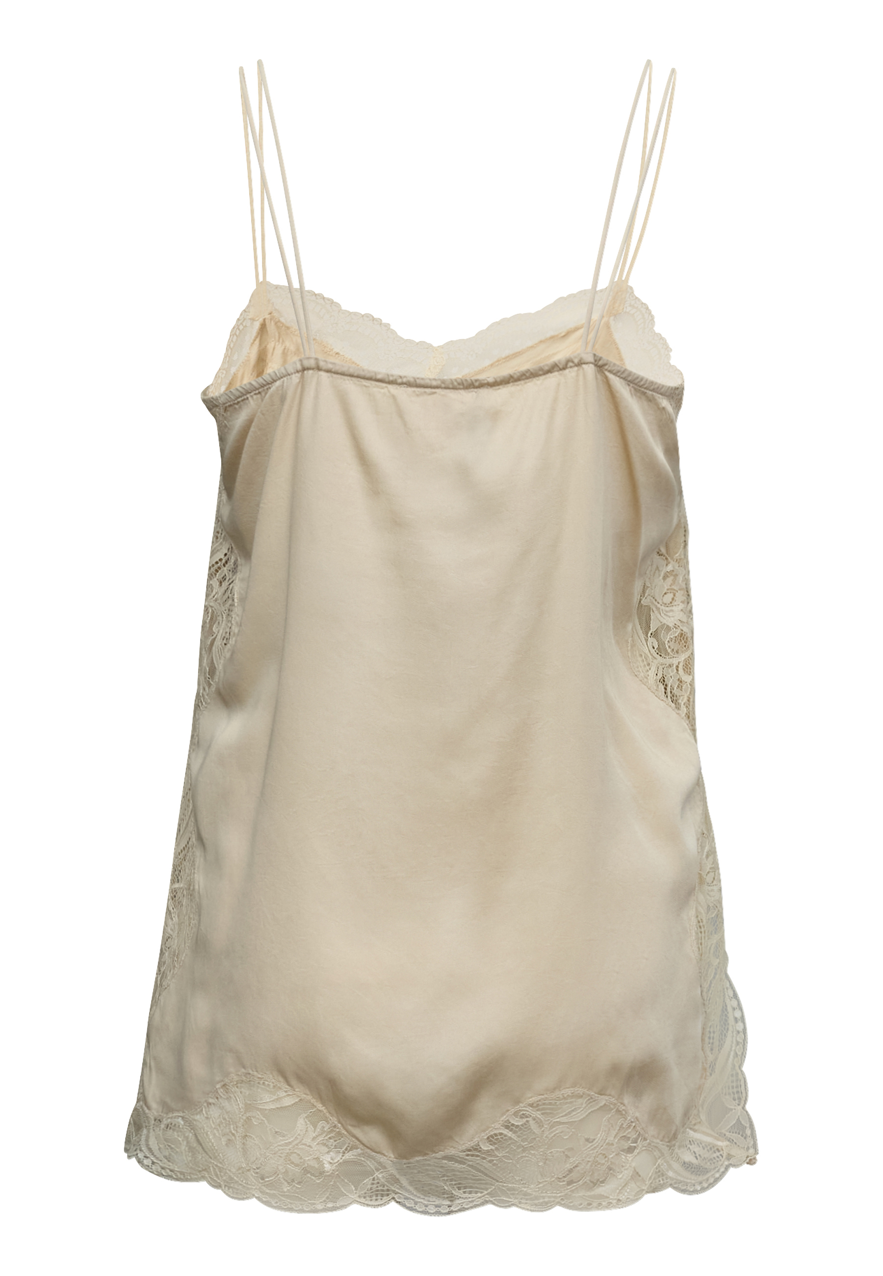 ISOLDE-ST er en eksklusive satin-top som er detaljeret med en smuk blondekant langs v-udskæringen og bunden. Toppen har tynde justerbare stropper. Modellen har en str. S på.