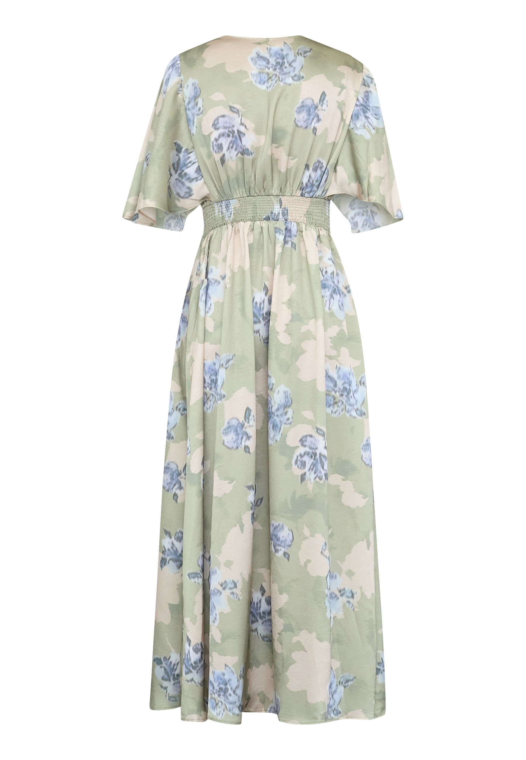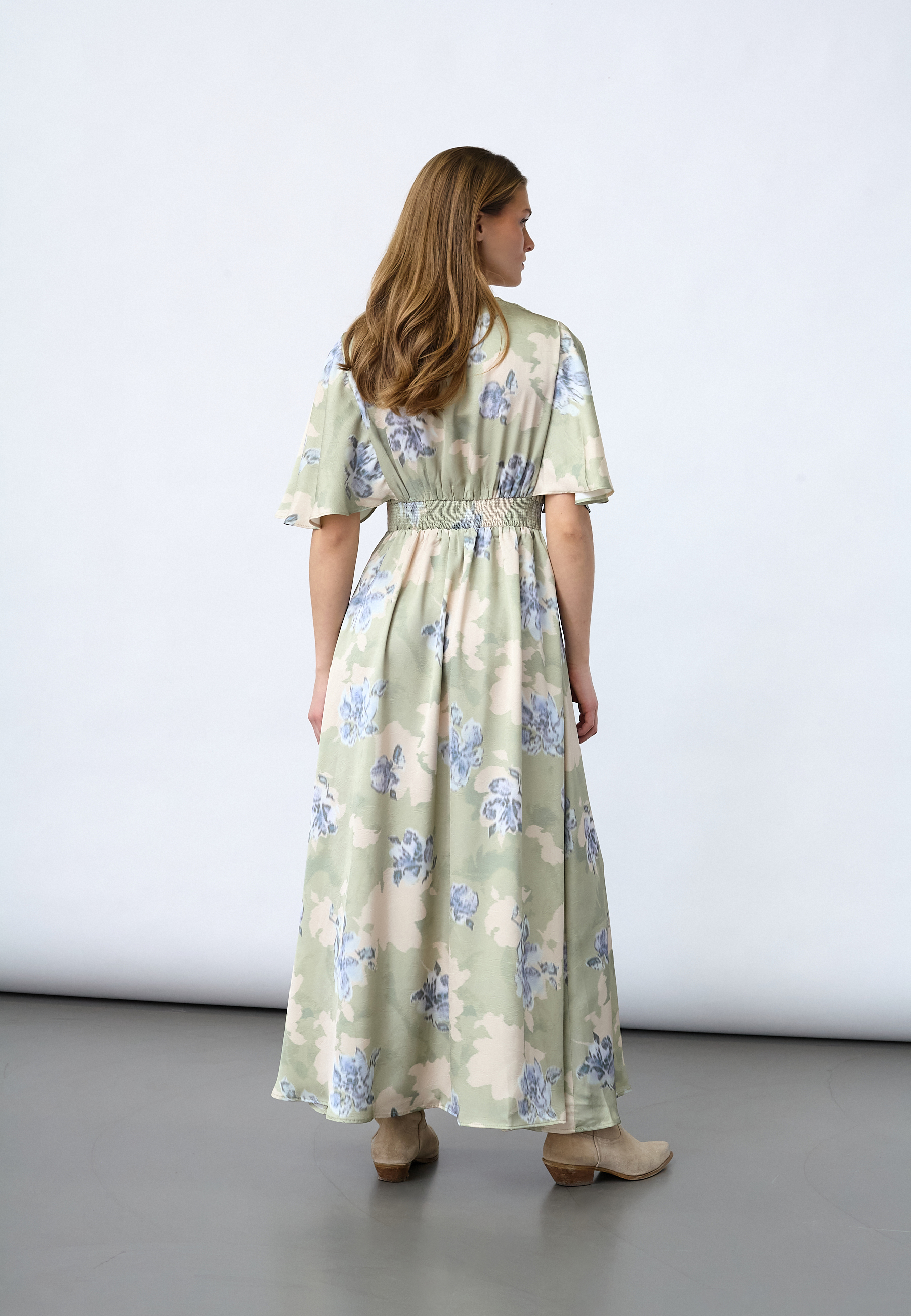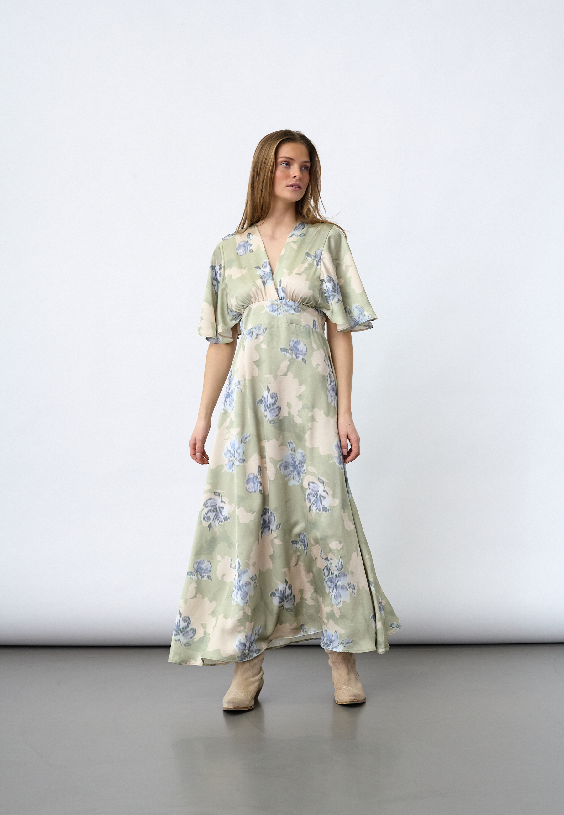 GISELA-DR26 er en lang kjole med v-udskæring og korte ærmer med vidde. Den har et mønster med blomstermotiver og en smal talje, der fremhæver silhuetten. Modellen har en str. S på og er 175 cm høj.