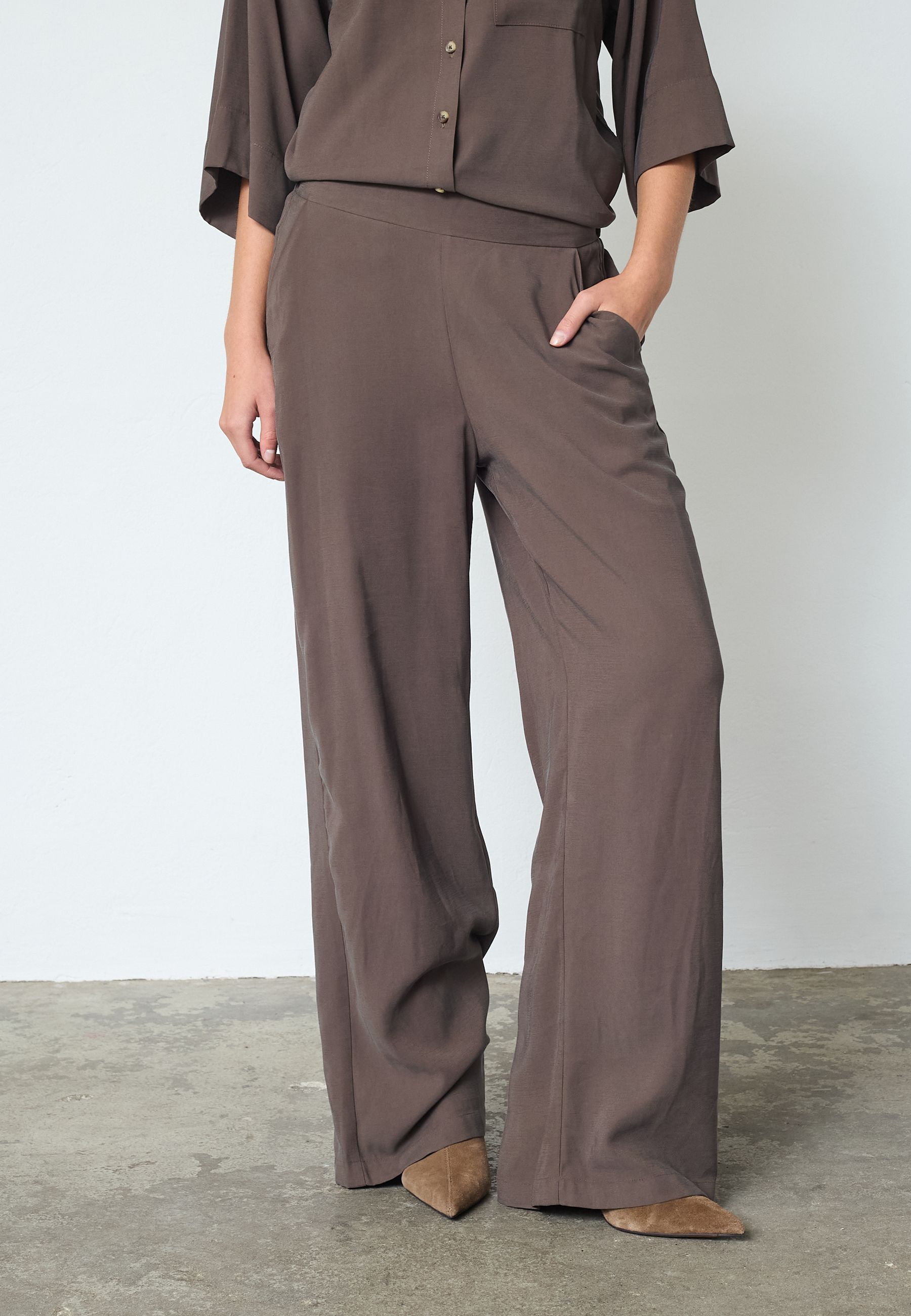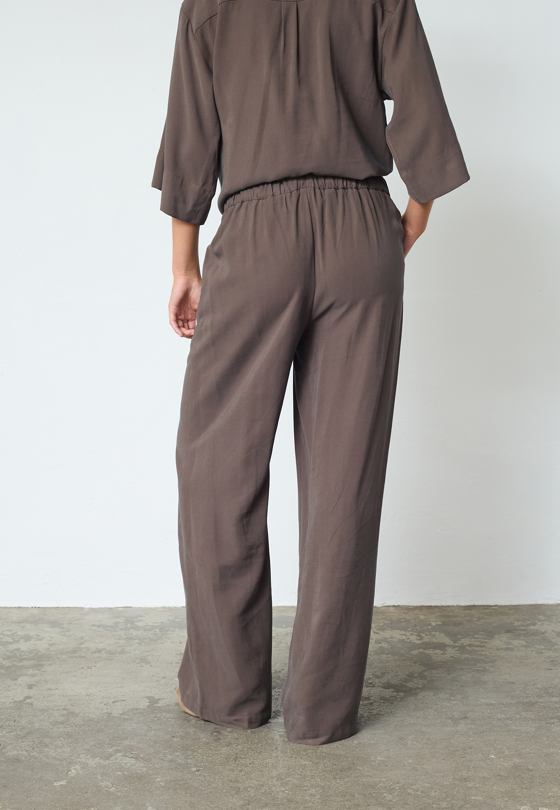 VERINA-PA1 er et par afslappede bukser med brede, lige ben. Bukserne har en elastisk linning og sidelommer. Modellen har en str. S på og er 175 cm høj.