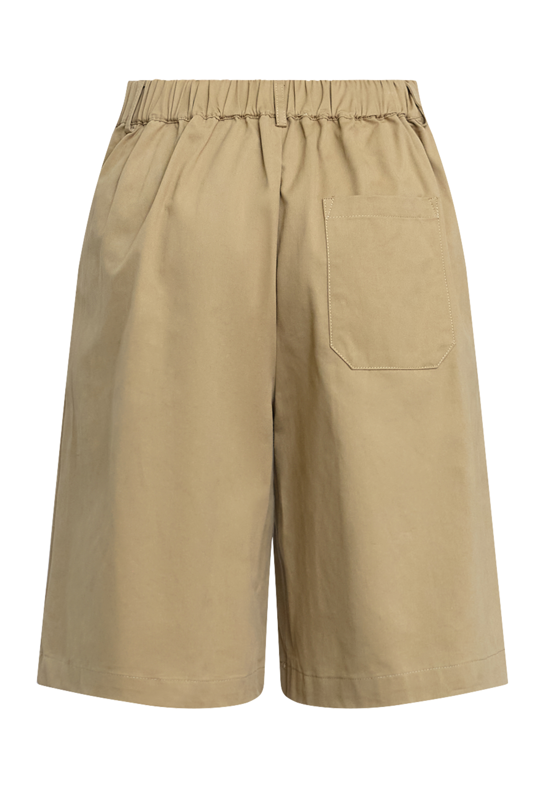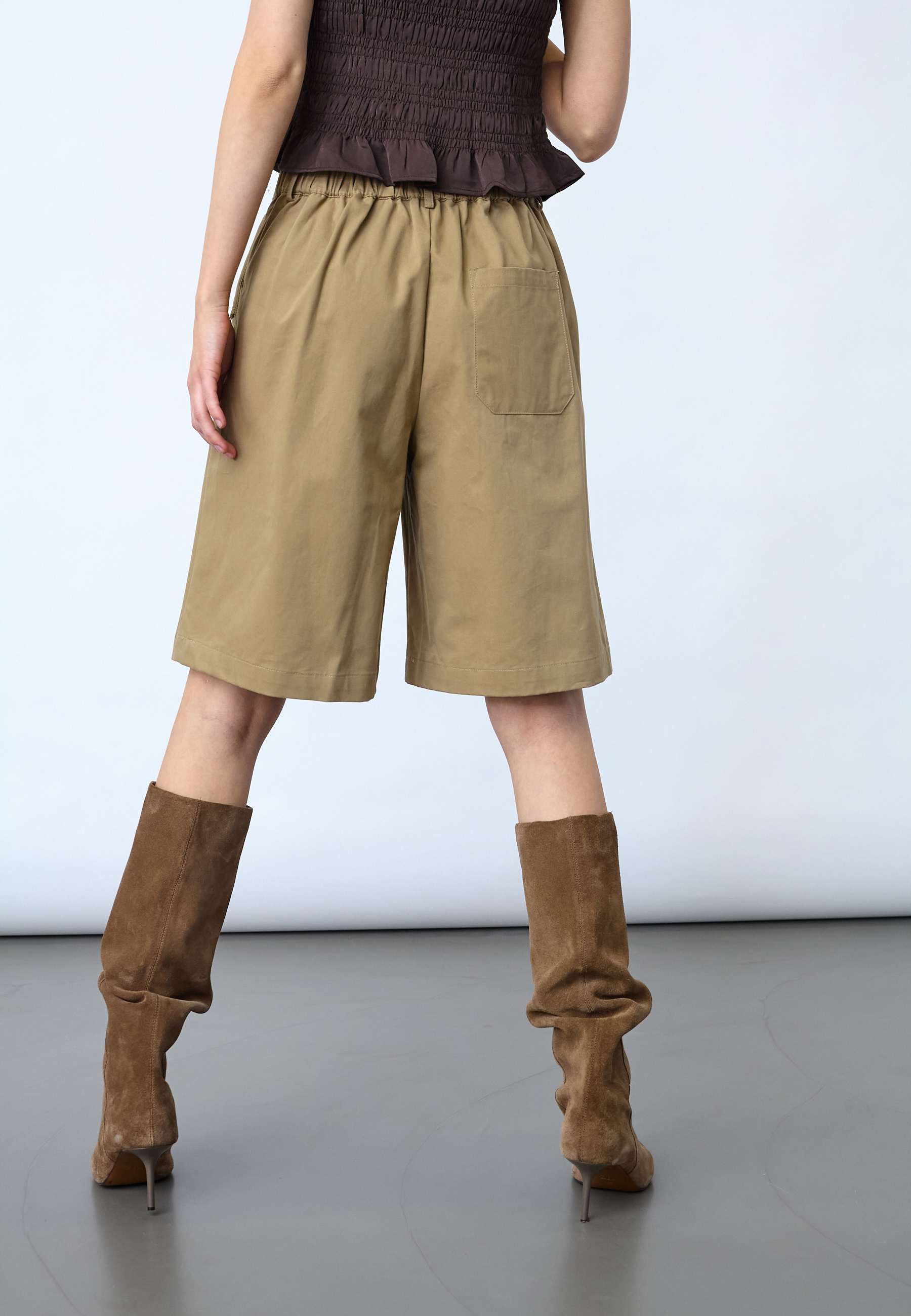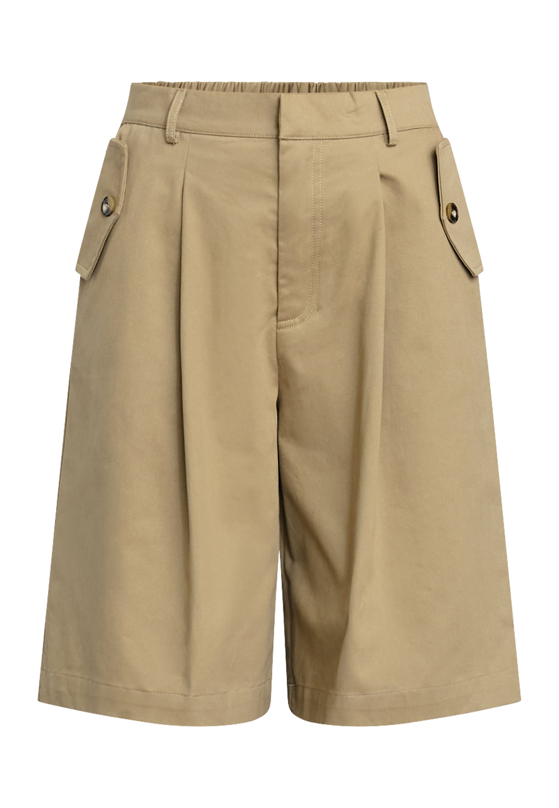 EDITH-SHO er et par elegante high-waist bermudashorts i et tailored fit med pleats og sofistikerede knapdetaljer. Modellen har en str. S på.