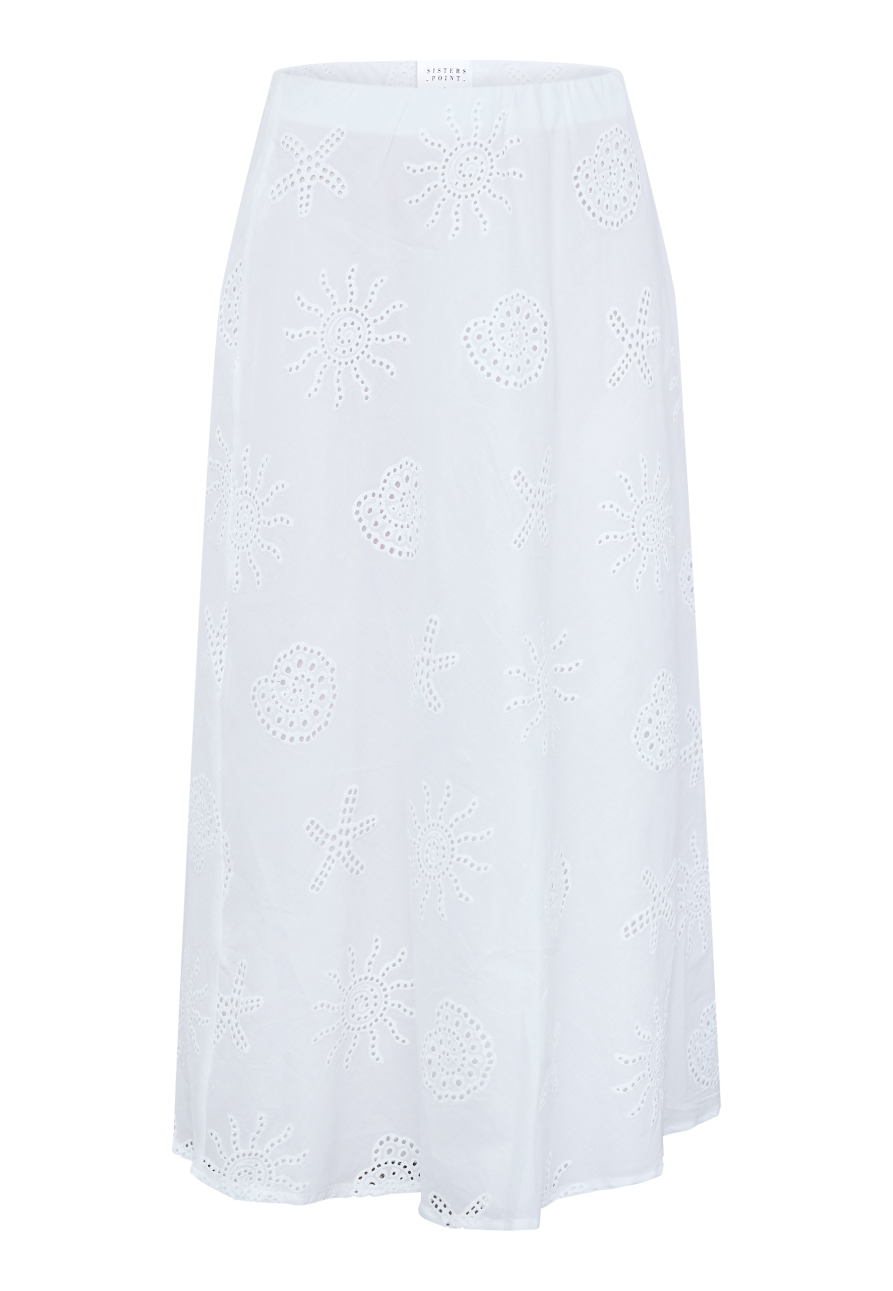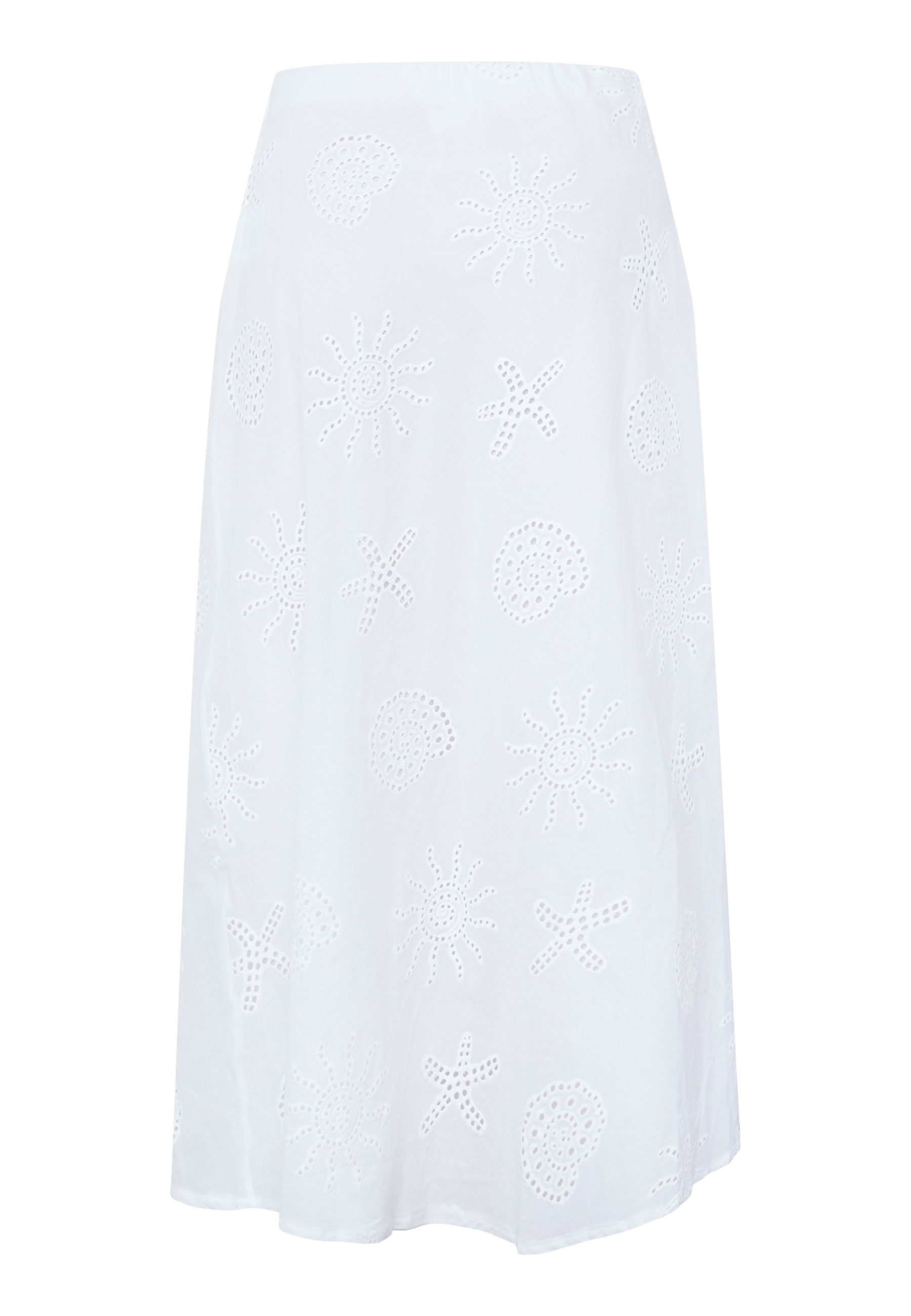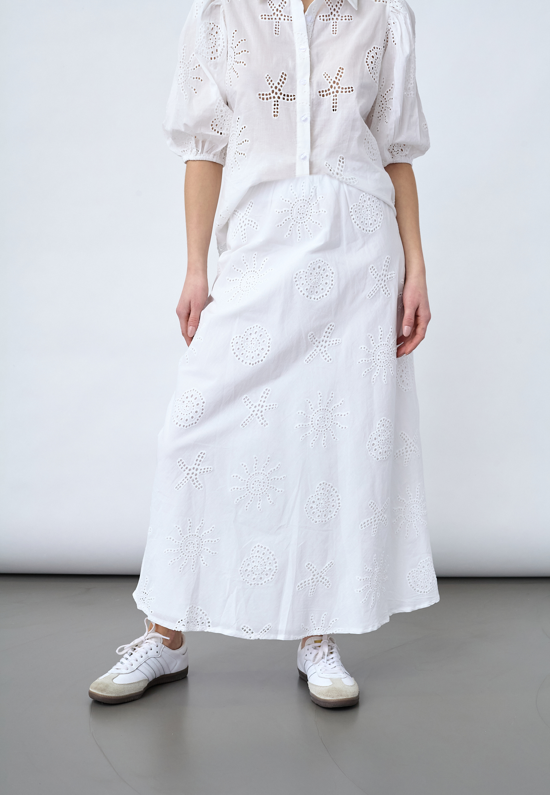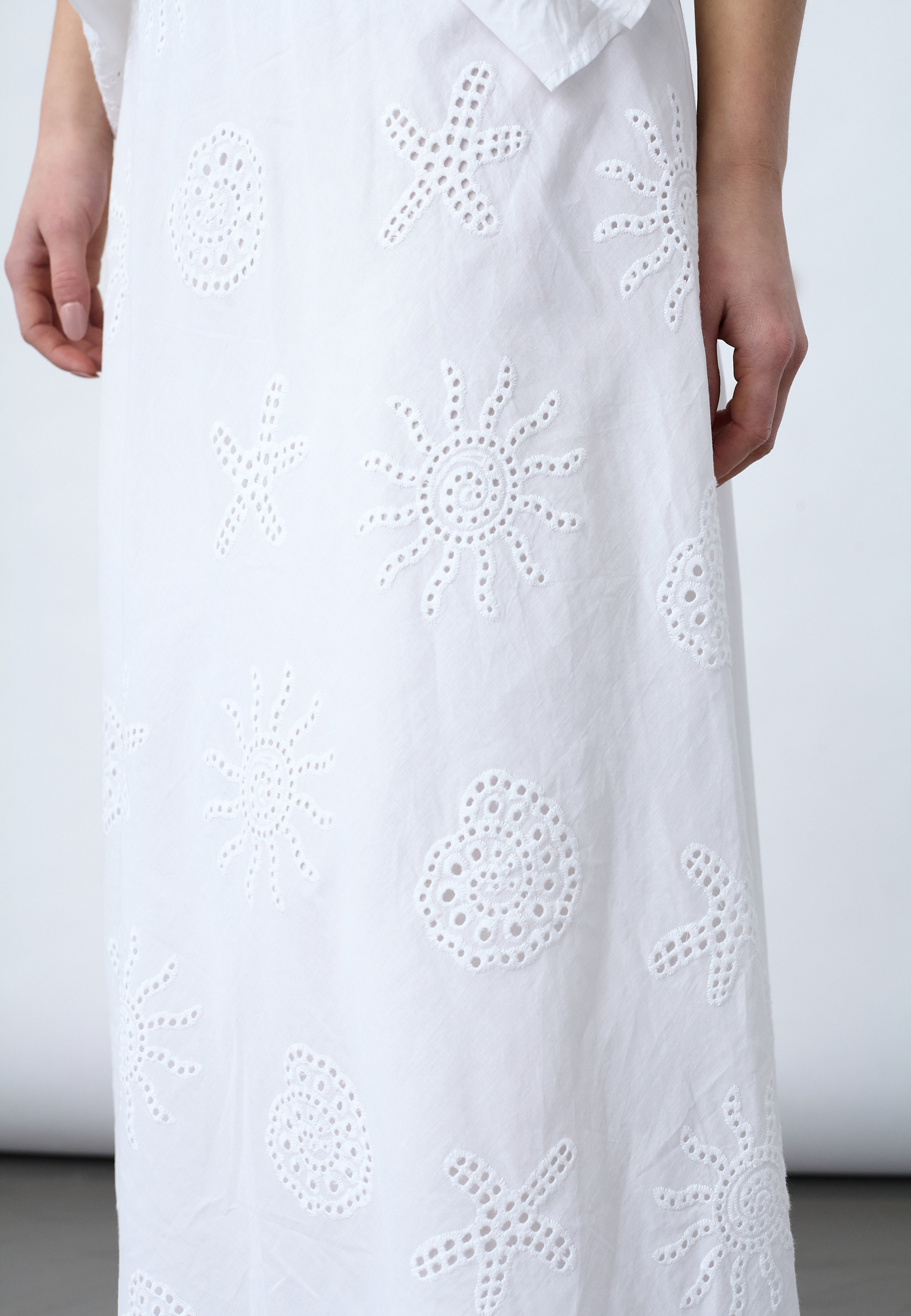 GUFO-SK er en maxinederdel i let bomuld med detaljerede broderie anglaise udskæringer. Nederdelen har et feminint A-snit og er dekoreret med unikke maritime broderier. Modellen har en str. S på og er 175 cm høj.