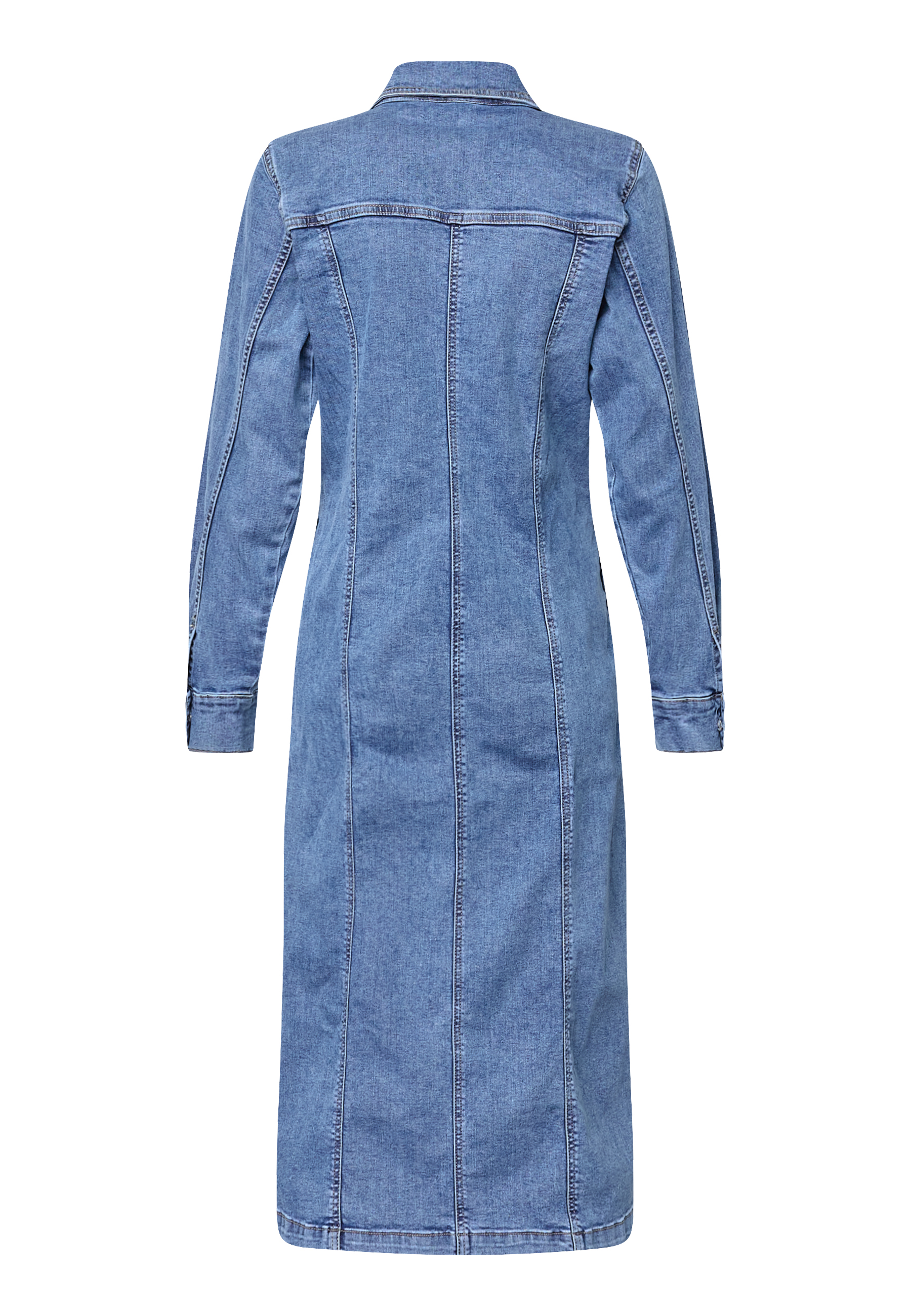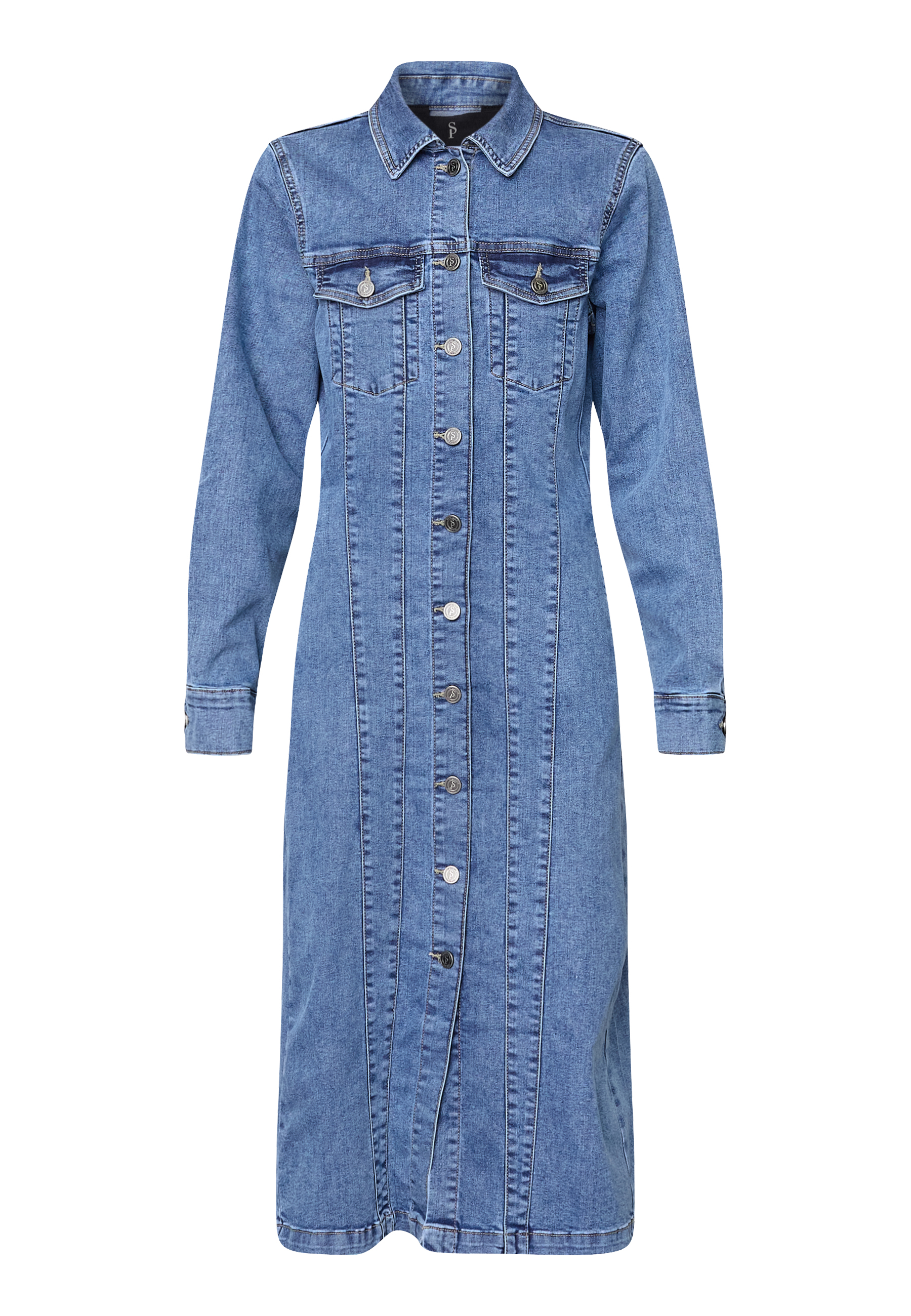 ODETTE-DR er en denimkjole i midi-længde med gennemgående knaplukning og klassisk krave. Den har brystlommer med klap og synlige lodrette syninger, der forlænger silhuetten. Modellen har en str. S på.