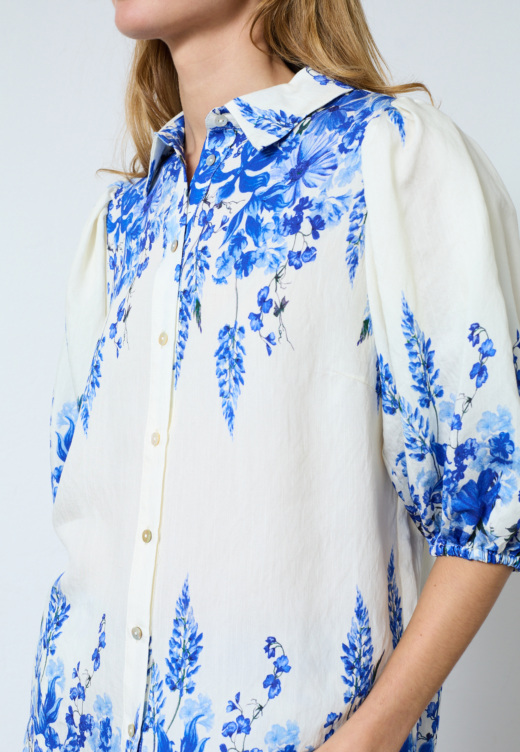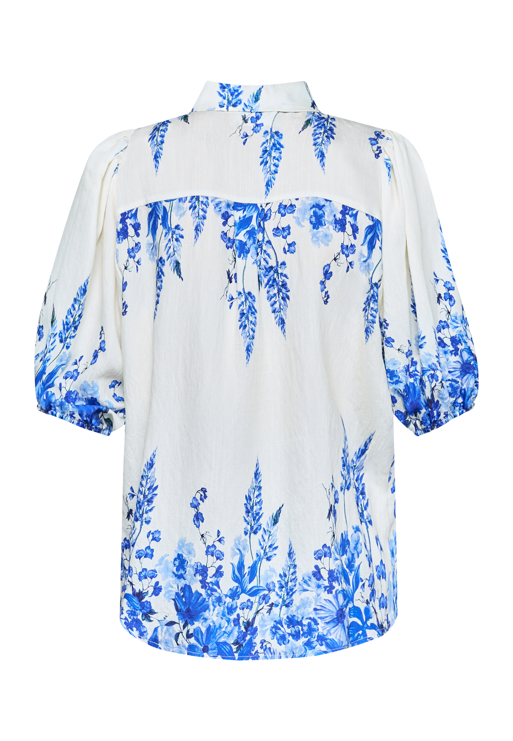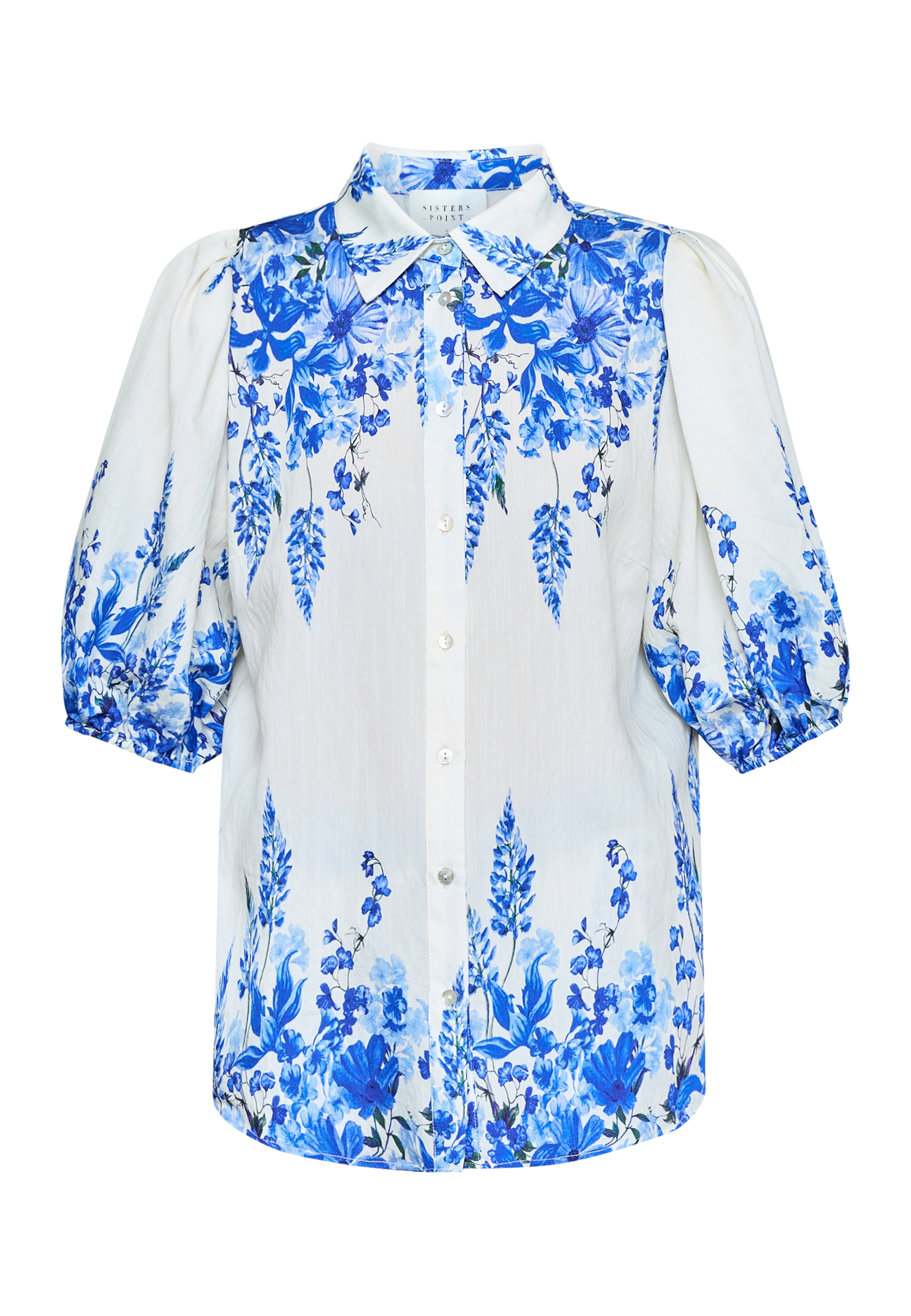 ELLA-SH76 er en skjorte i et blomstermønster. Den har en krave og gennemgående knaplukning foran. Skjorten har korte pufærmer med elastiske manchetter. Modellen har en str. S på.