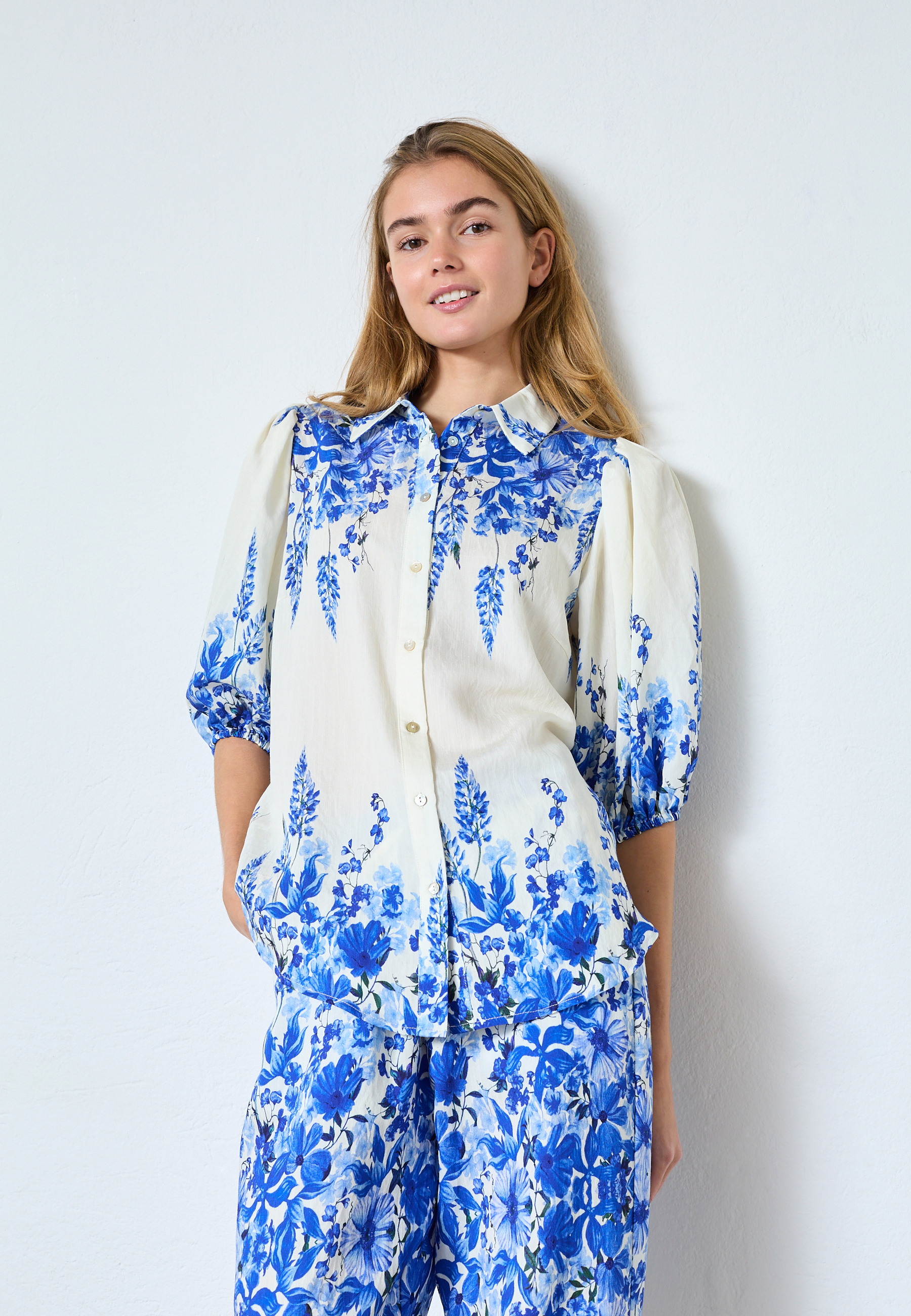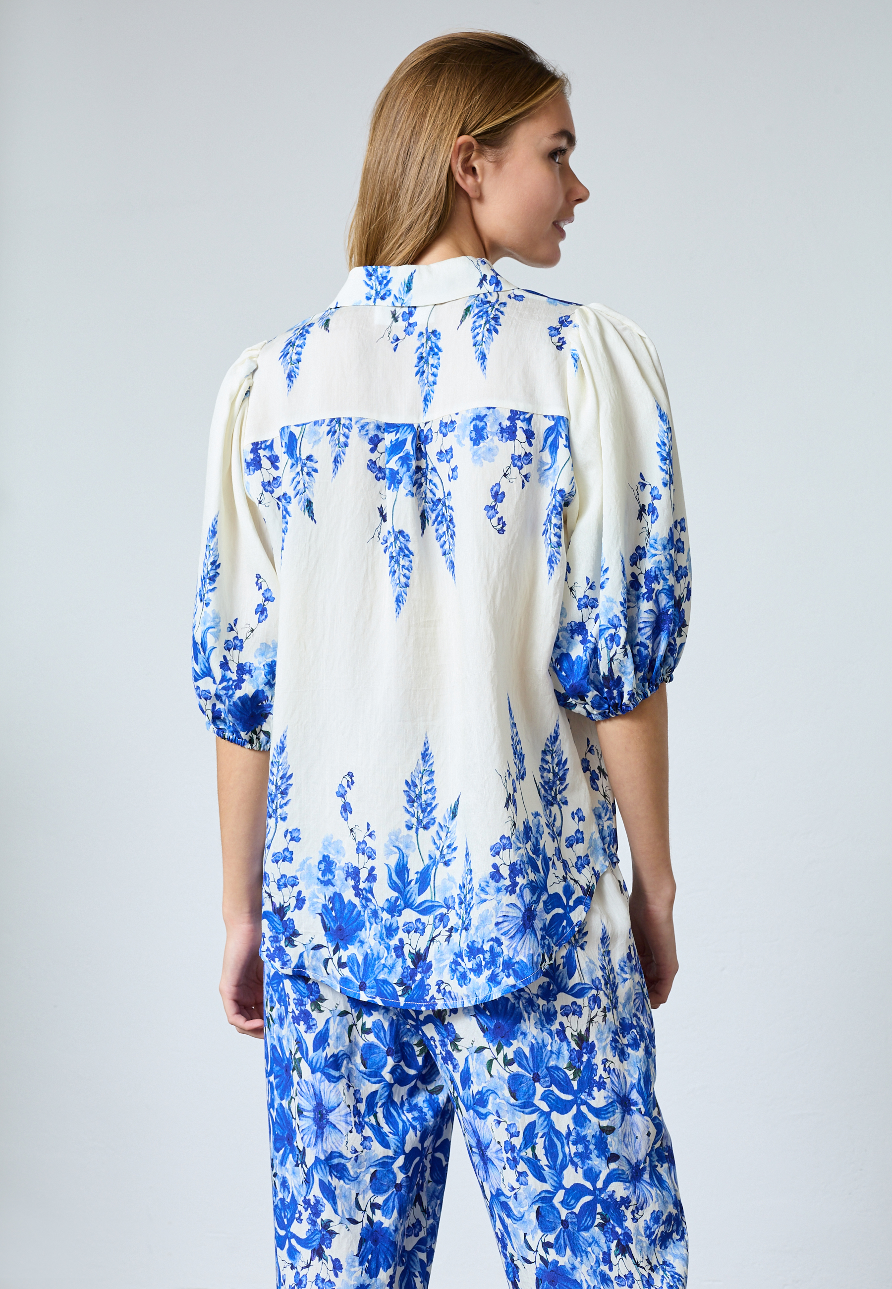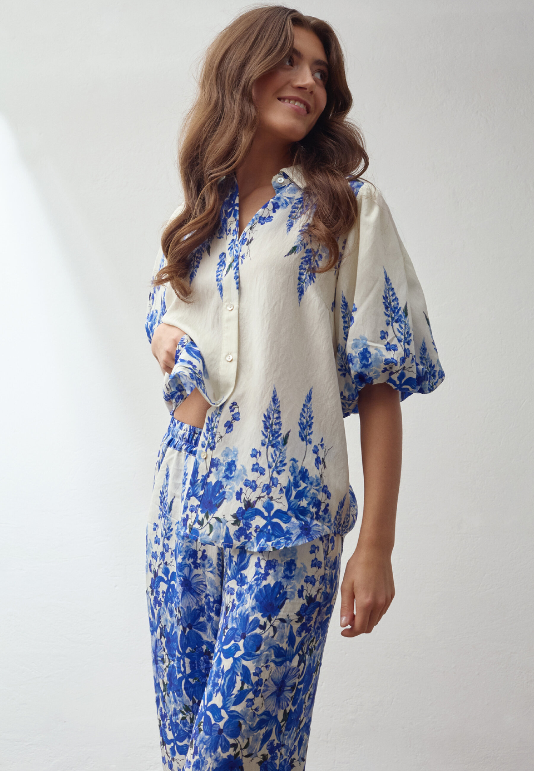 ELLA-SH76 er en skjorte i et blomstermønster. Den har en krave og gennemgående knaplukning foran. Skjorten har korte pufærmer med elastiske manchetter. Modellen har en str. S på.