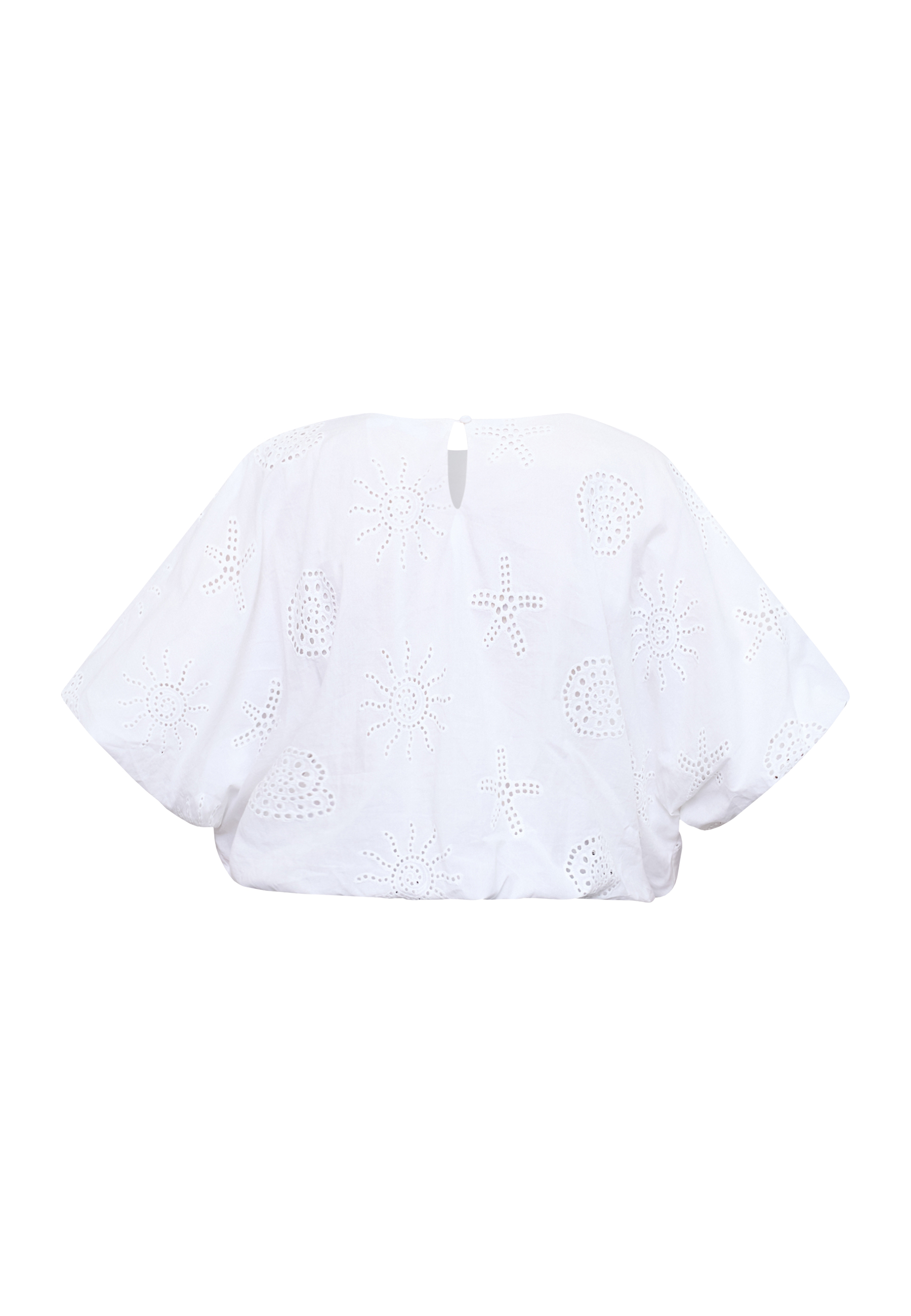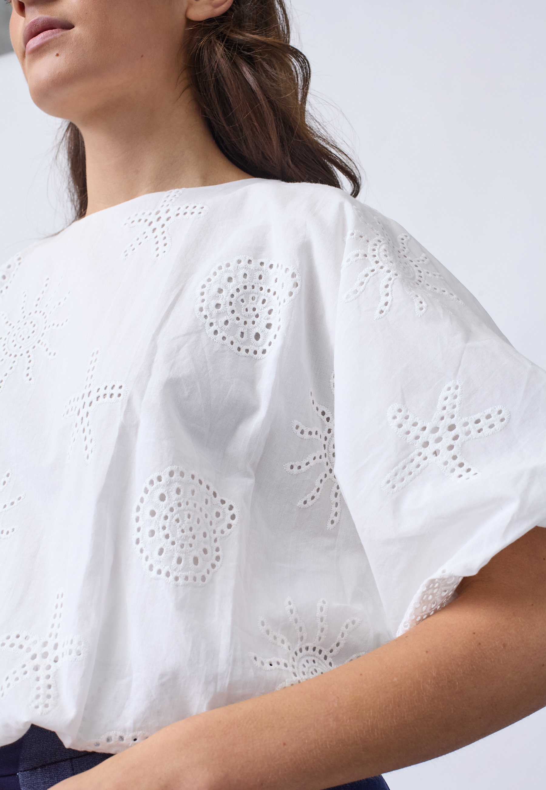 GUFO-TOP4 er en boho-inspirerede top i let bomuld med dekorative eyelet-broderier og feminine udskæringsdetaljer. Blusen har en afslappet pasform med voluminøse pufærmer. Modellen har en str. S på.