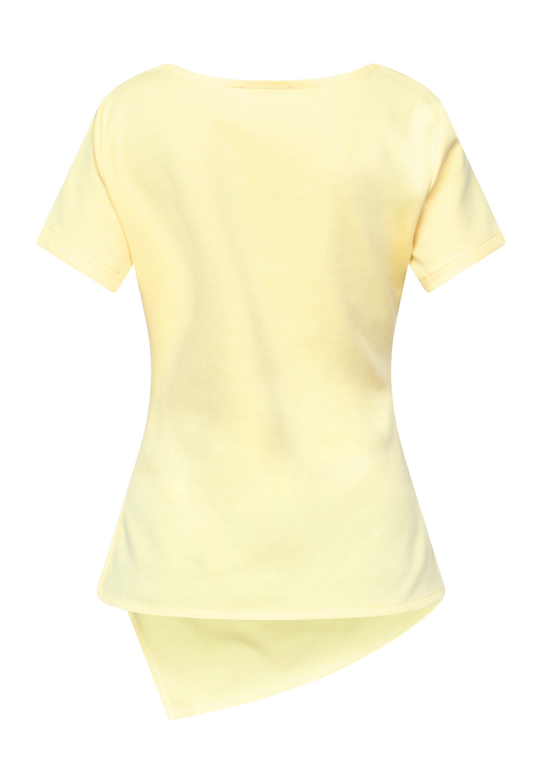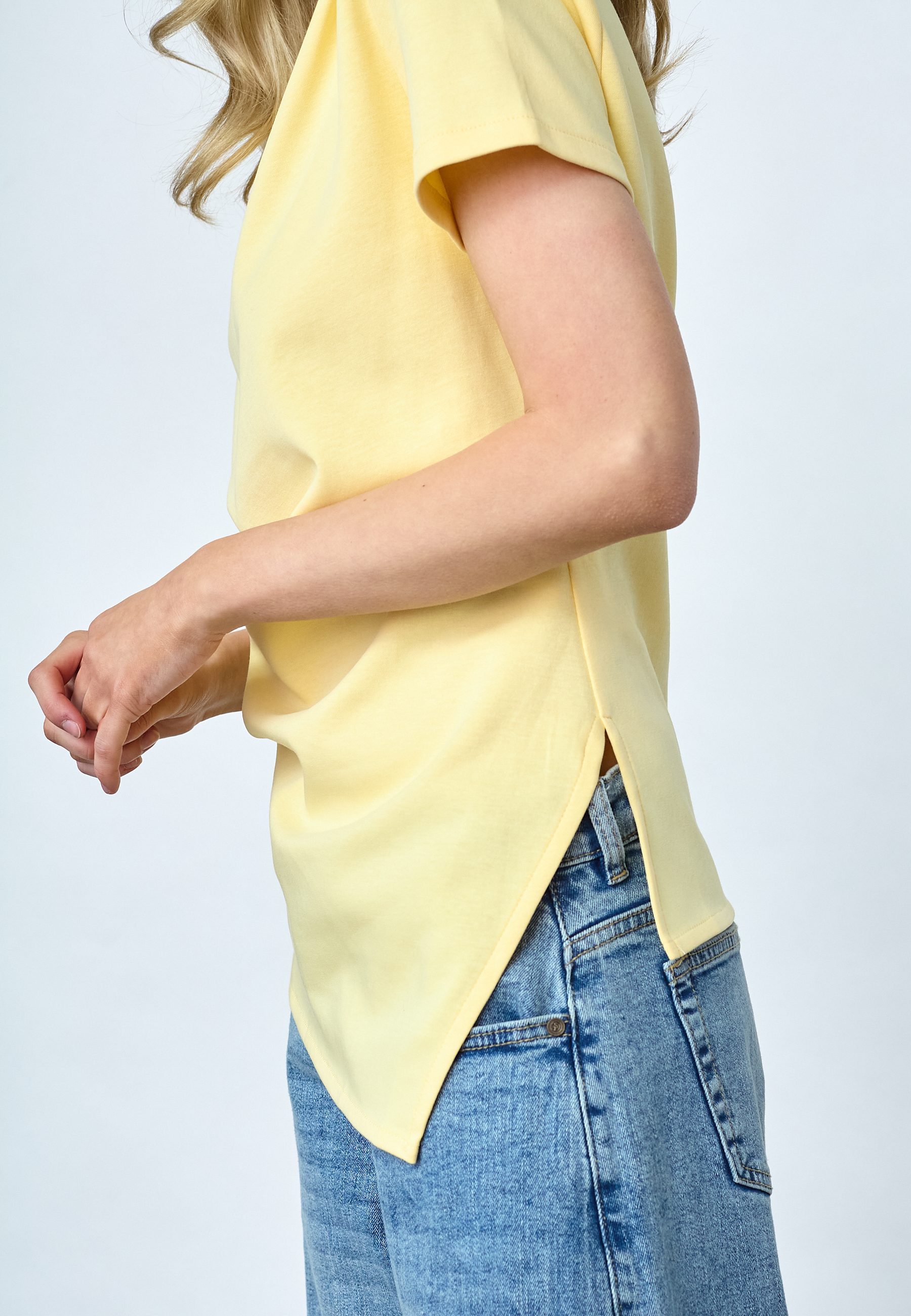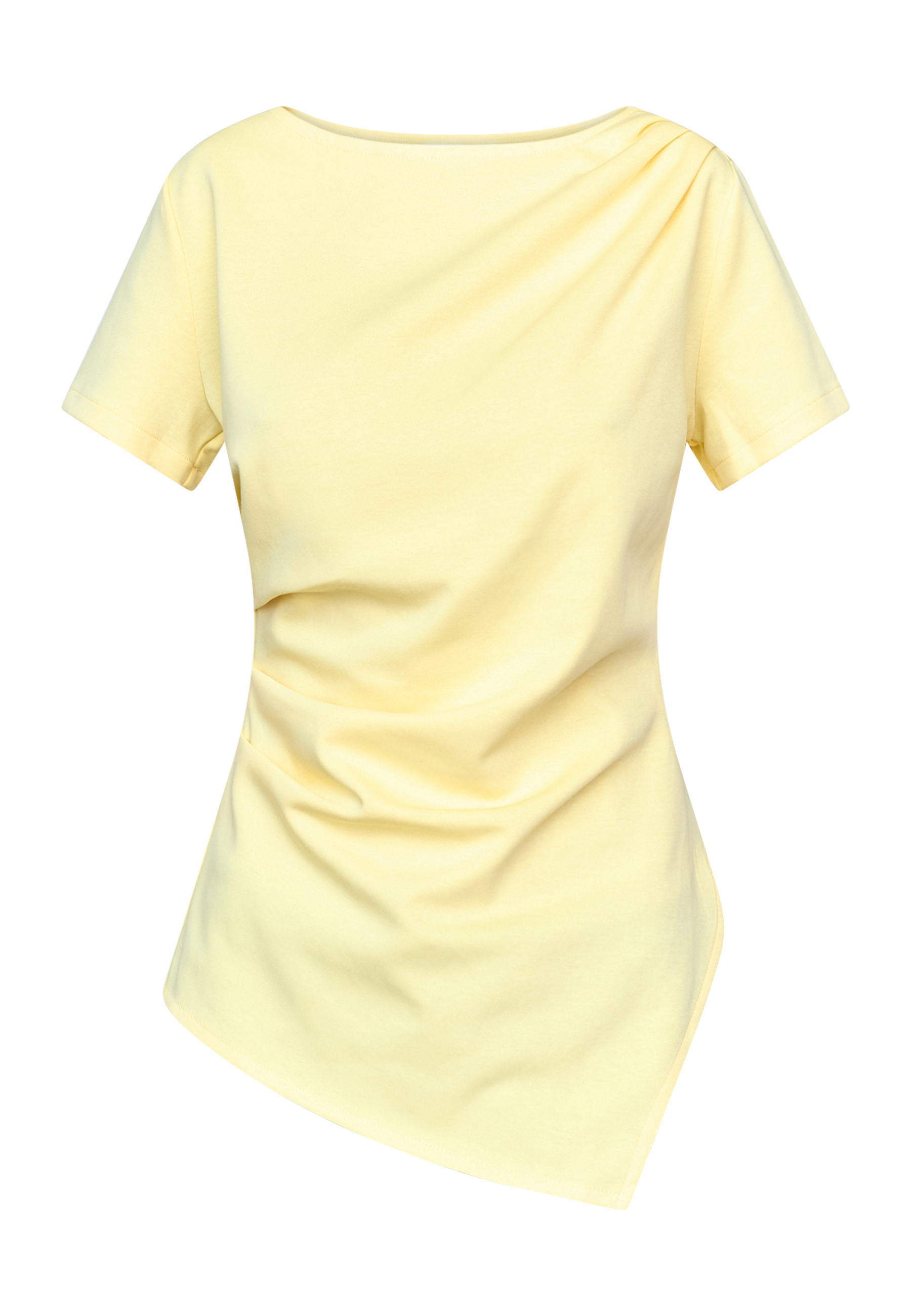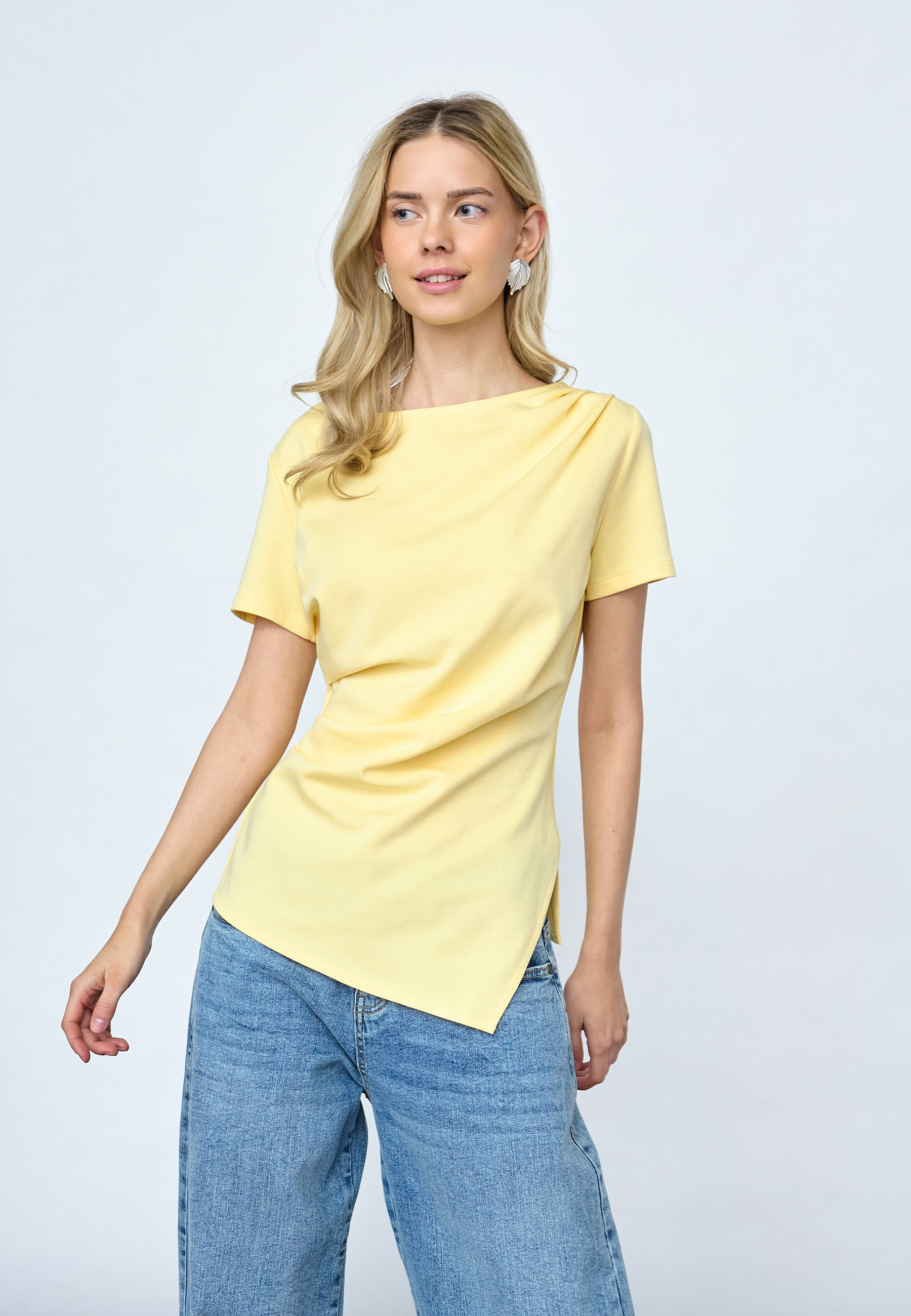 VEDA-TOP er en elegant top i blød bomuldskvalitet. Den har korte ærmer, bådhals og unikke draperinger foran, der skaber en asymmetrisk bund med en spids afslutning og små slidser i siden. Modellen har en str. S på