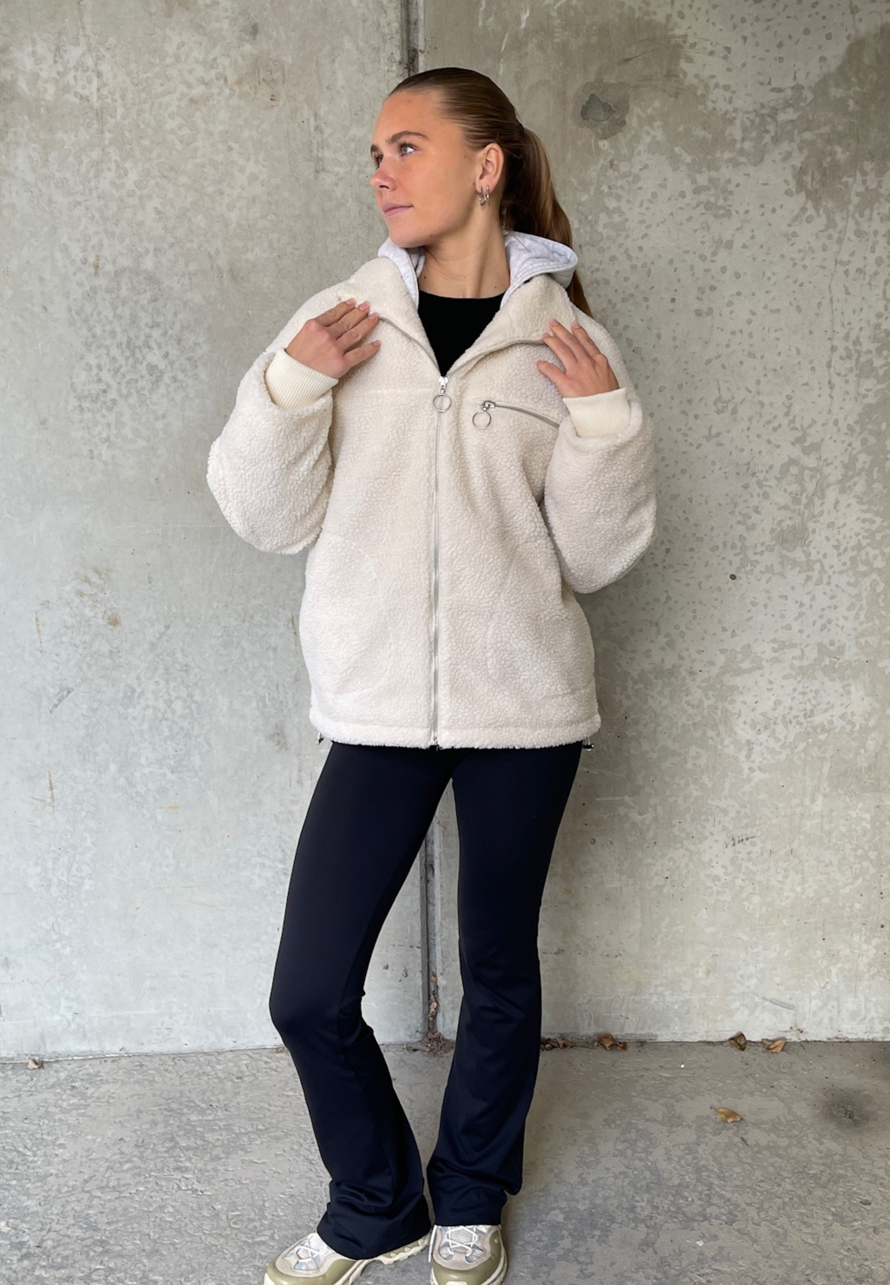 DOFI-BOMBER er en kort ensfarvet teddy jakke med lynlåslukning og høj hals. Jakken har elastik ribkant ved håndleddende, og en lille lynlås detalje på det ene bryst. Modellen er 172 cm høj, og har en størrelse S på.