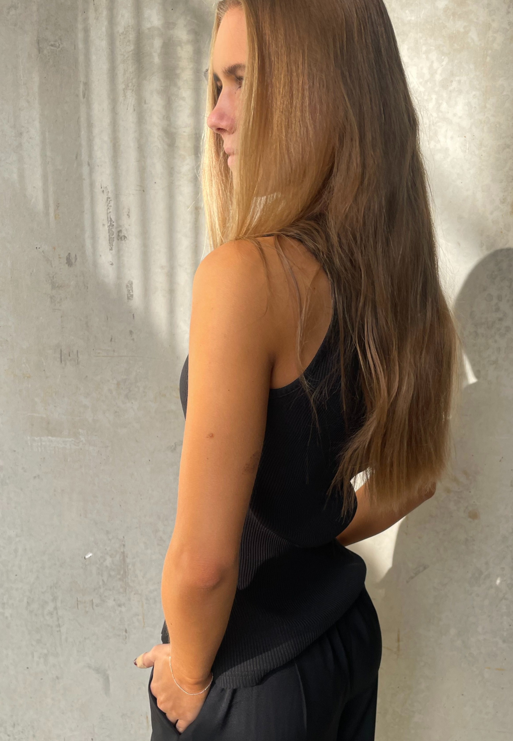 EIKE-TA4 er en ensfarvet top med en tætsiddende pasform. Tanktoppen er i rib og har bredde stropper. Modellen er 178,5 cm og har størrelse S på.