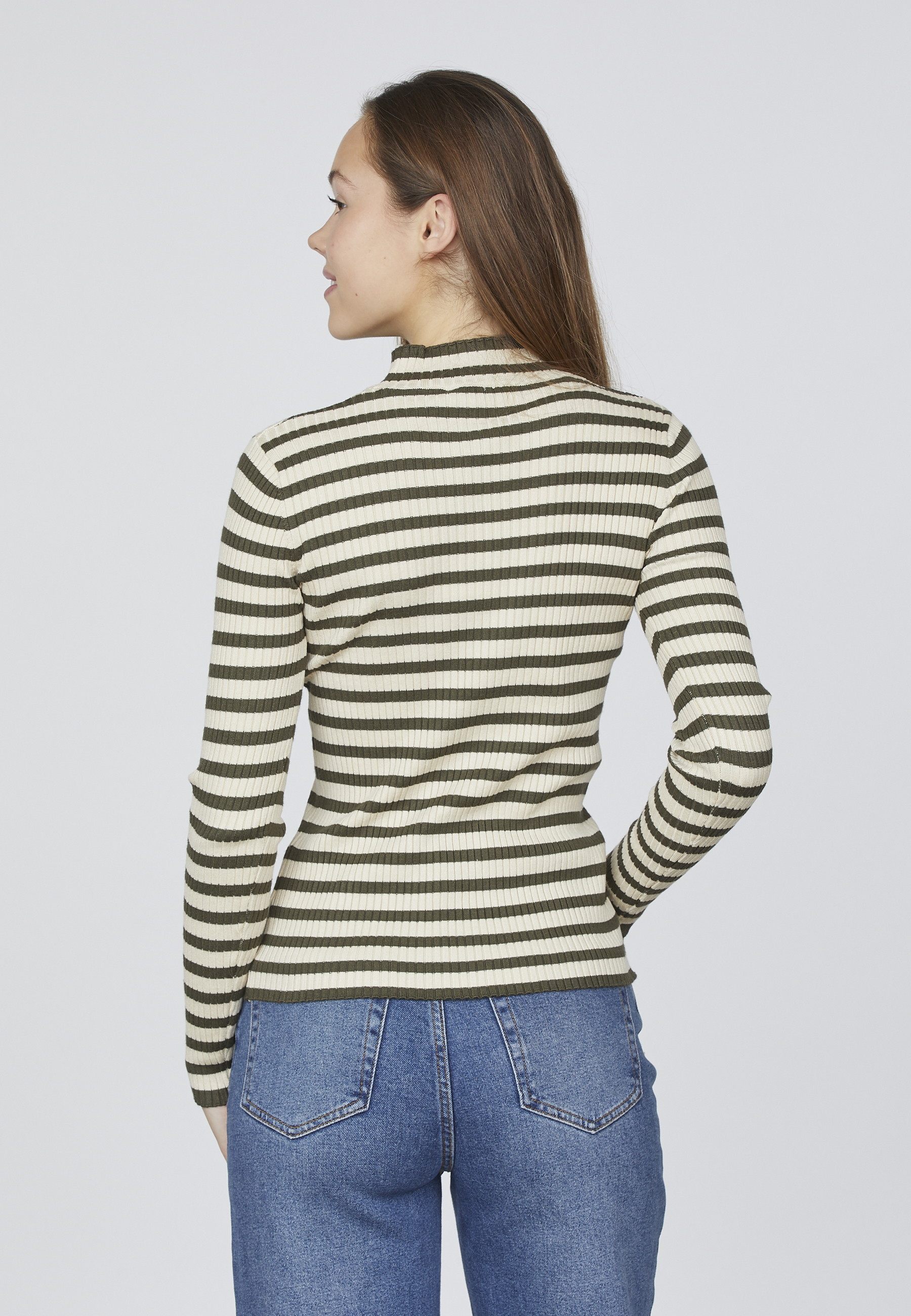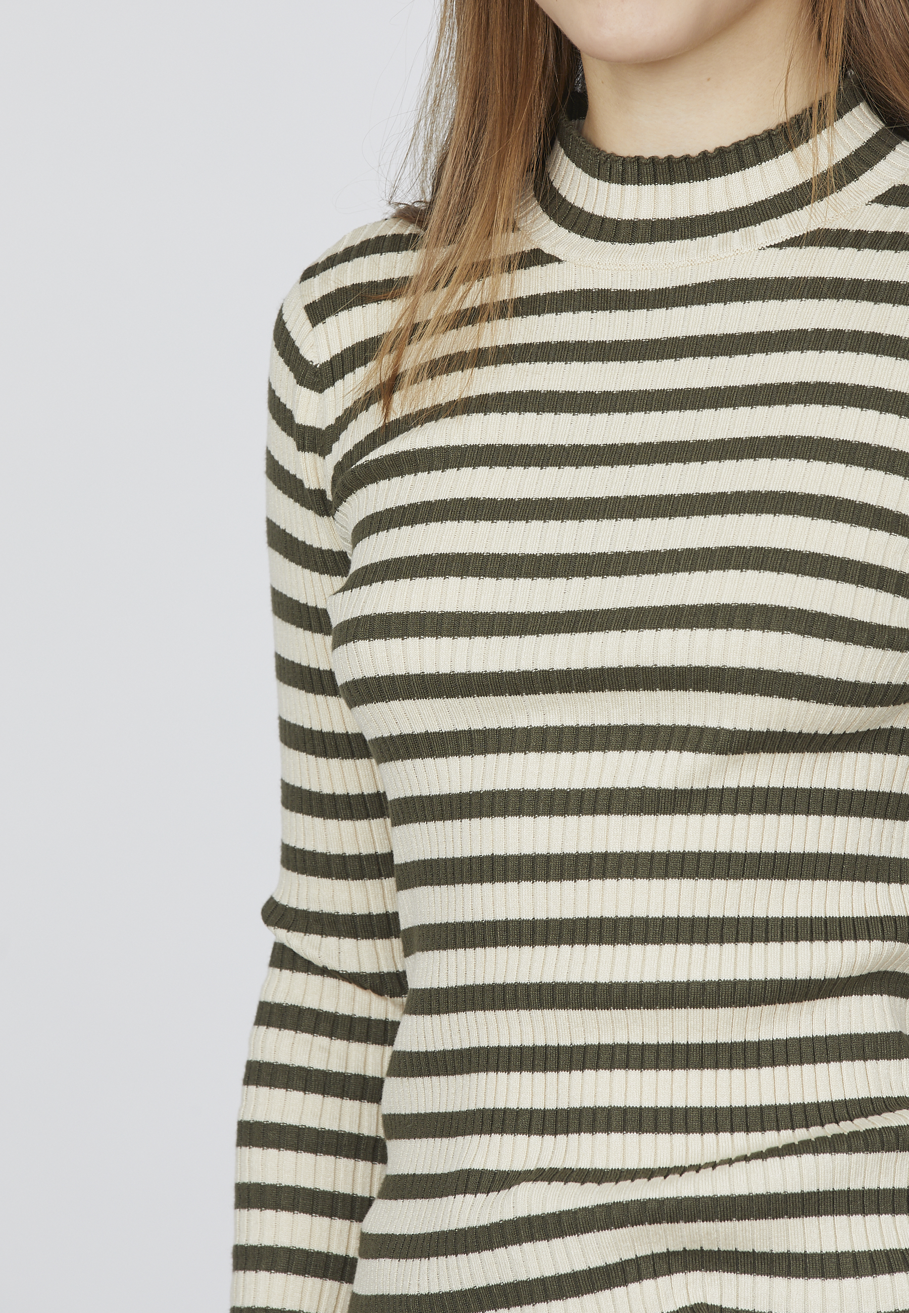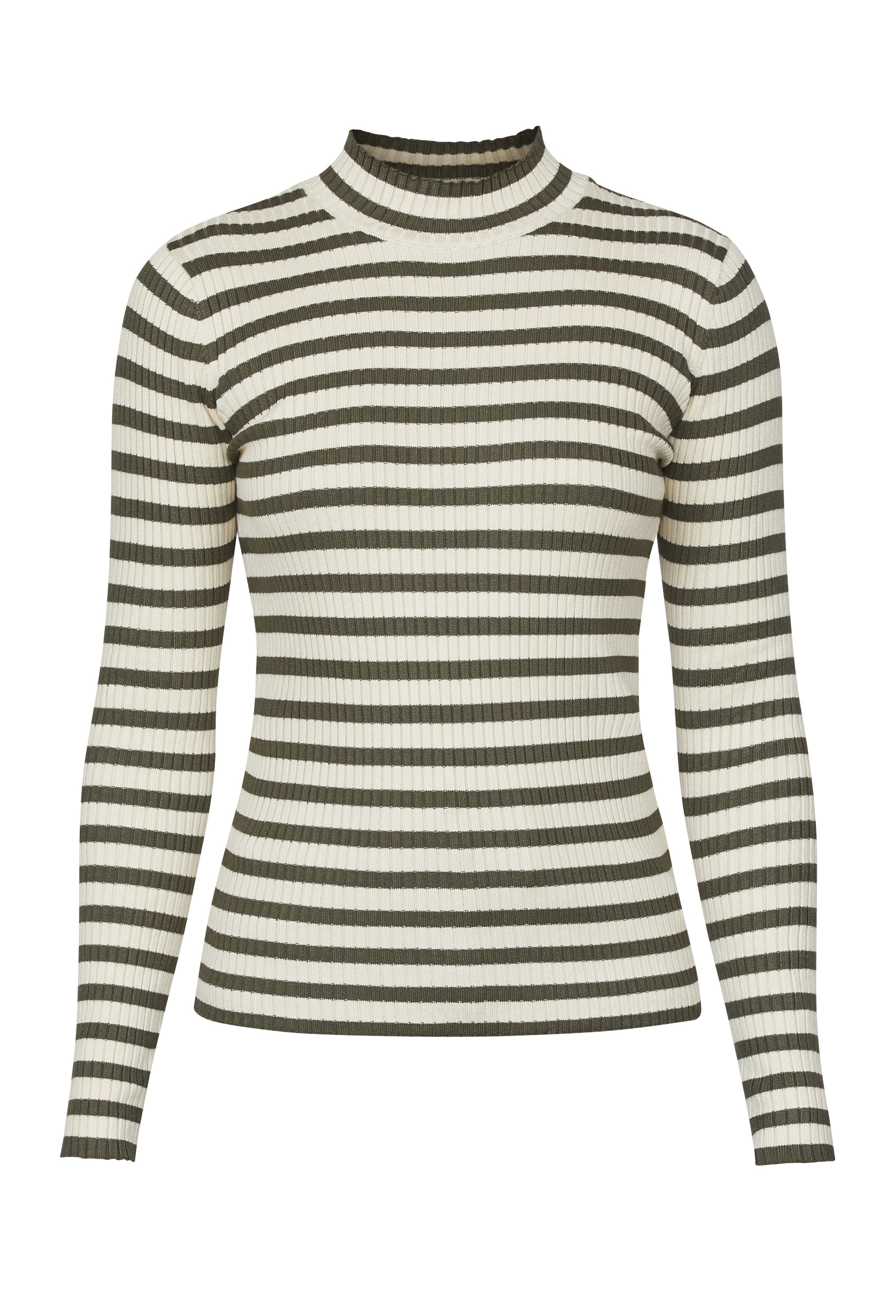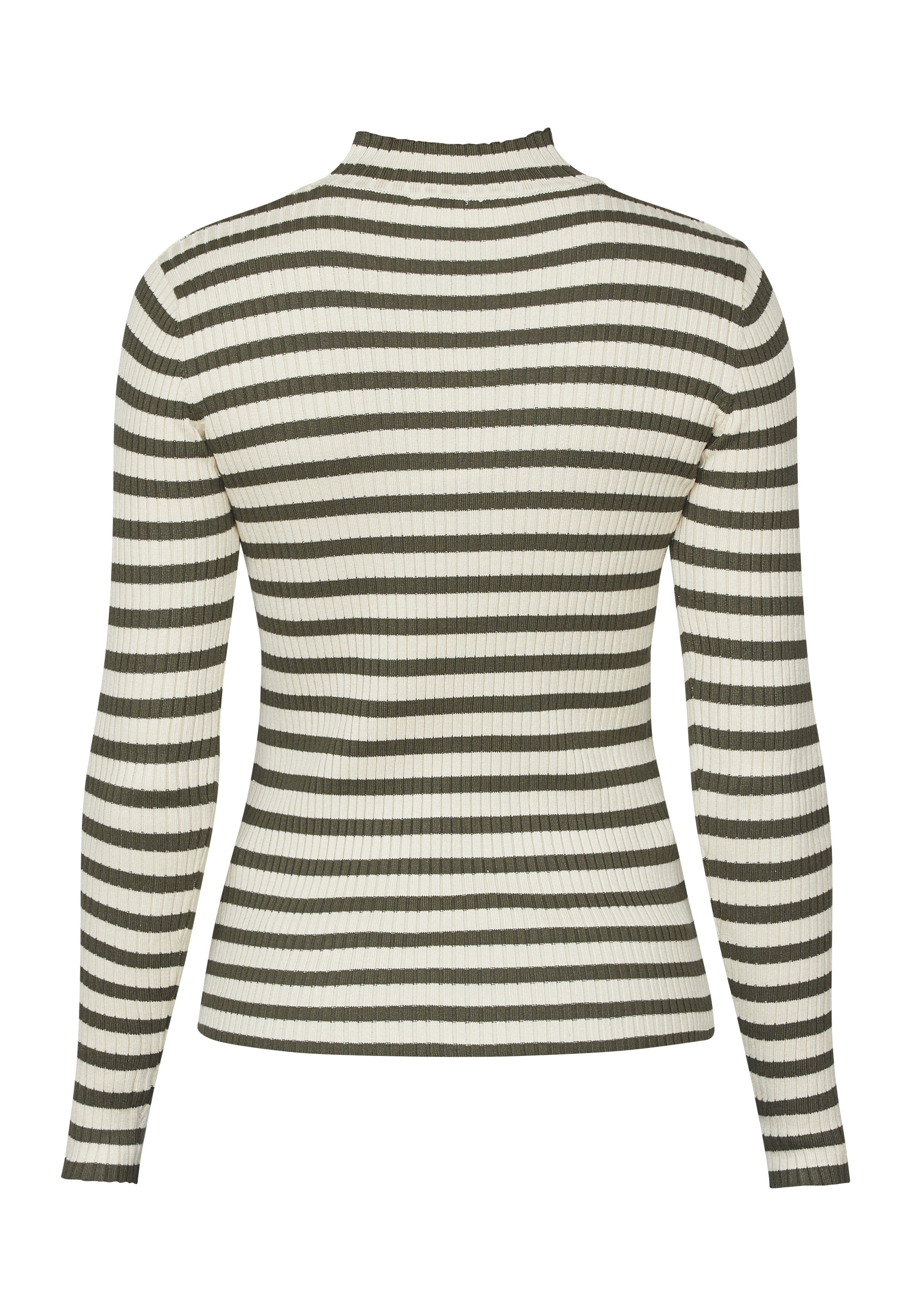 HUGA-T.LS er en stribet bluse med en tætsiddende pasform. Blusen er i rib og har en høj hals. Modellen har en str. S på.