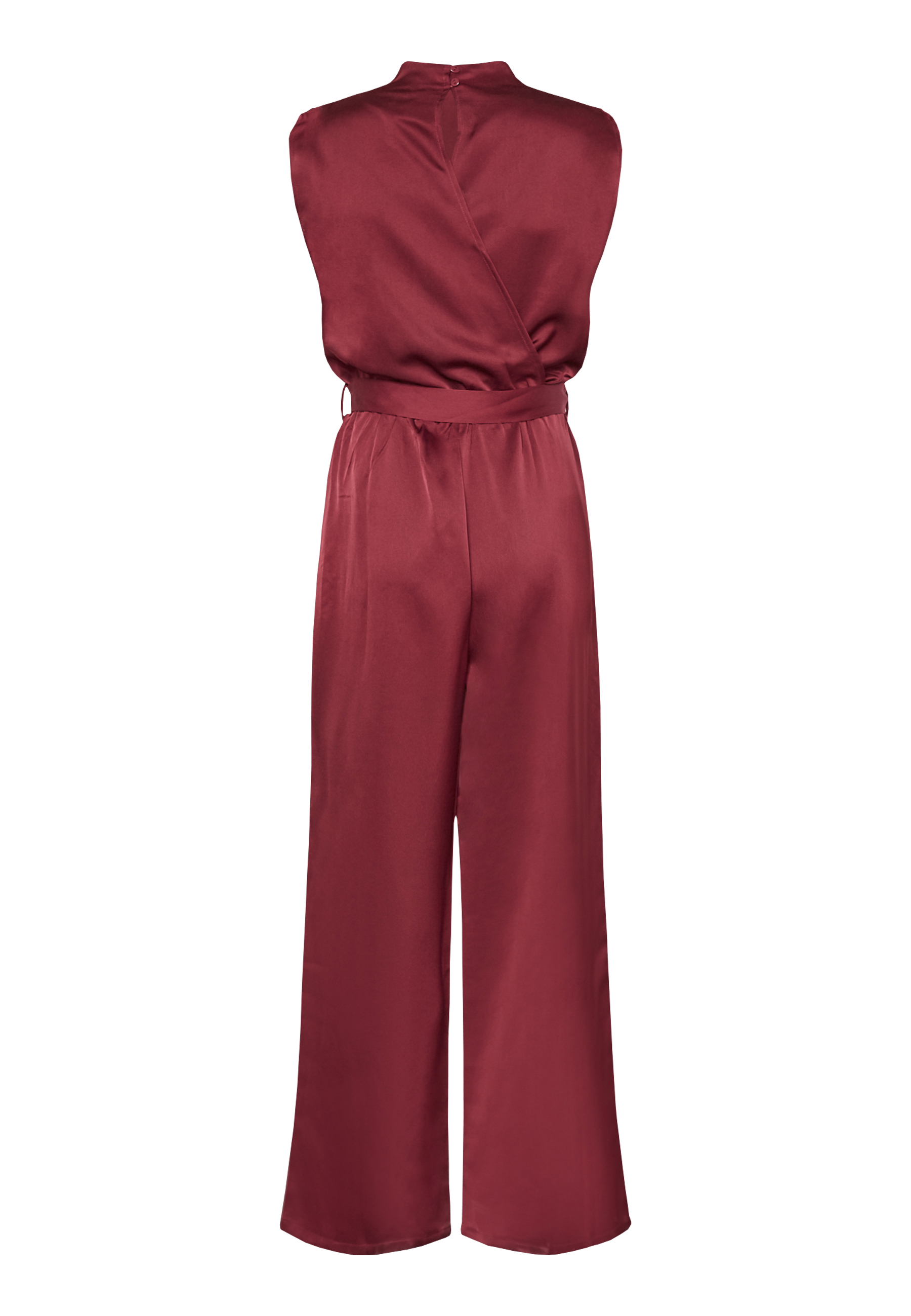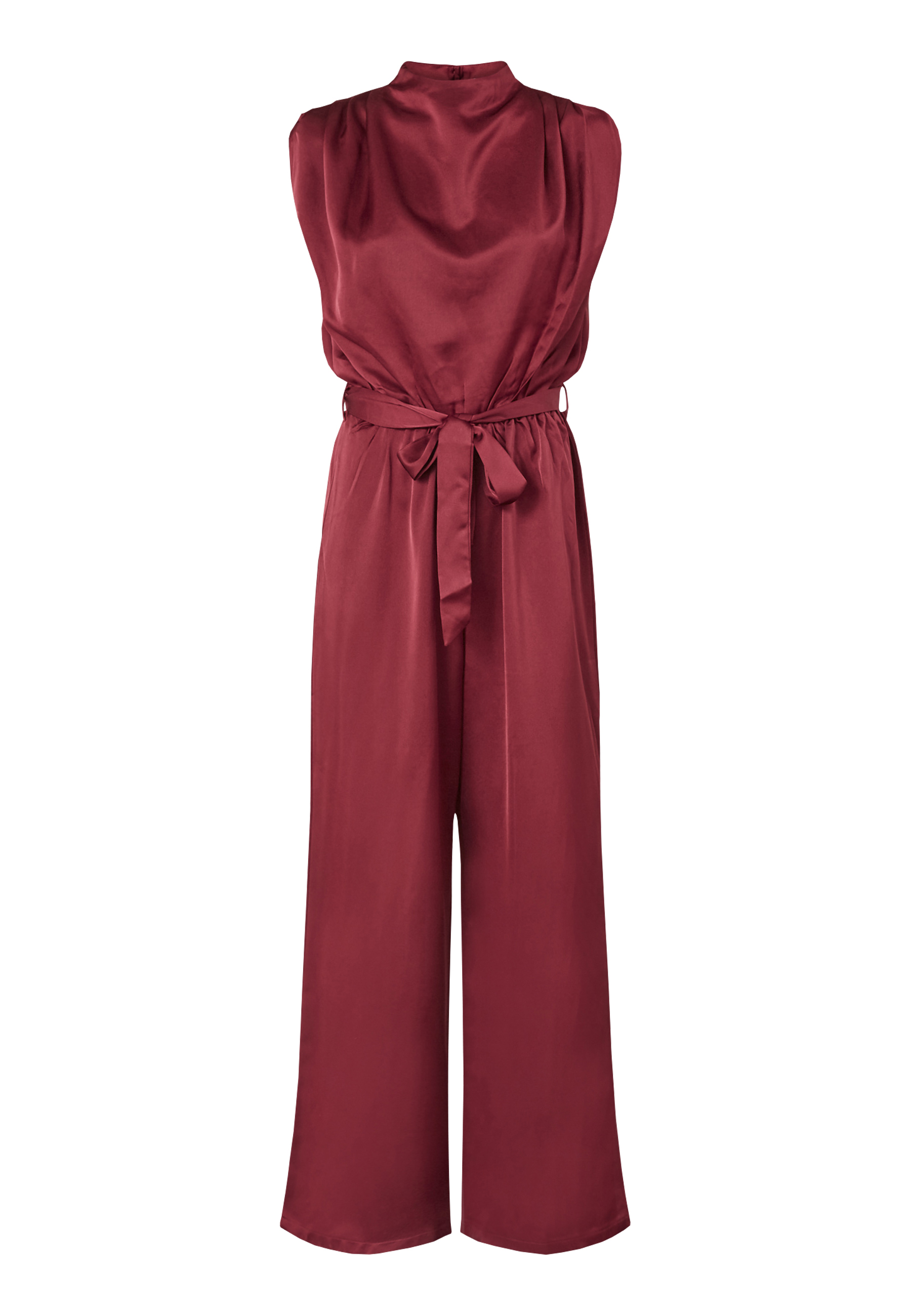 GUTO-JU4 er en elegant satin jumpsuit uden ærmer. Den har aftageligt bindebånd om taljen og en smuk udskæring i rykken. Modellen har en str. S på.