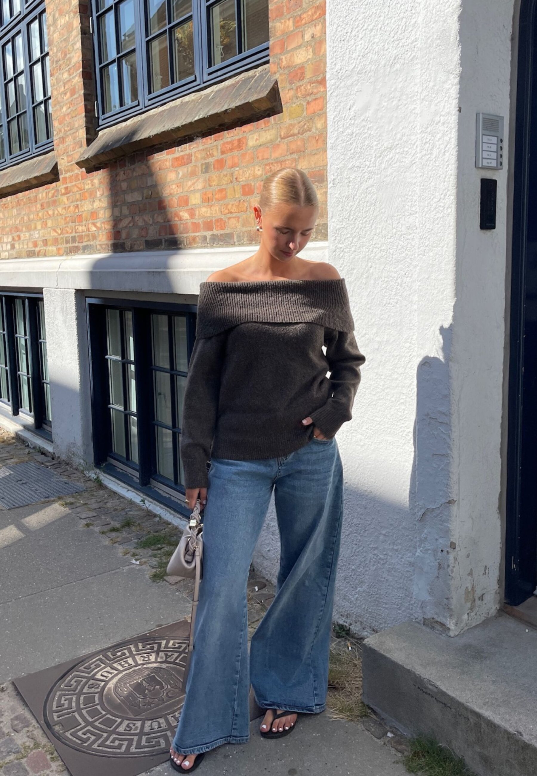 LUCA-OS er en strikket sweater med en bred, foldbar off-shoulder krave og lange ærmer. Den har en afslappet pasform, der falder elegant over skuldrene. Modellen har en str. S på.