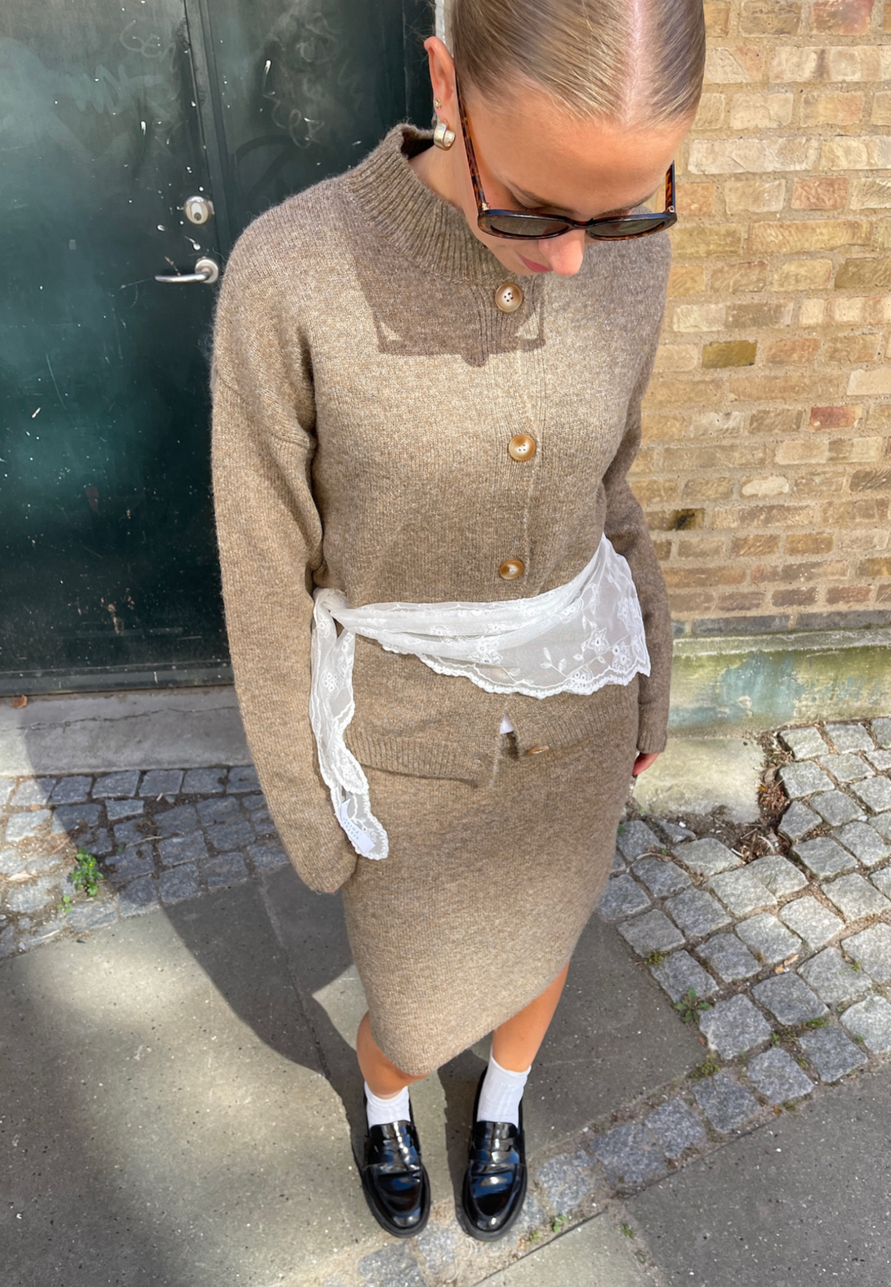 LUCA-CA er en strikket cardigan med rund halsudskæring, gennemgående knaplukning og lange ærmer med raglanfacon. Den har ribstrikkede kanter for en behagelig pasform. Modellen har en str. S på.