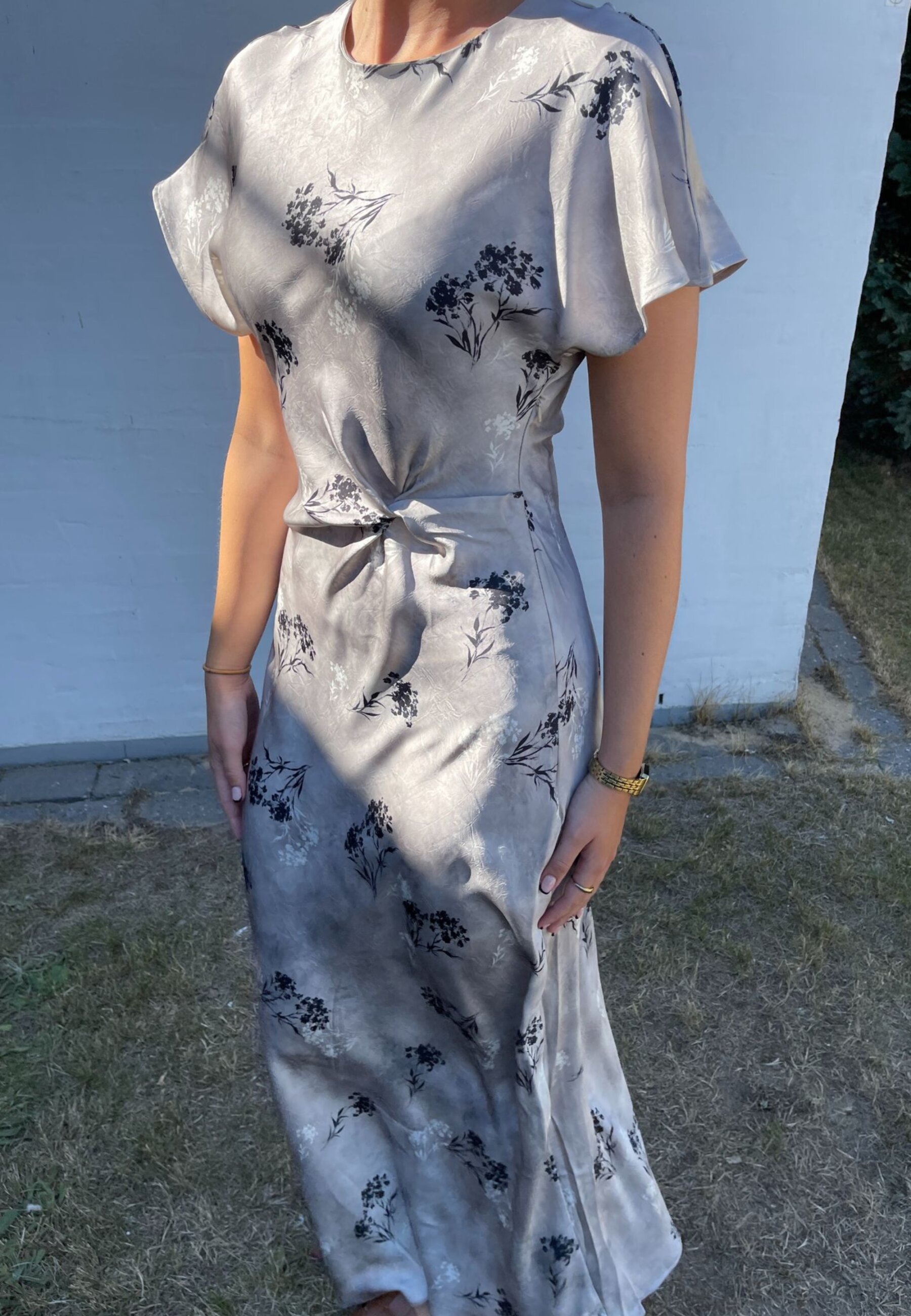 GISTA-DR1 er en lang kjole i et glat, let skinnende materiale med korte, markerede ærmer. Kjolen har en rund halsudskæring og en draperet detalje på fronten, der skaber en feminin silhuet. Modellen har en str. S på.