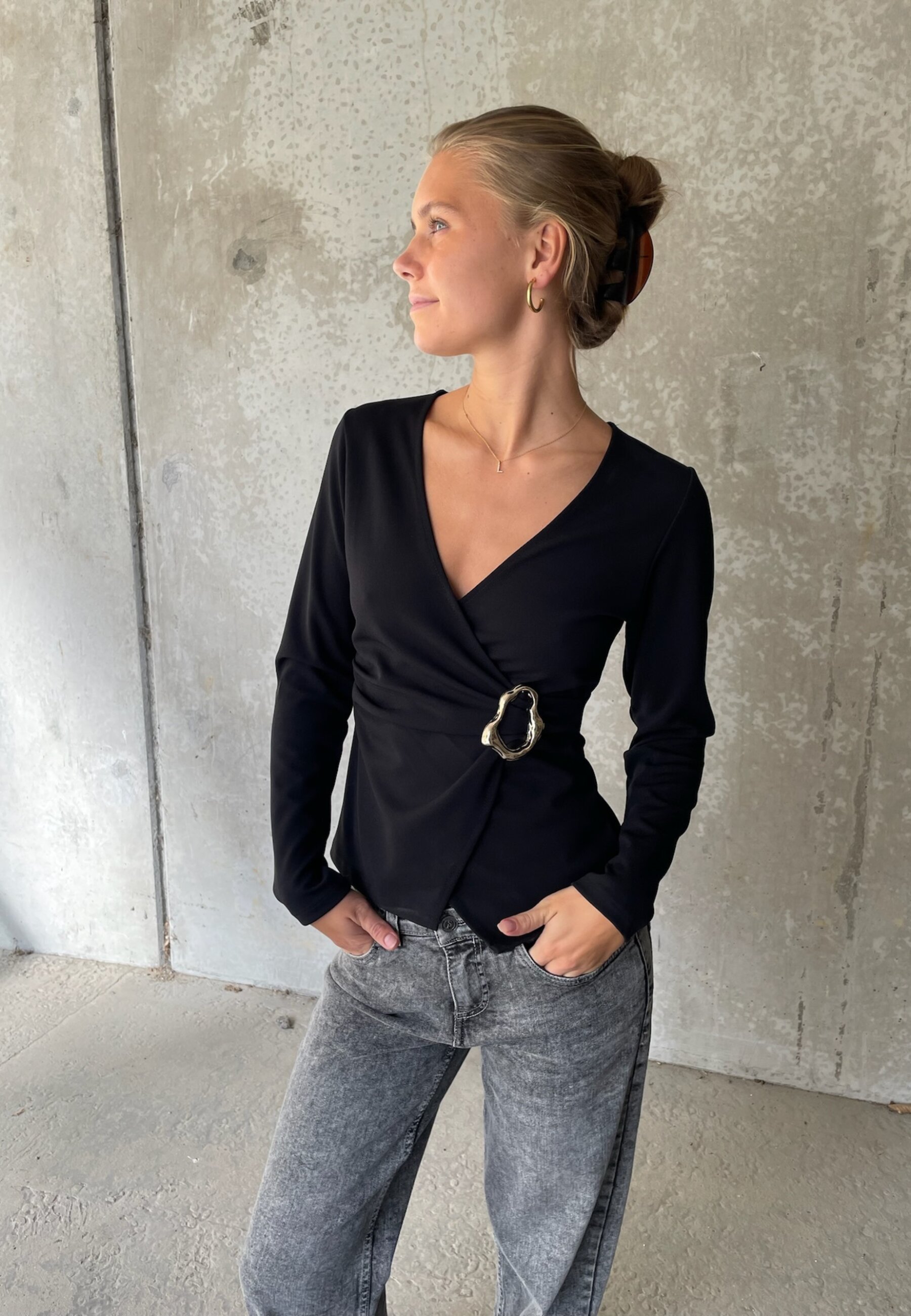 KEVELA-TOP er en langærmet bluse med et overslag og en v-halsudskæring. Den har en asymmetrisk linje, der samles af en stor, abstrakt spænde. Modellen har en str. S på.