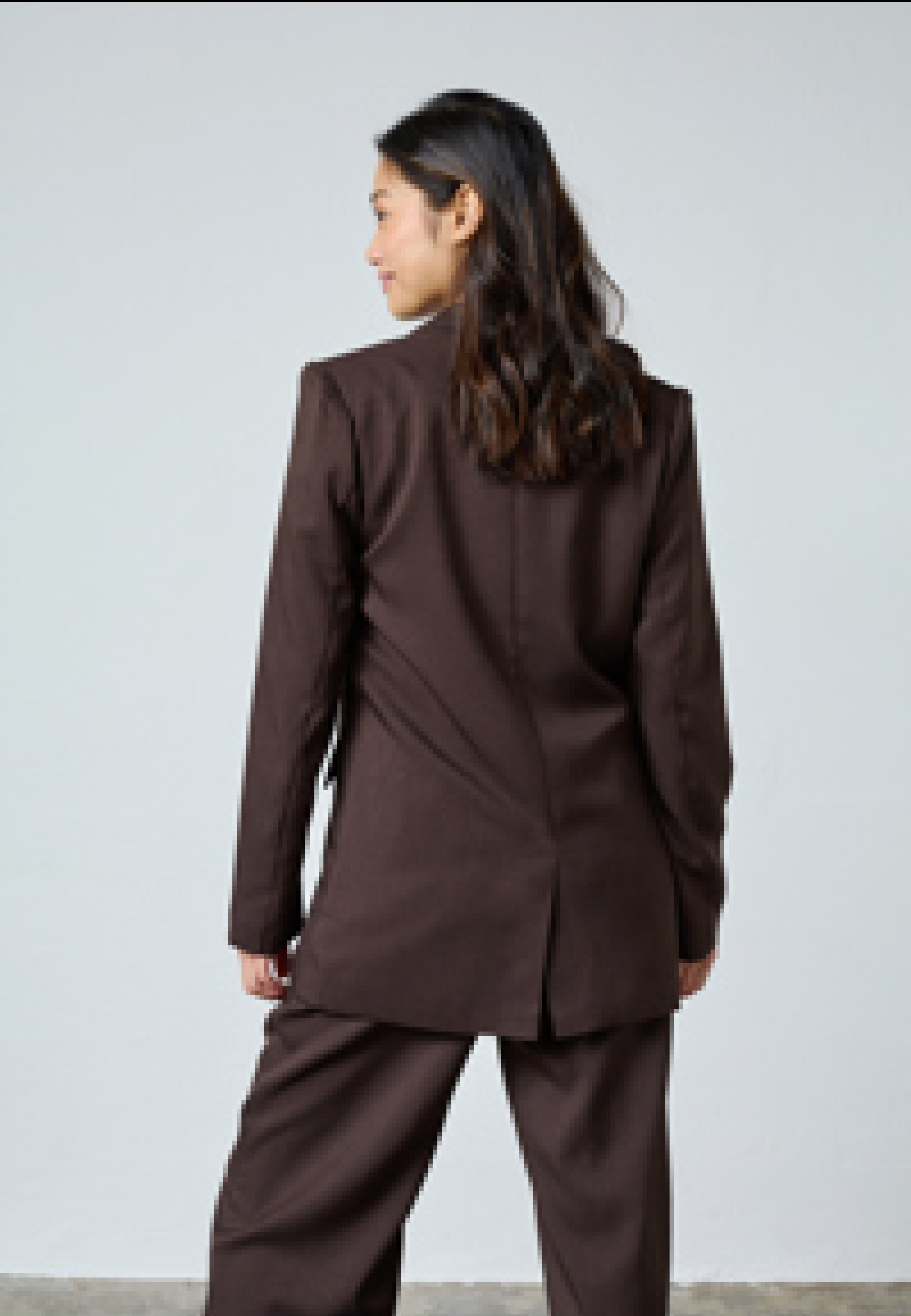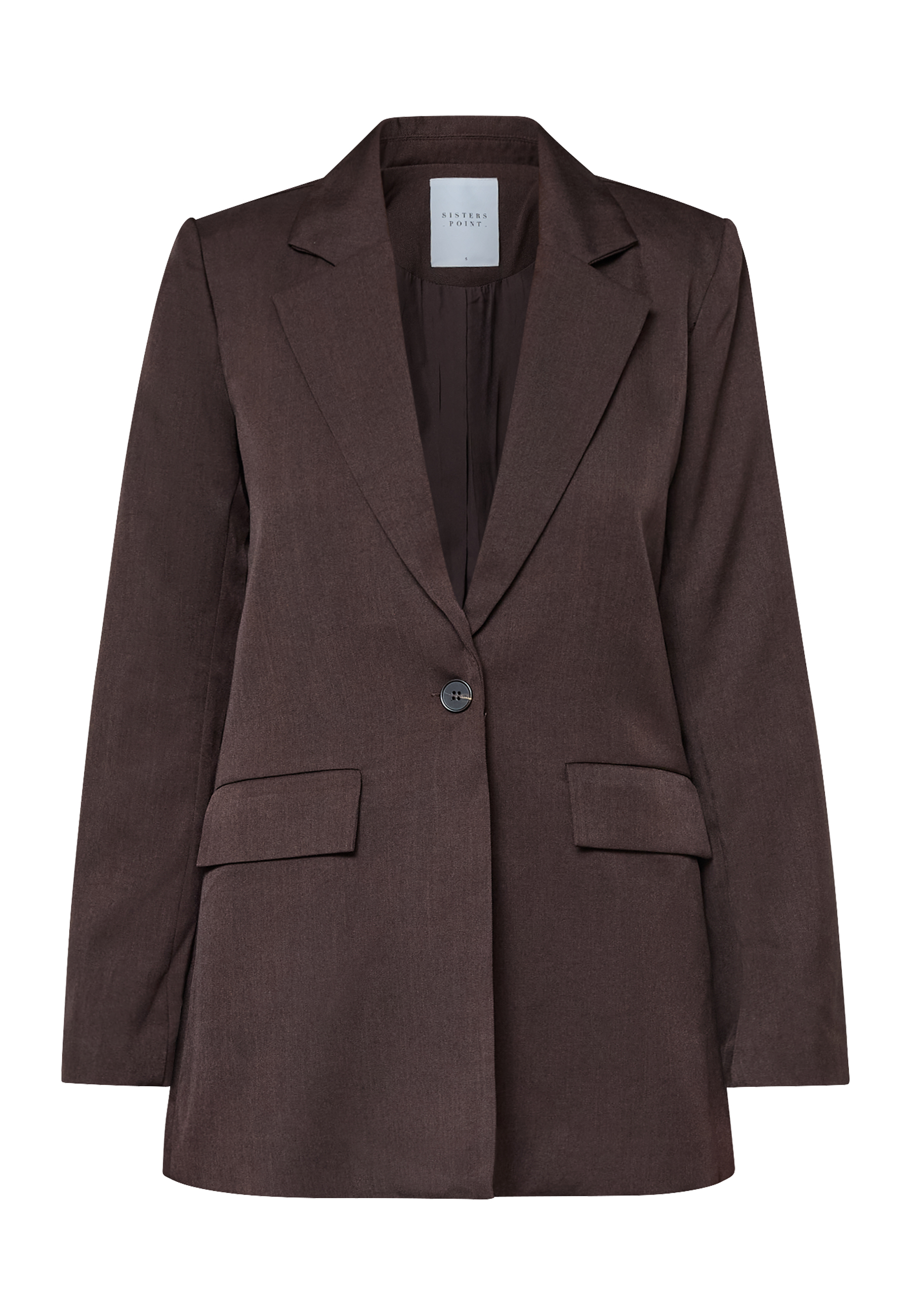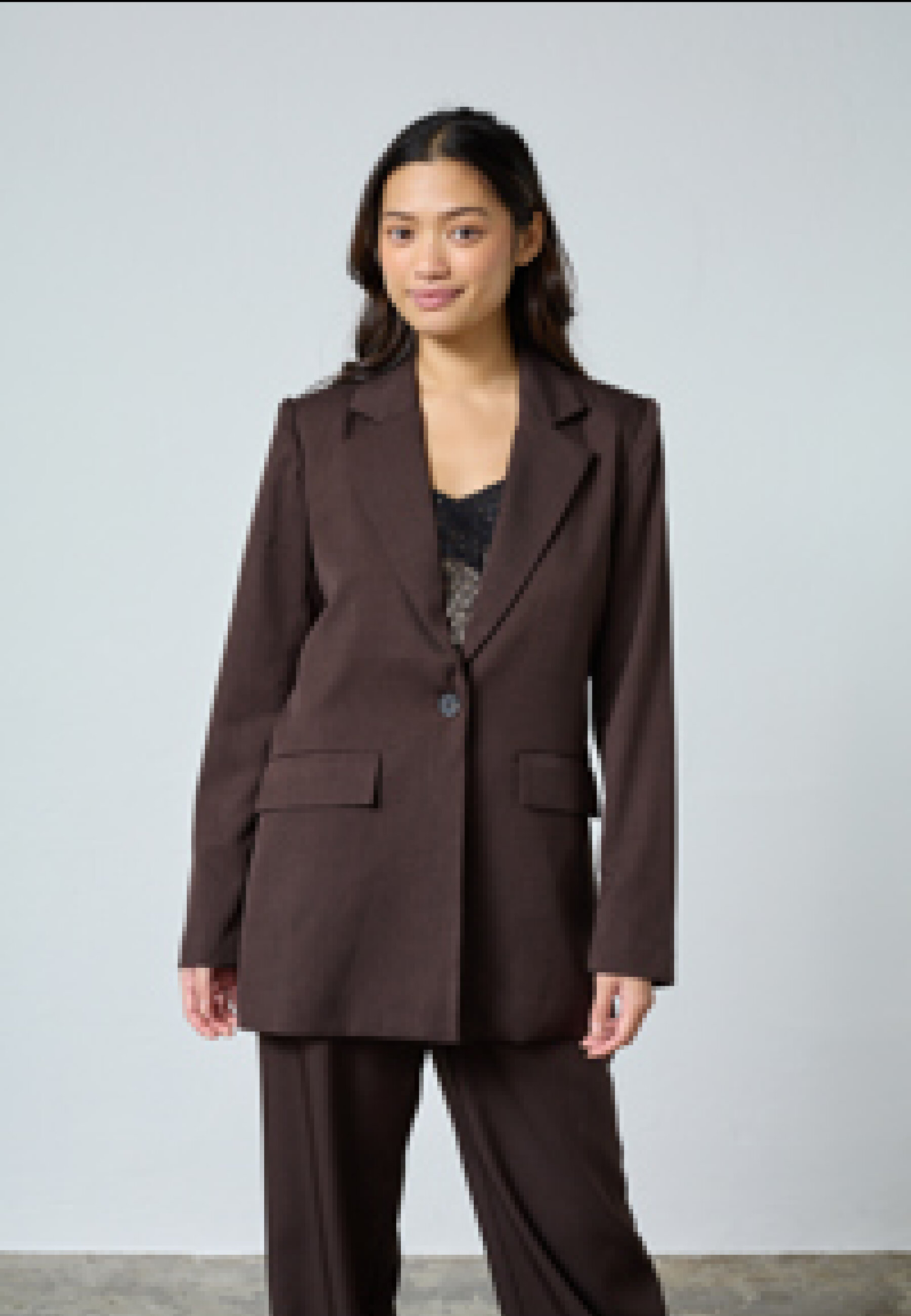 VIKSA-BL is a blazer with a collar and a button in the front. The blazer has three decorative buttons on the sleeves and two pockets in the front. The model is wearing a size S.