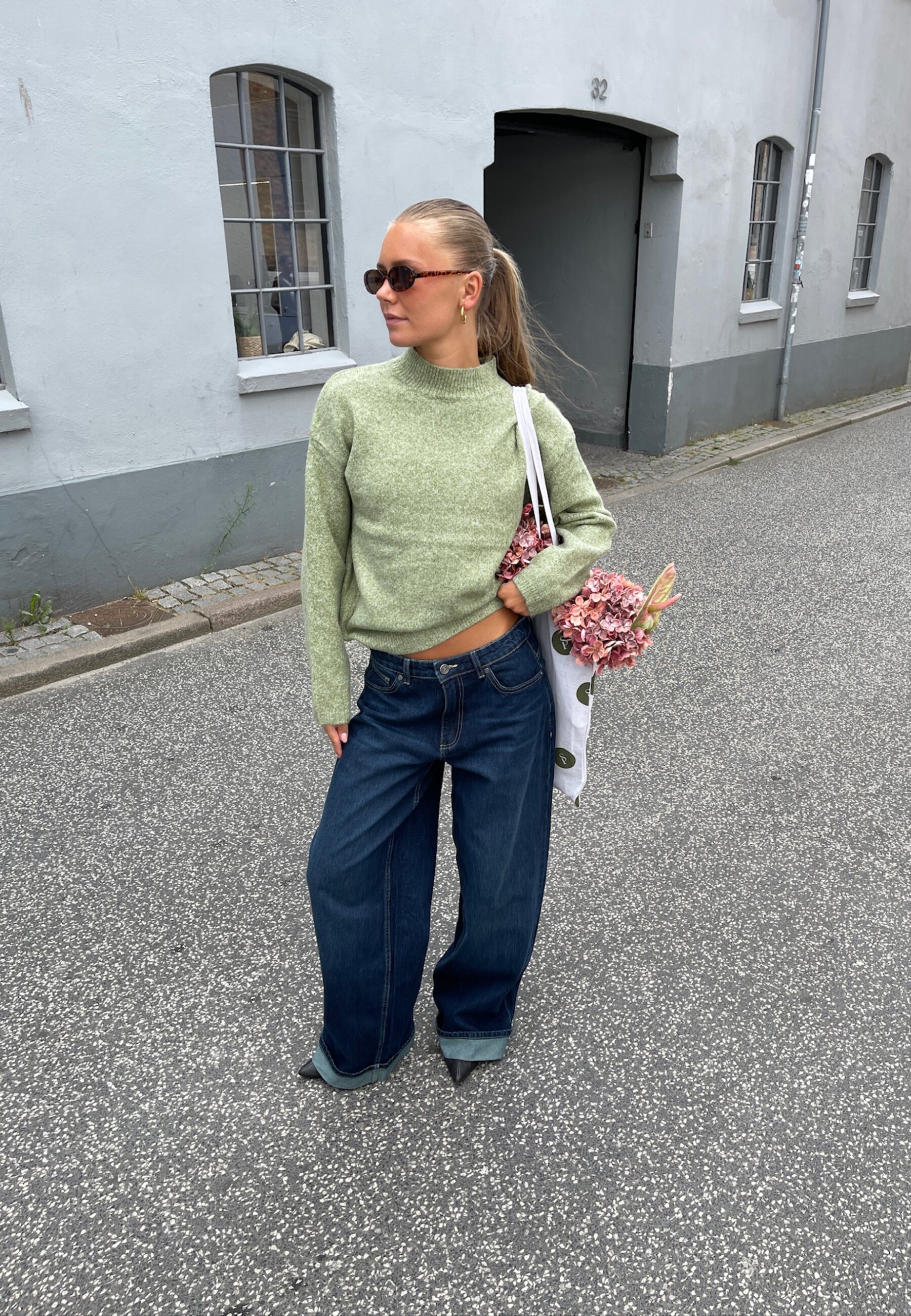 OLLIE-JE is a pair of dark blue wide-leg jeans with cuffed hems and a high waist, offering a modern and relaxed look. The model wears size S.