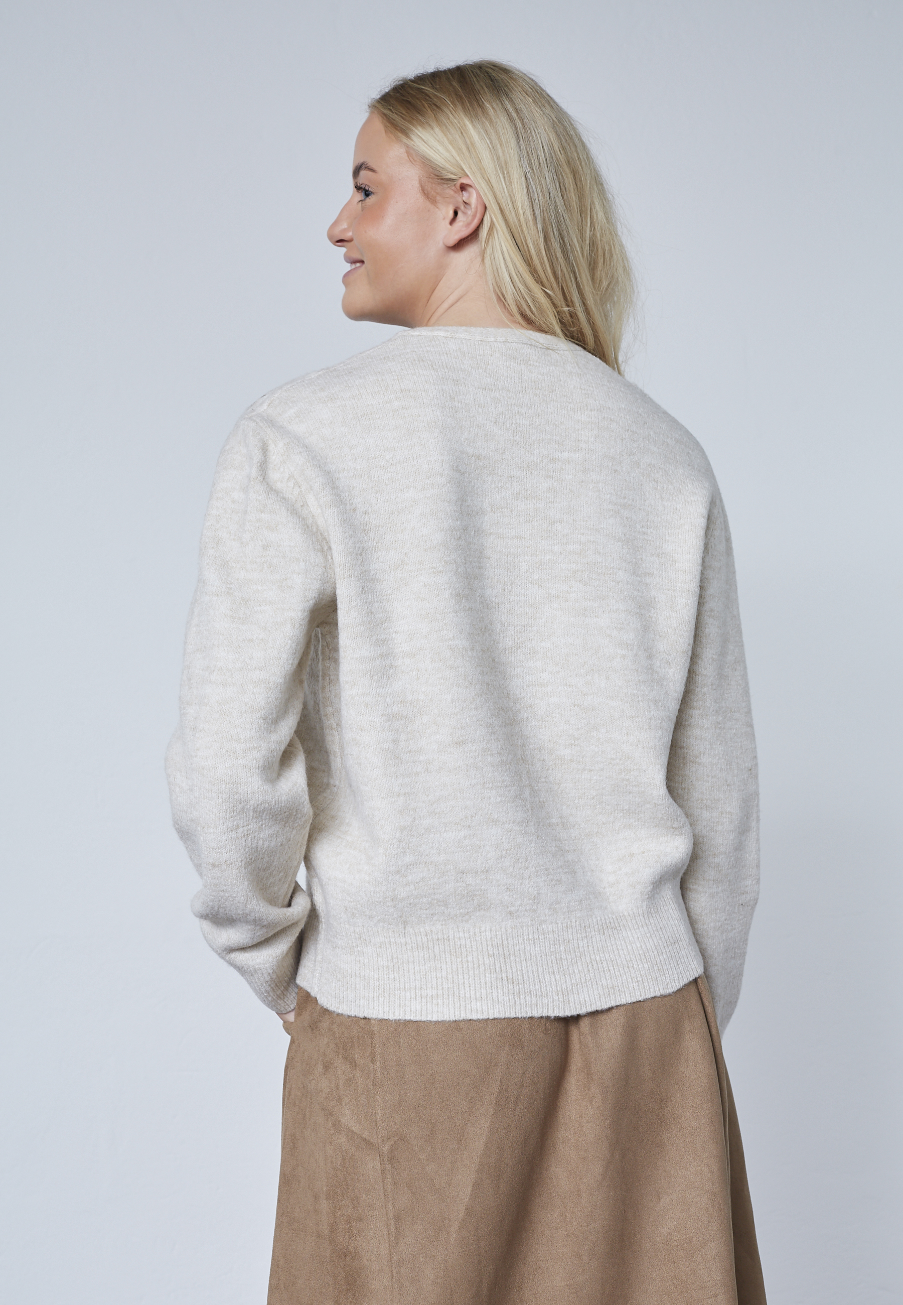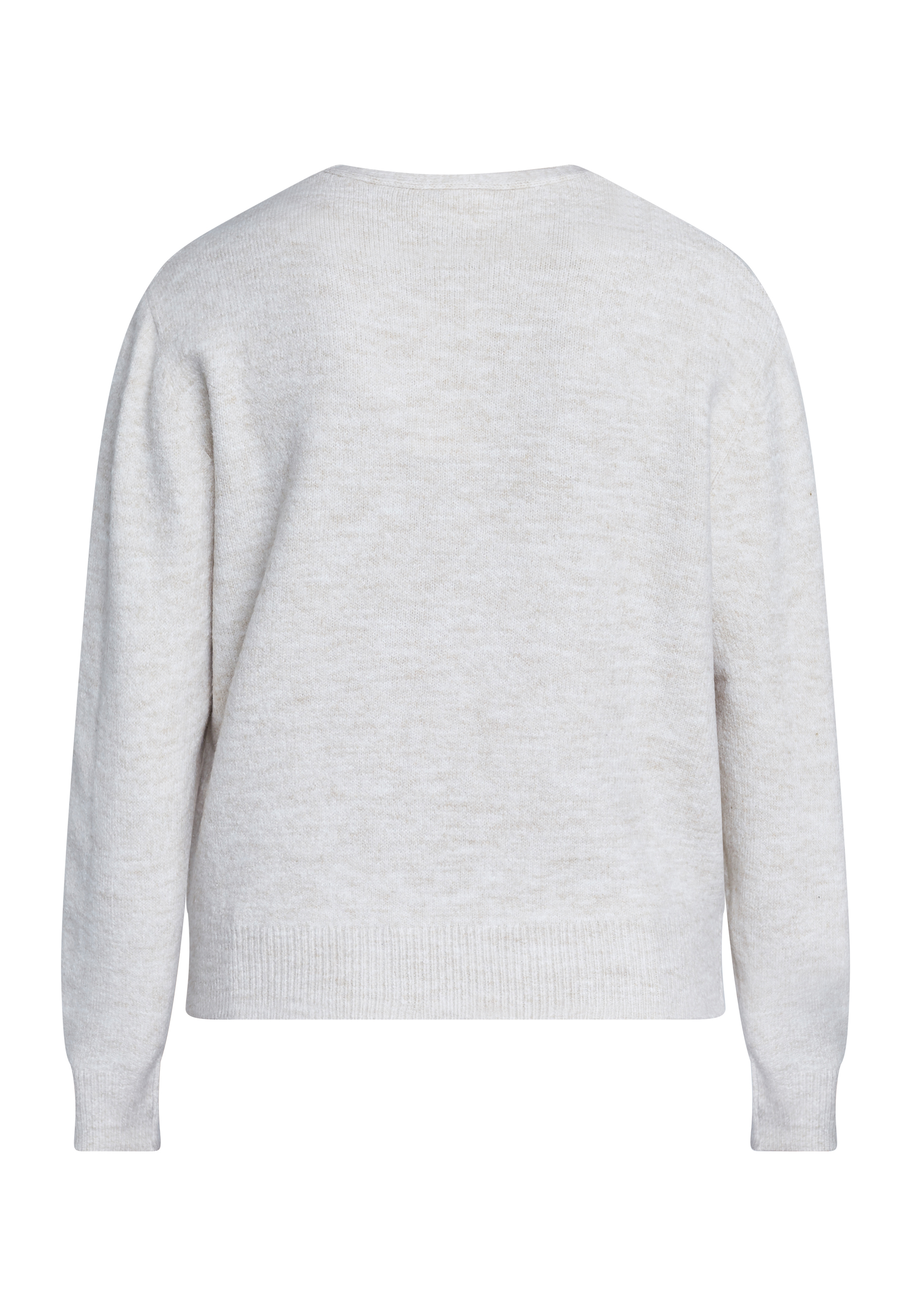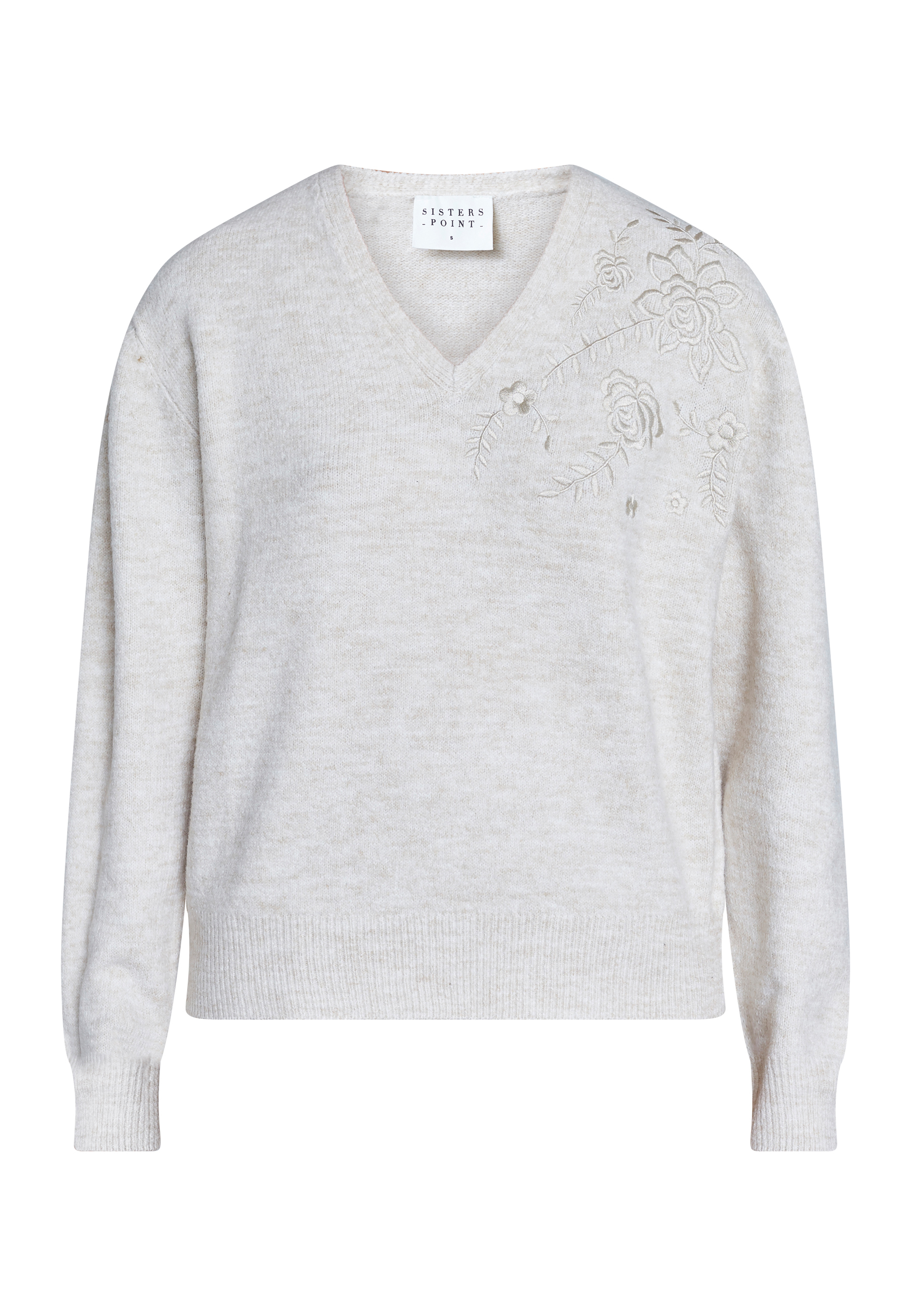 HUVA-PU is a knitted V-neck pullover featuring intricate floral embroidery across the bust and shoulders. Ribbed cuffs and hem for a comfortable fit. The model is wearing size S.