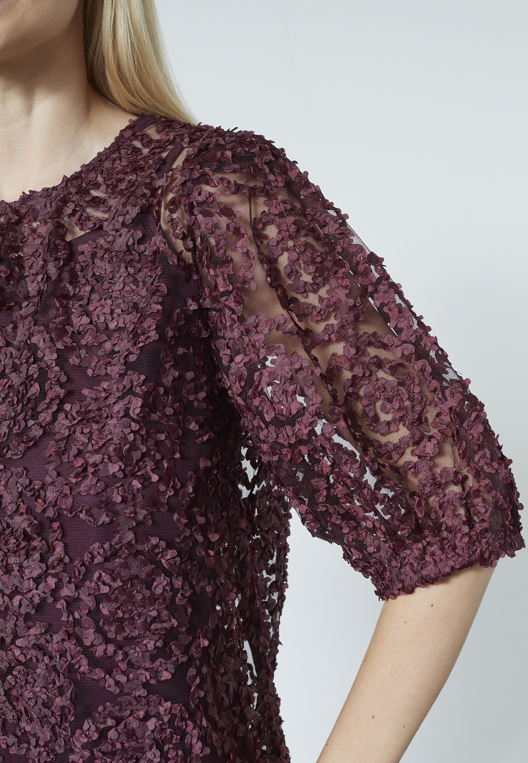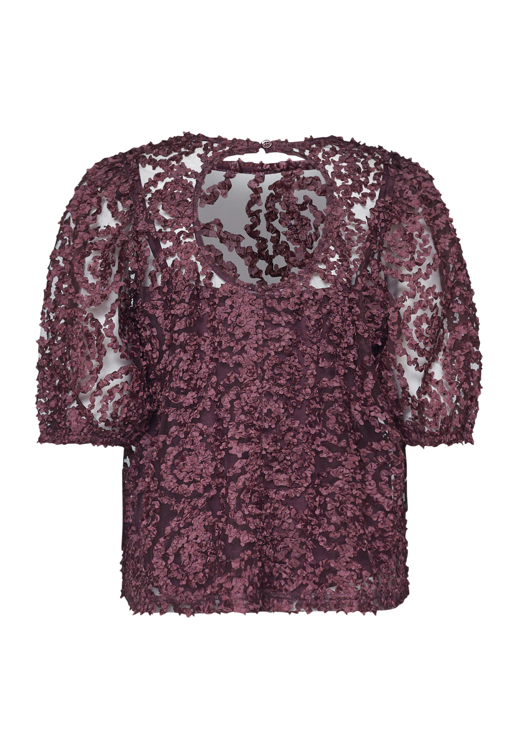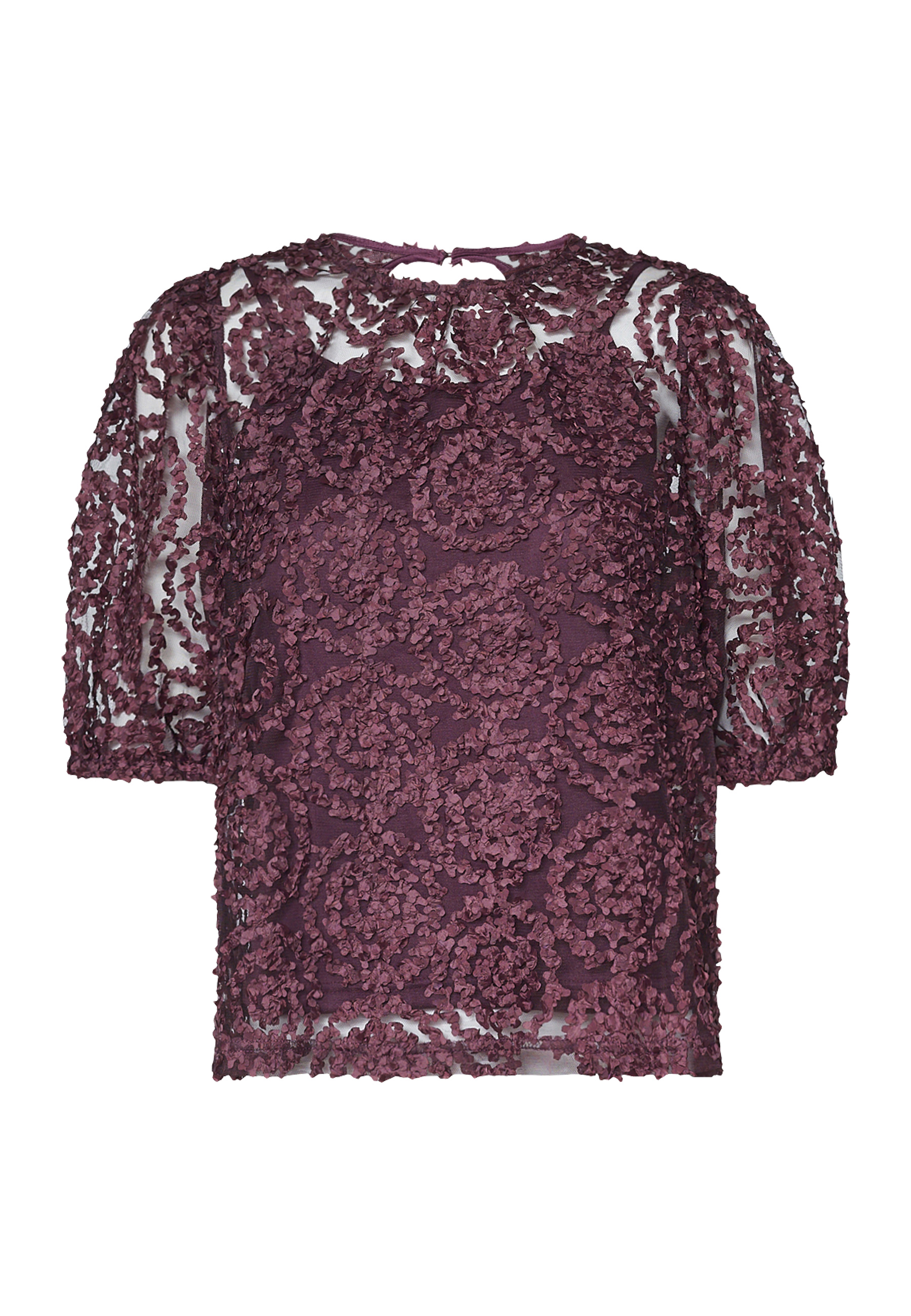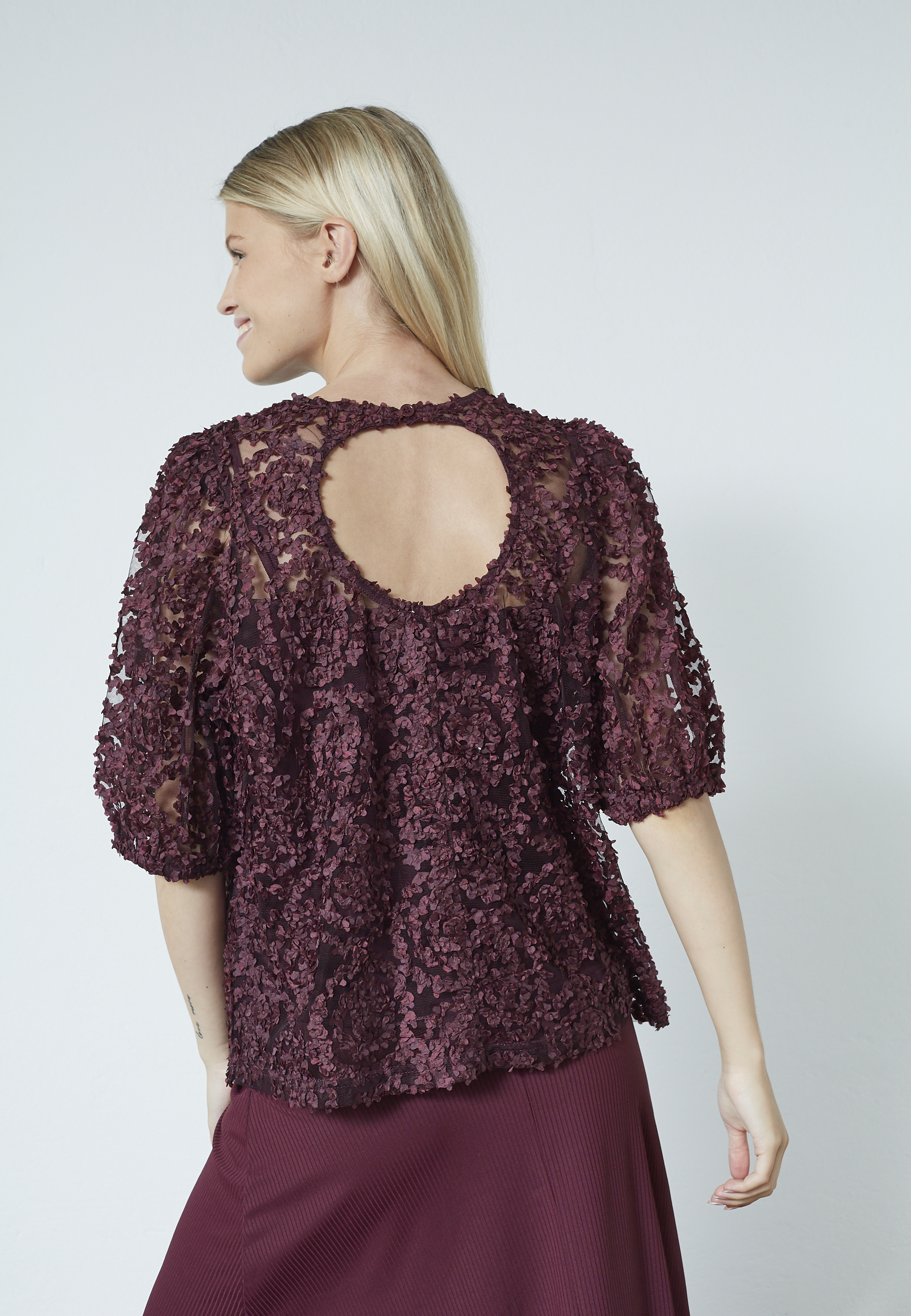 VEMBA-SS is a elegant lace top with floral details and short sleeves. The model wears size S.