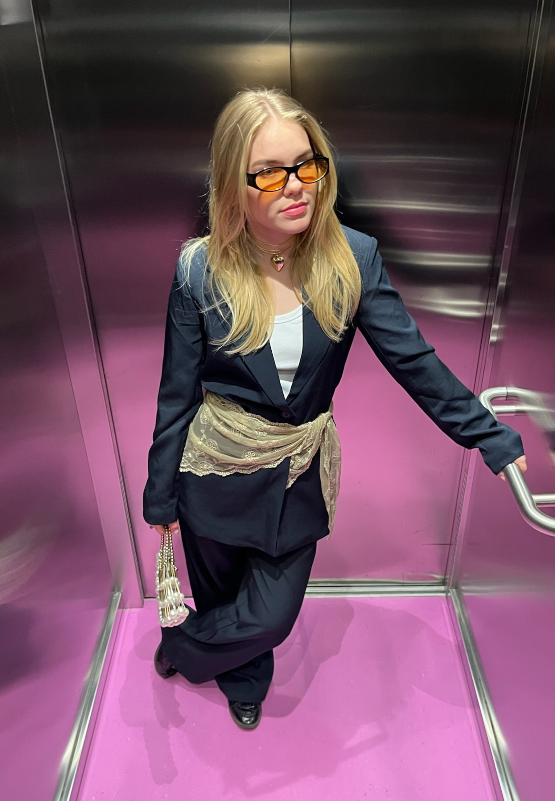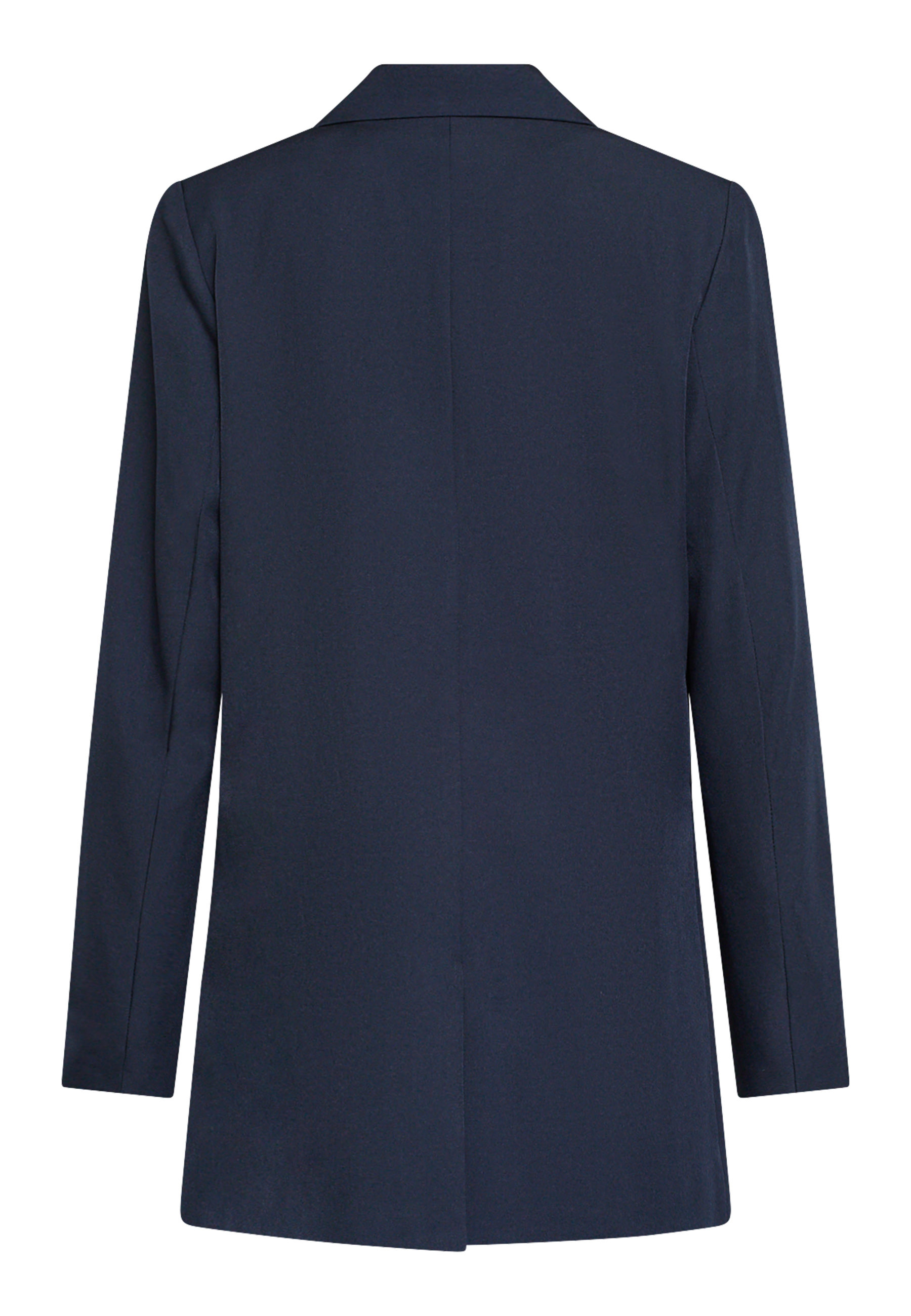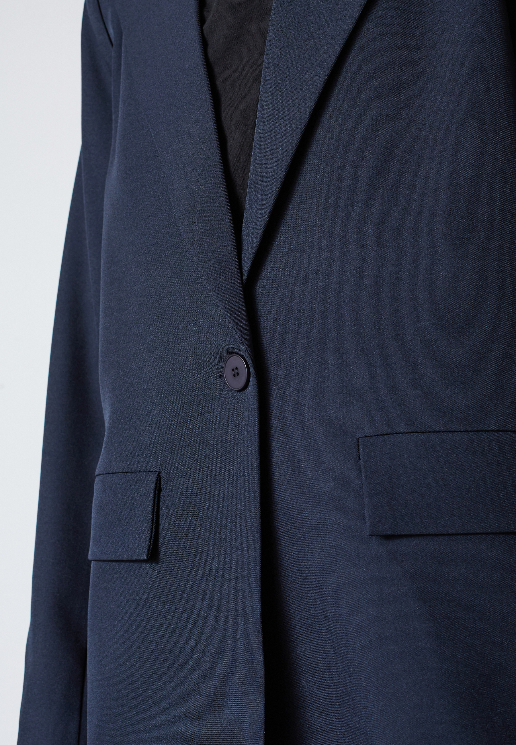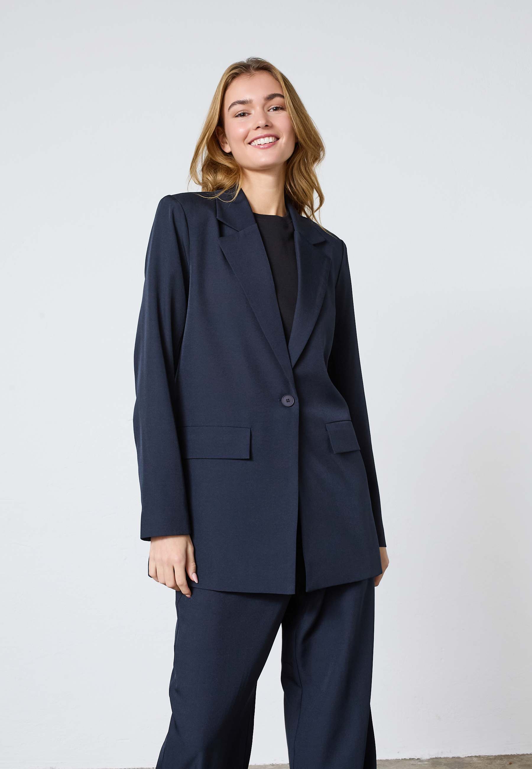 VIKSA-BL is a blazer with a collar and a button in the front. The blazer has three decorative buttons on the sleeves and two pockets in the front. The model is wearing a size S.