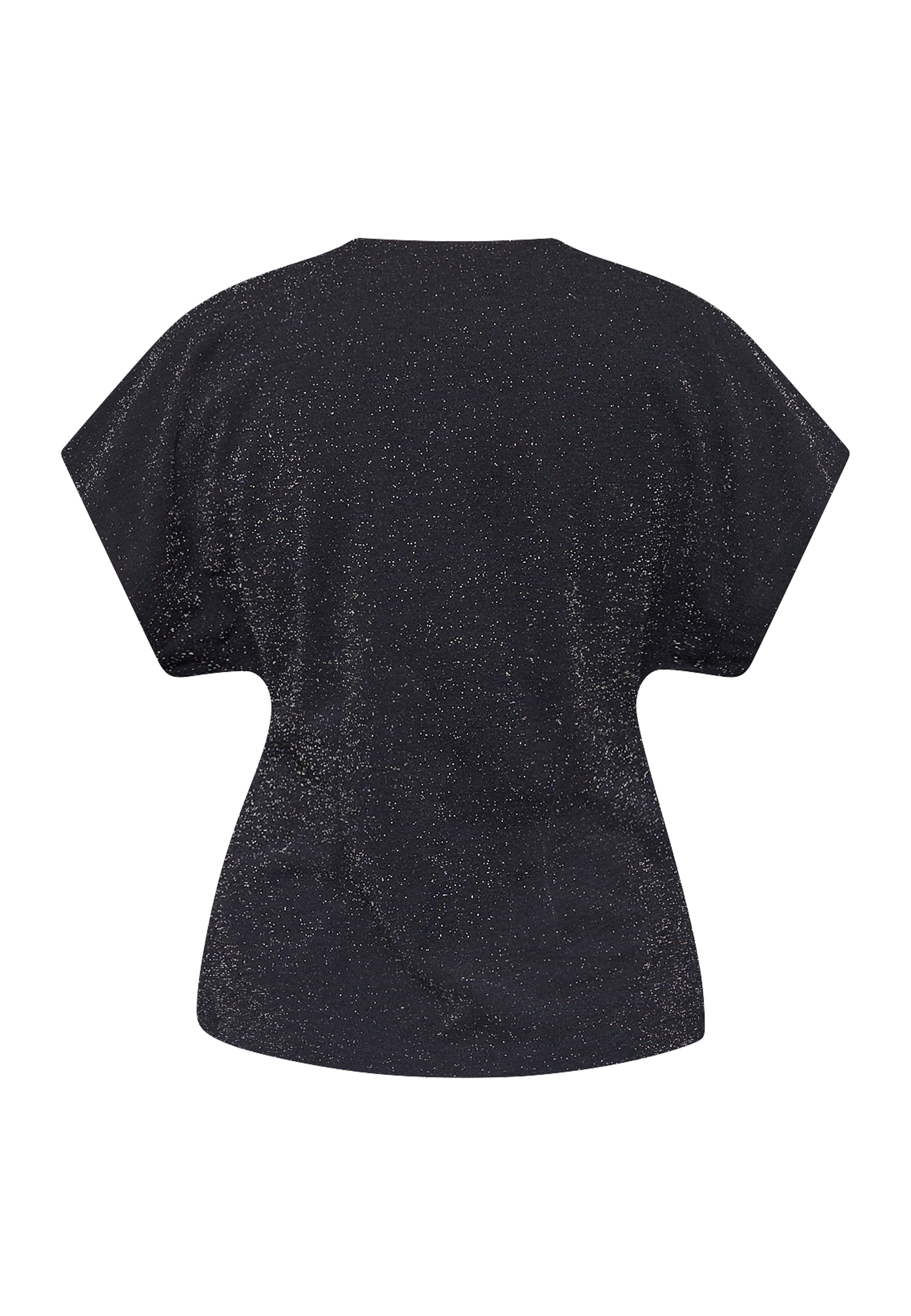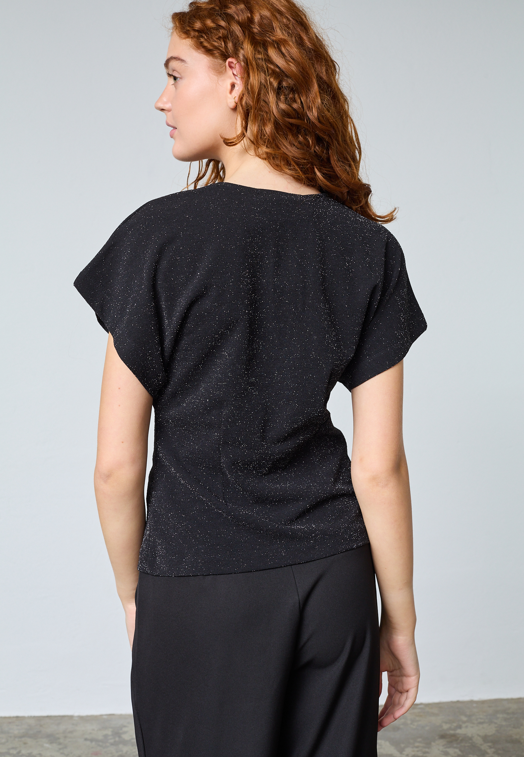 GEVELA-VE3 is a short-sleeved top with a deep V-neckline and an asymmetrical side closure with a single gold button. The top has slightly marked shoulders and a fitted silhouette. The model has a size S on.