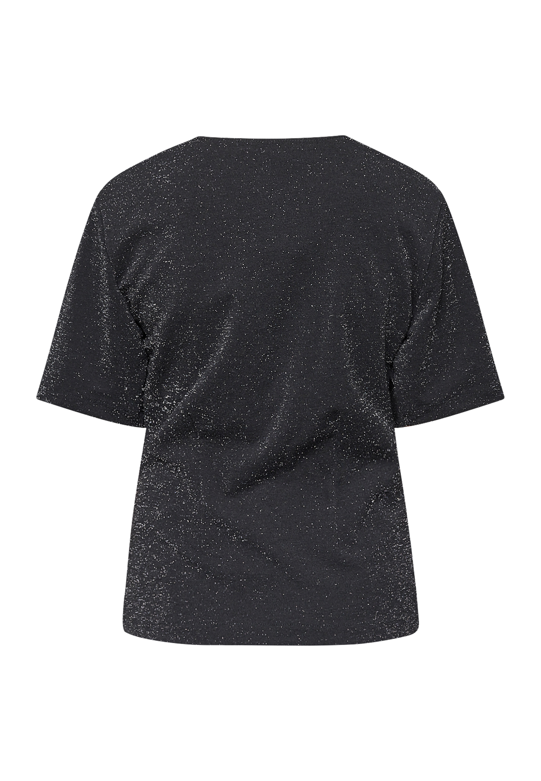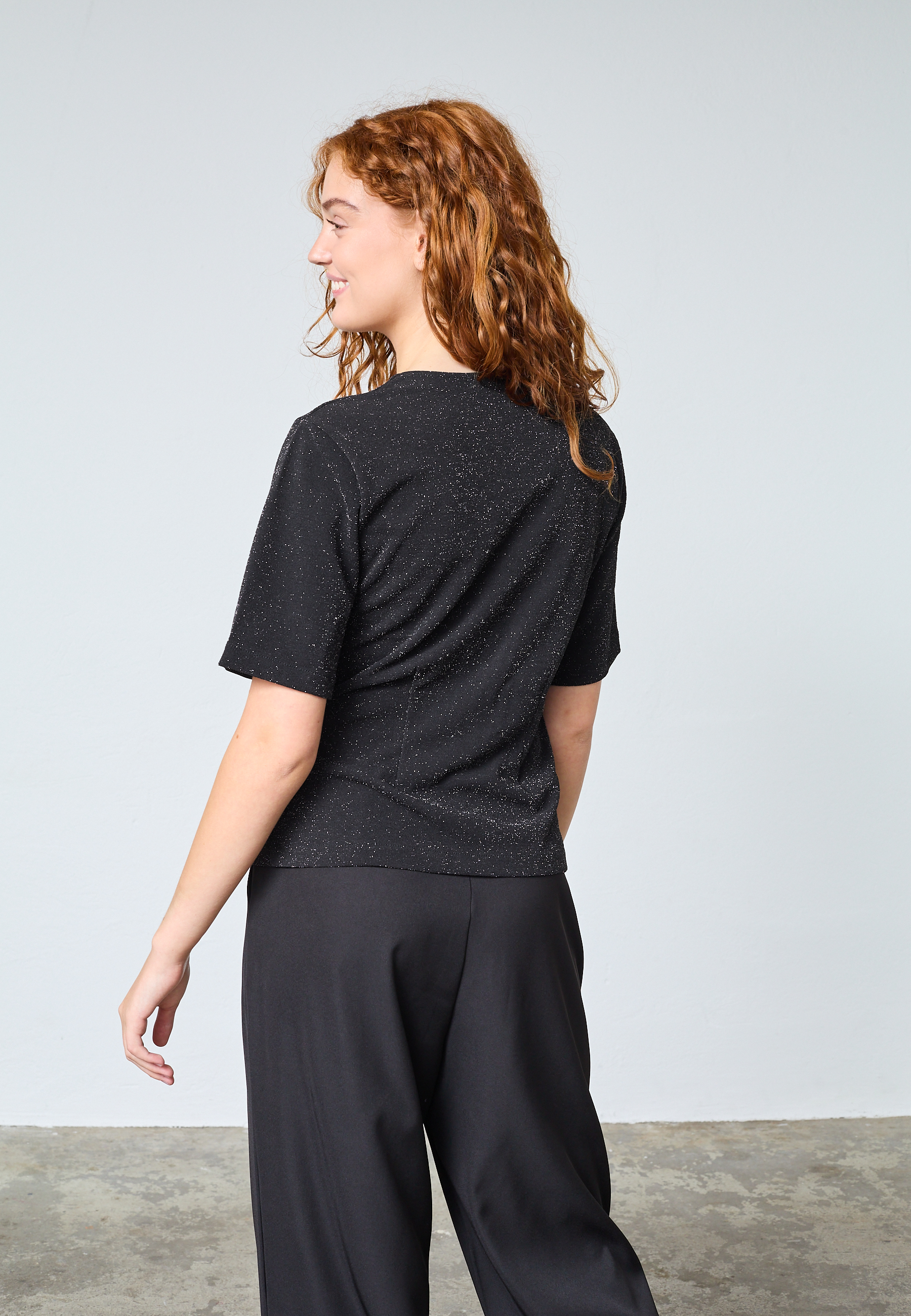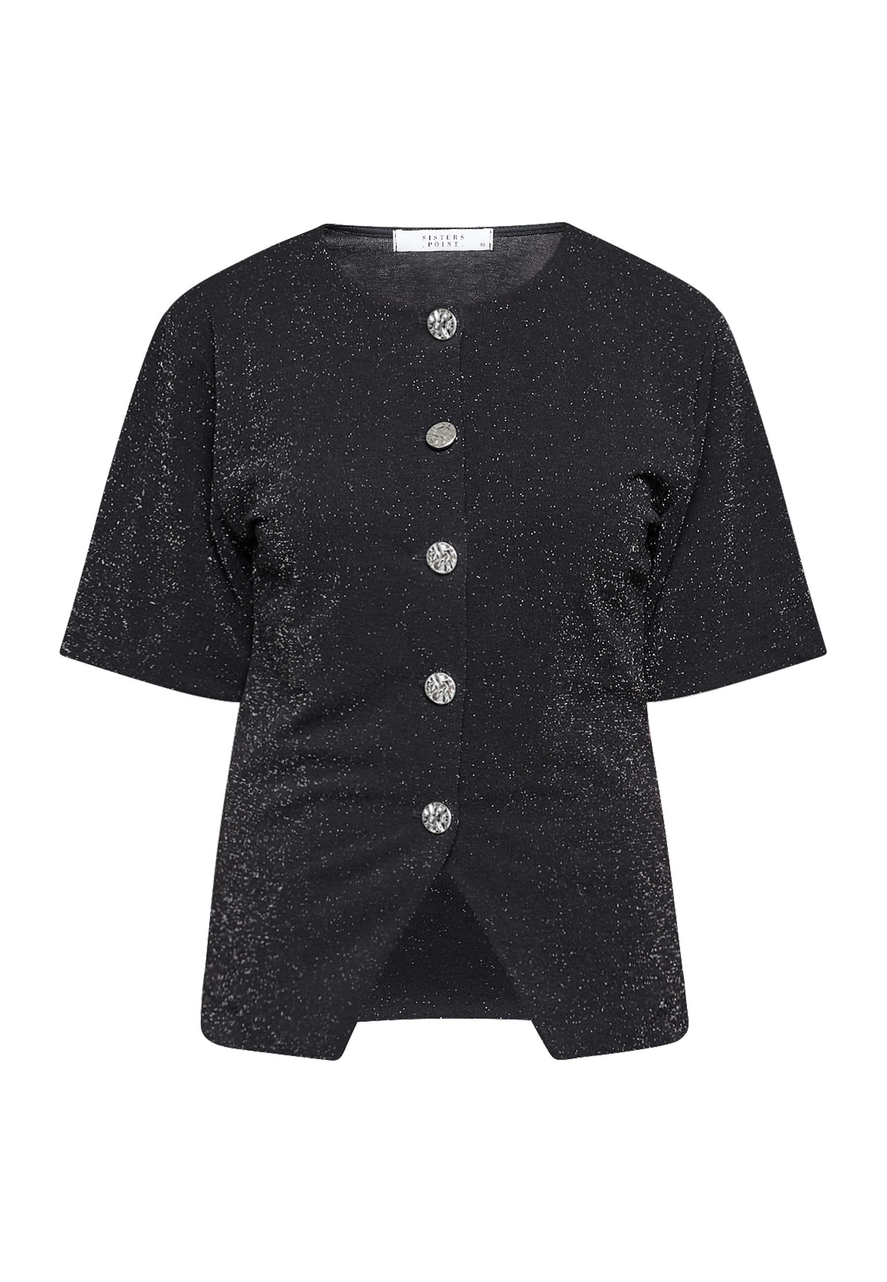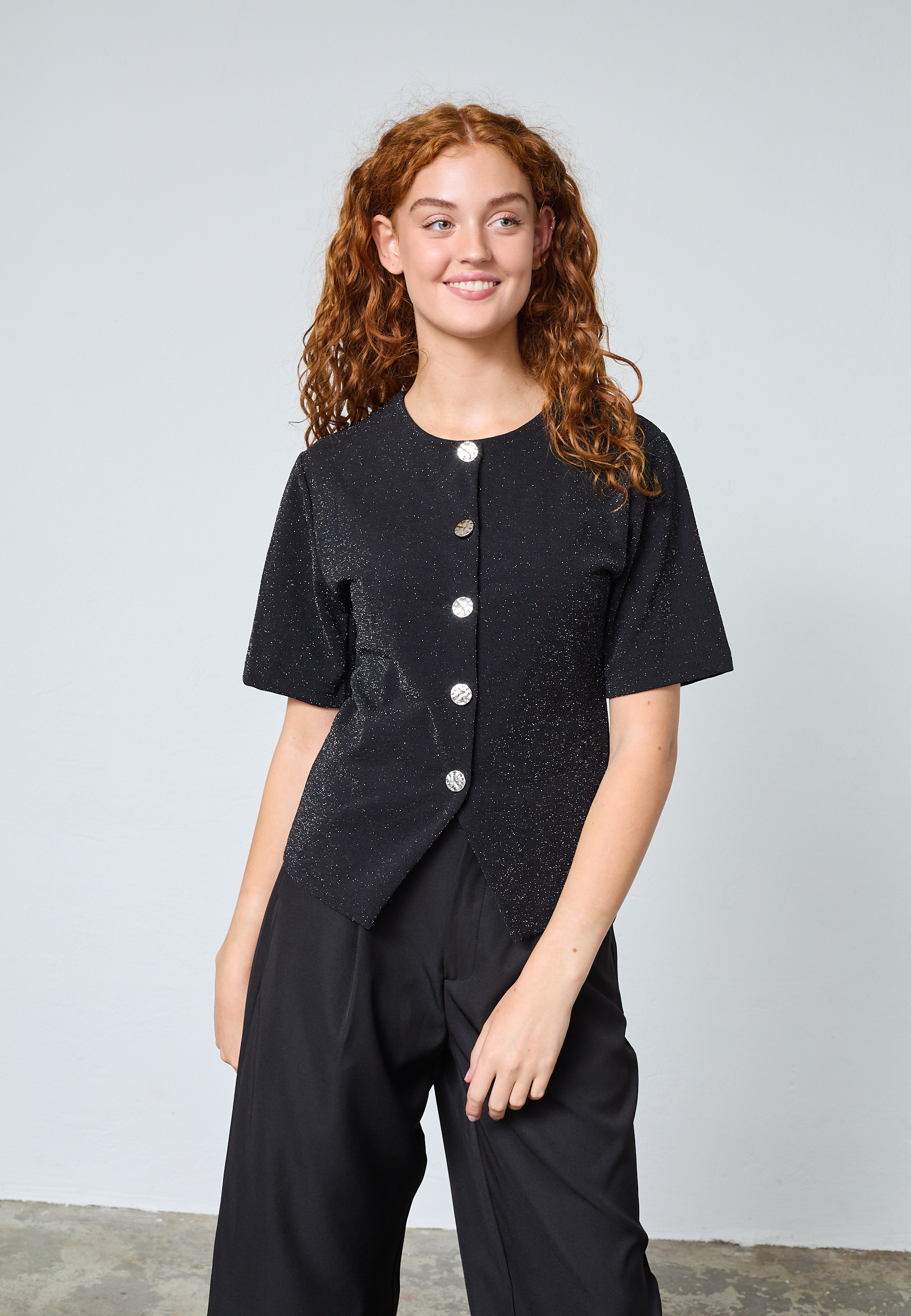 GOVA-TOP1 is a stylish top with short sleeves and a round neckline. The top has a button closure with decorative buttons and a fitted fit that accentuates the waist. The model is wearing a size S.