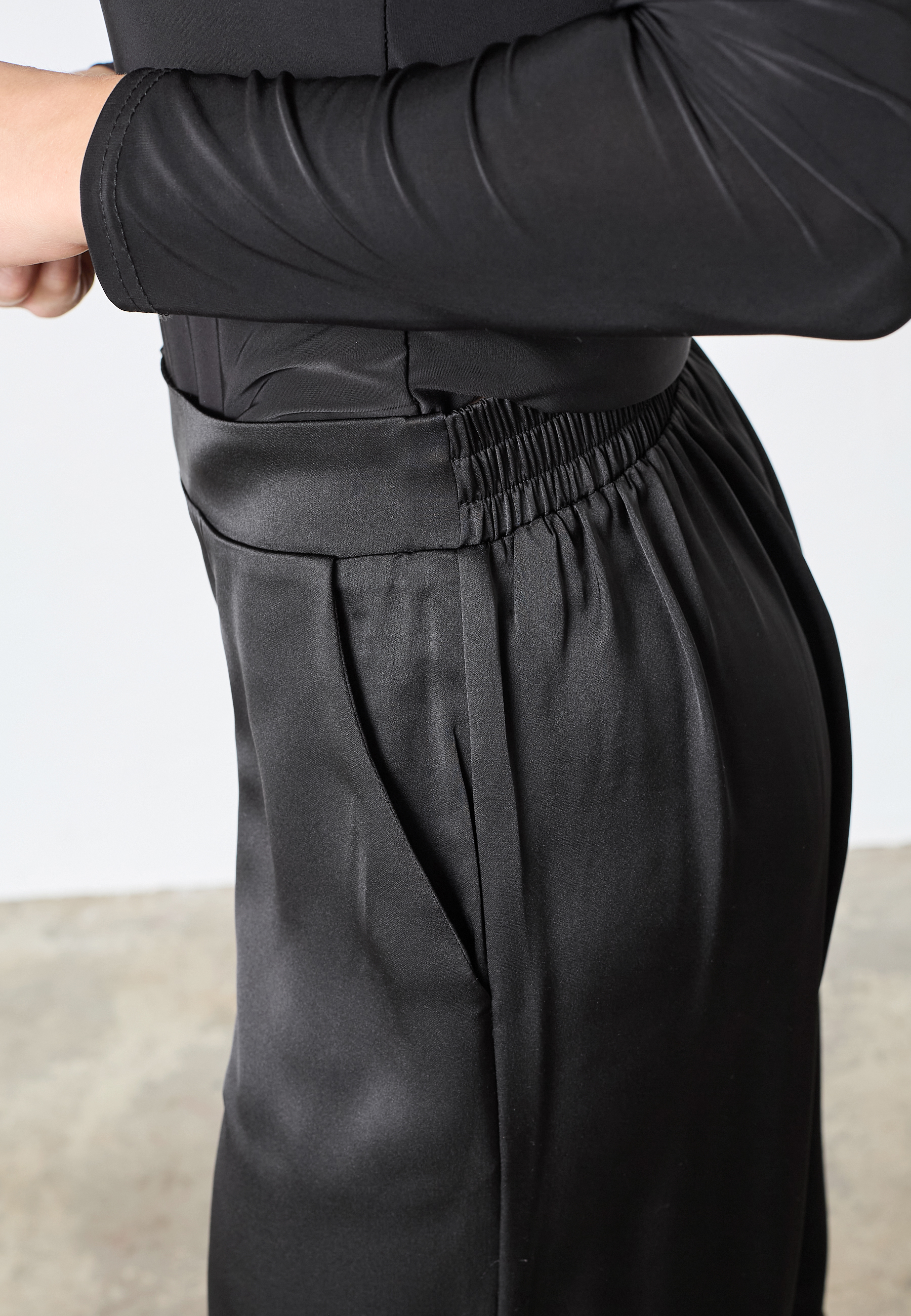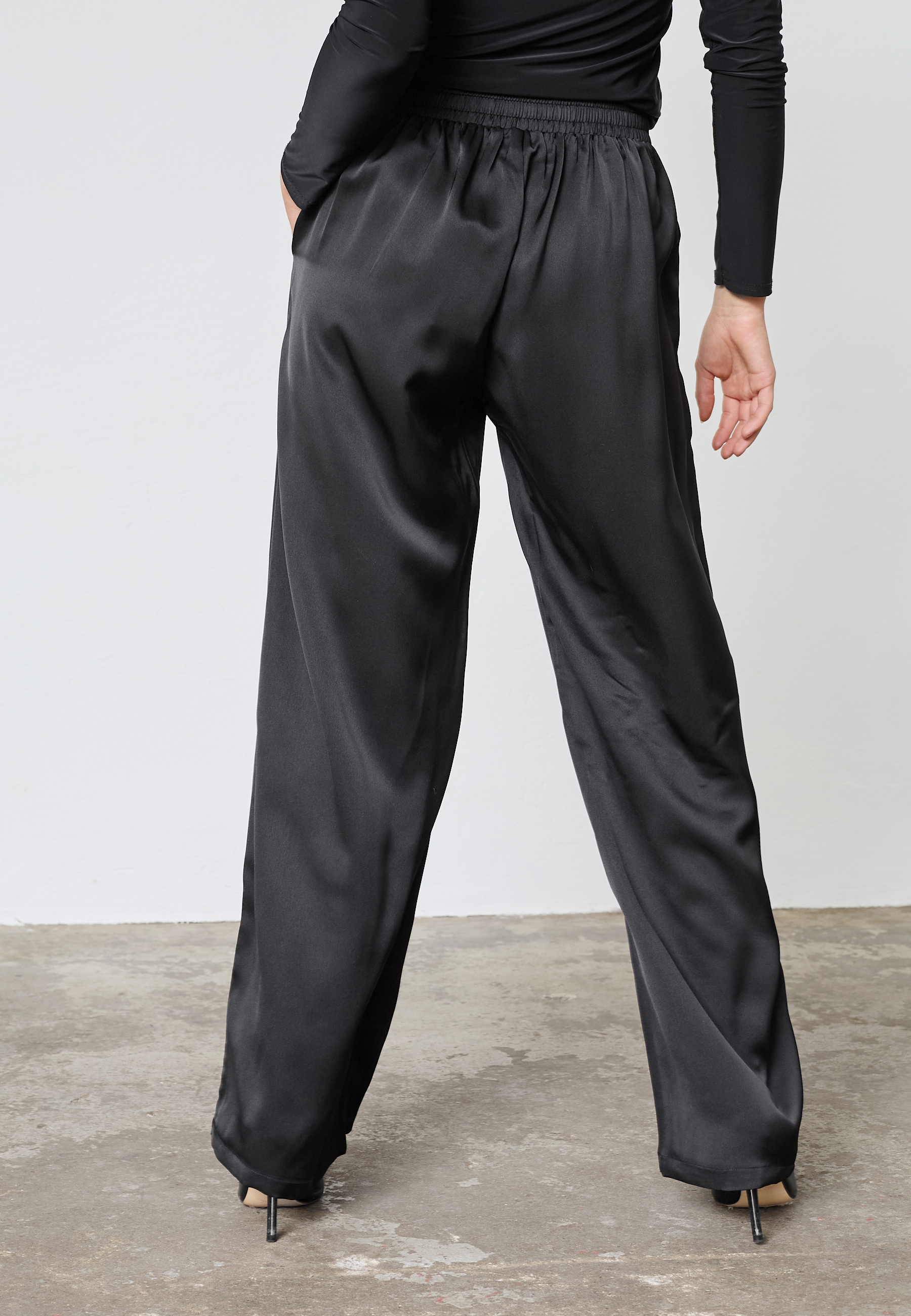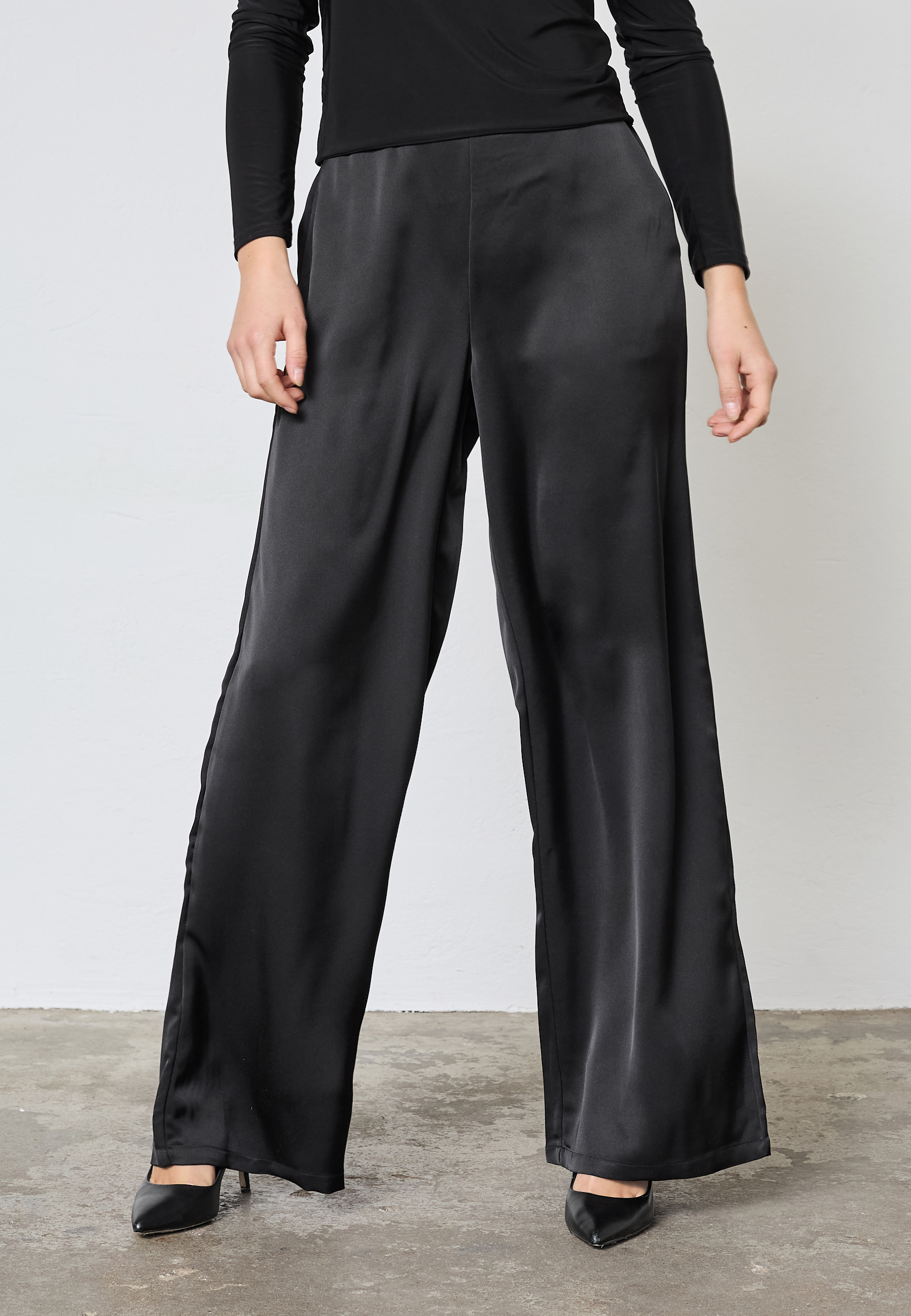 VERINA-PA5 is a pair of relaxed trousers with wide, straight legs in a satin-like fabric. The trousers have an elastic waistband and side pockets. The model is wearing a size S