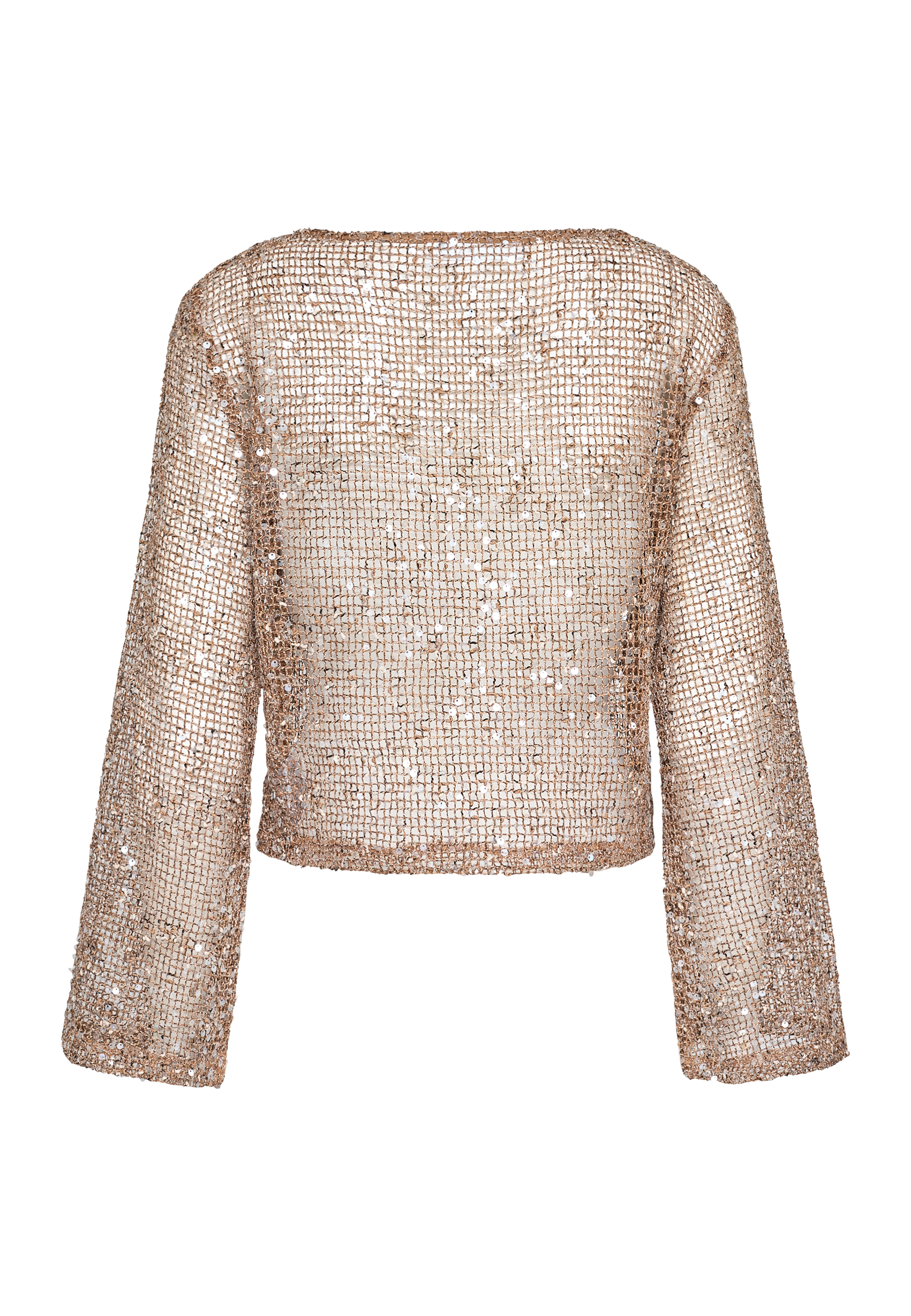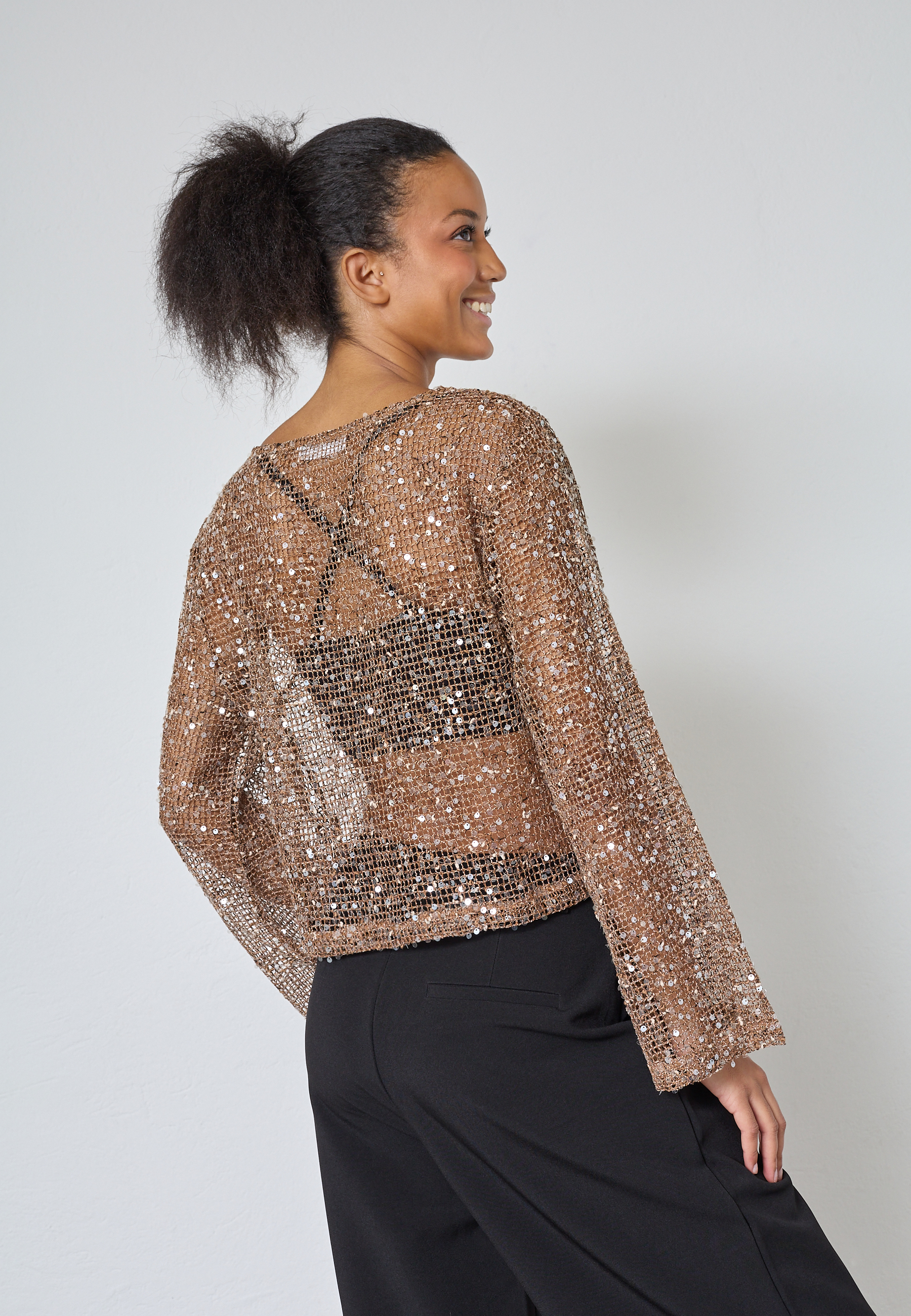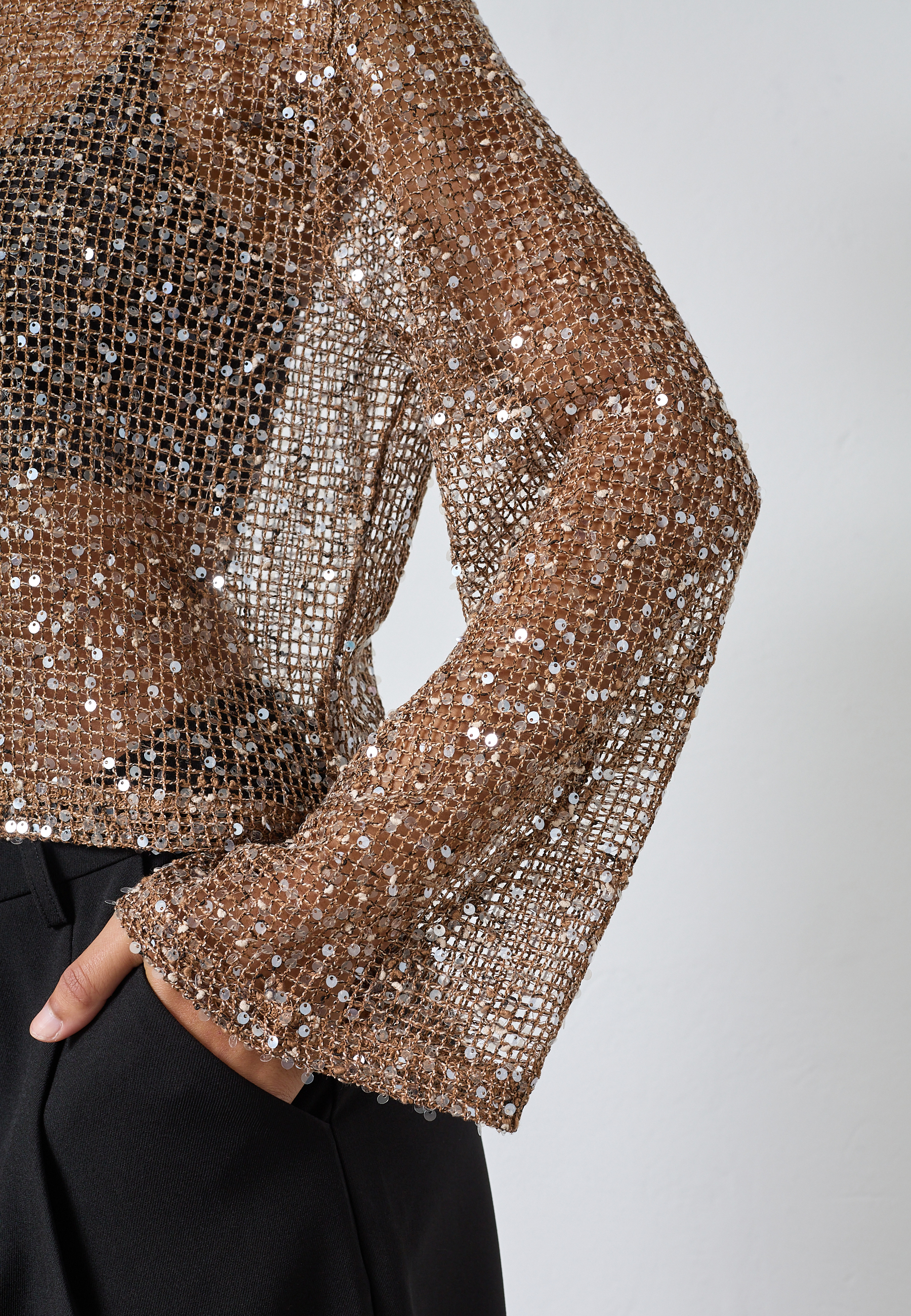 GLISA-LS is a long-sleeved top covered in sparkling sequins and features a sheer mesh design. The top's sleeves have a slight flare at the cuffs. The model is wearing a size S