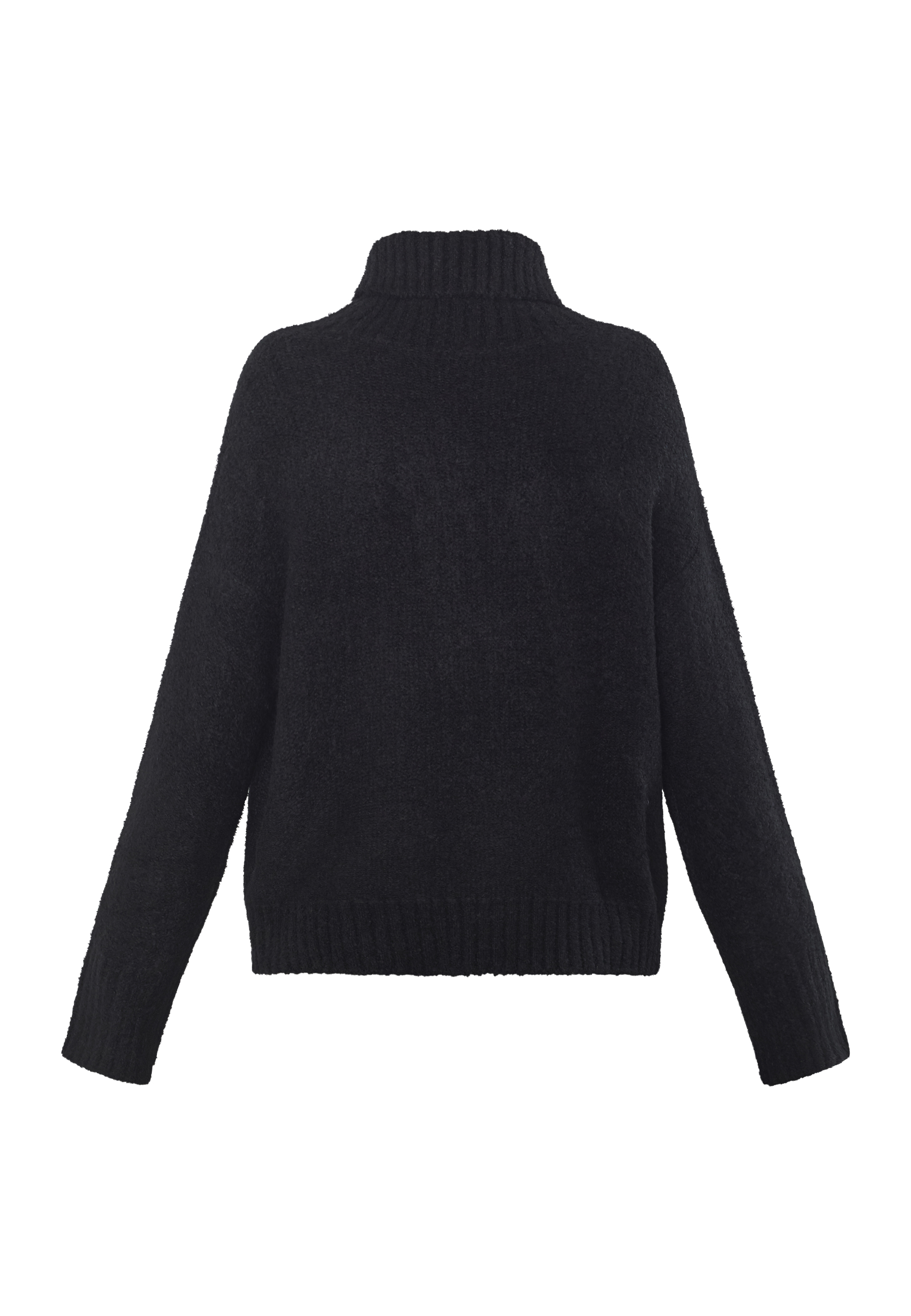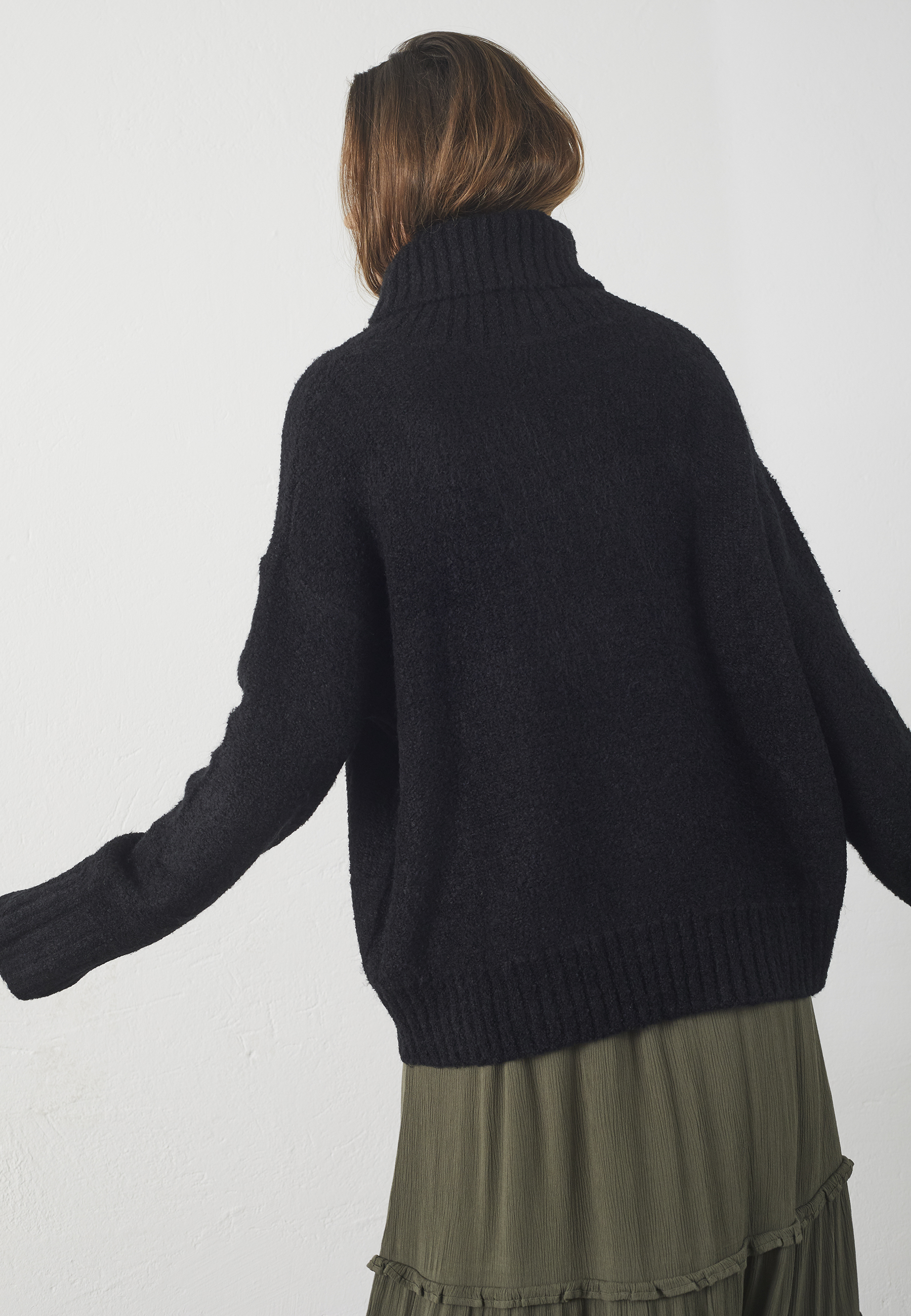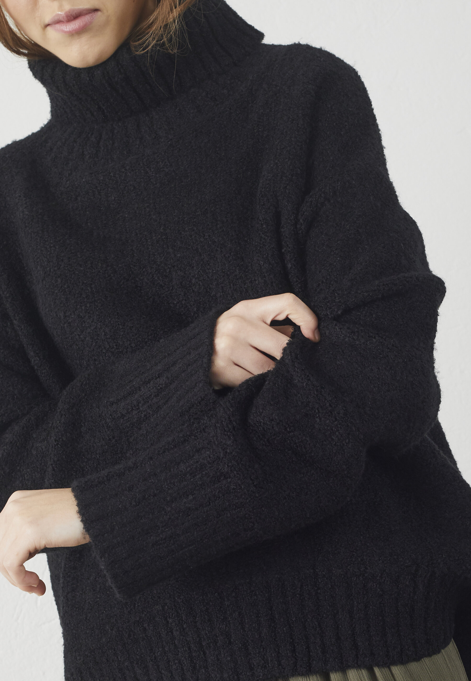 HEMMA-PU is a knitted sweater with a high neck and long sleeves. The shirt has a loose fit and is made of a soft material with a light texture. It has ribbed edges at the neck, sleeves and hem. The model has a size S on.