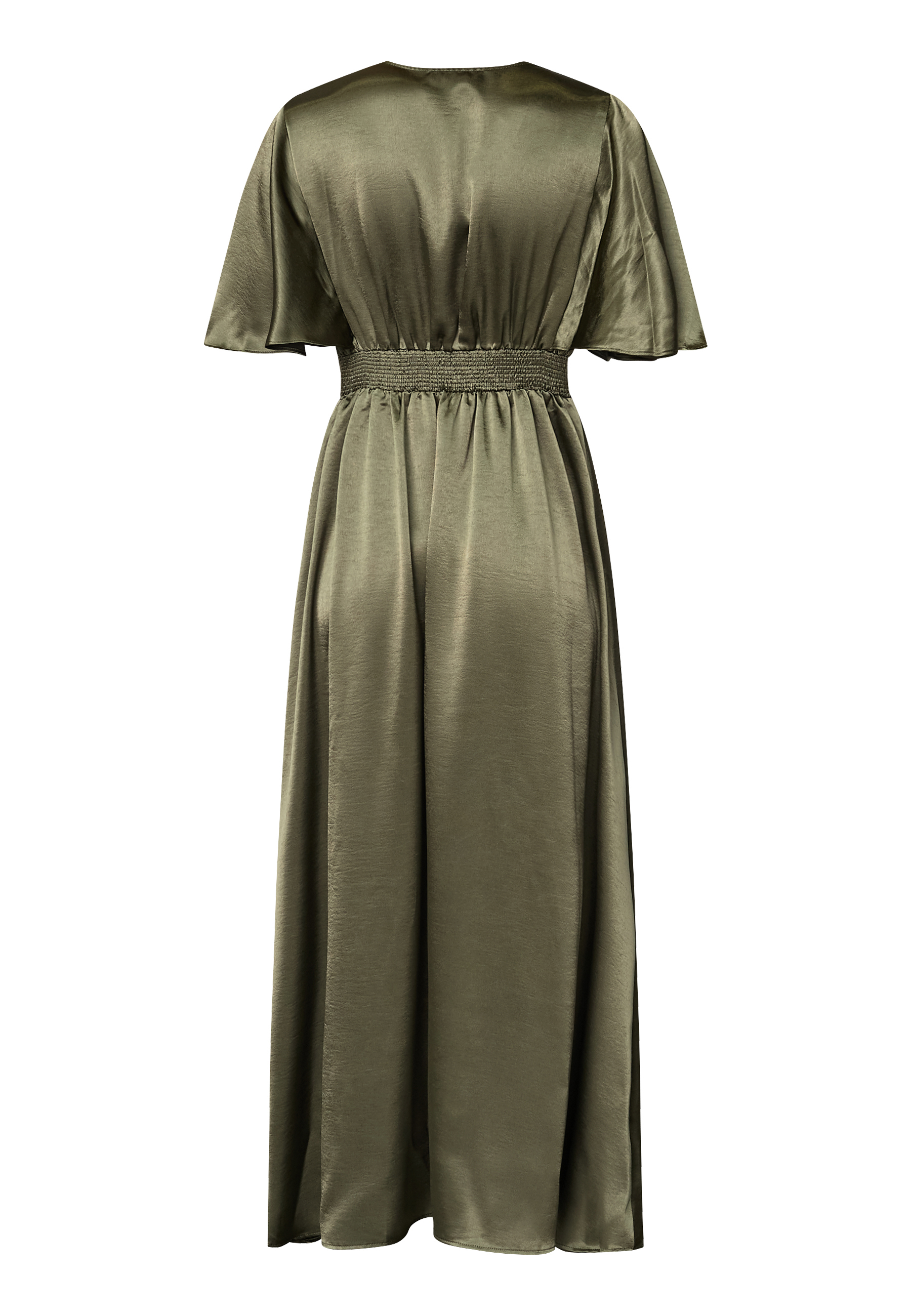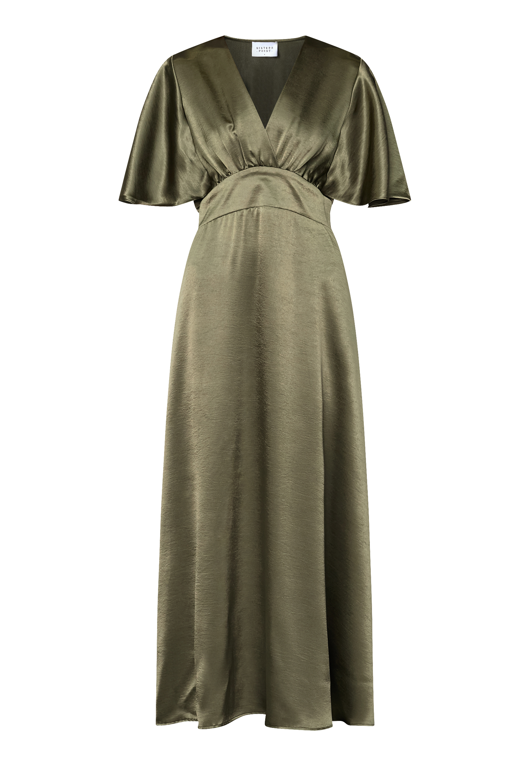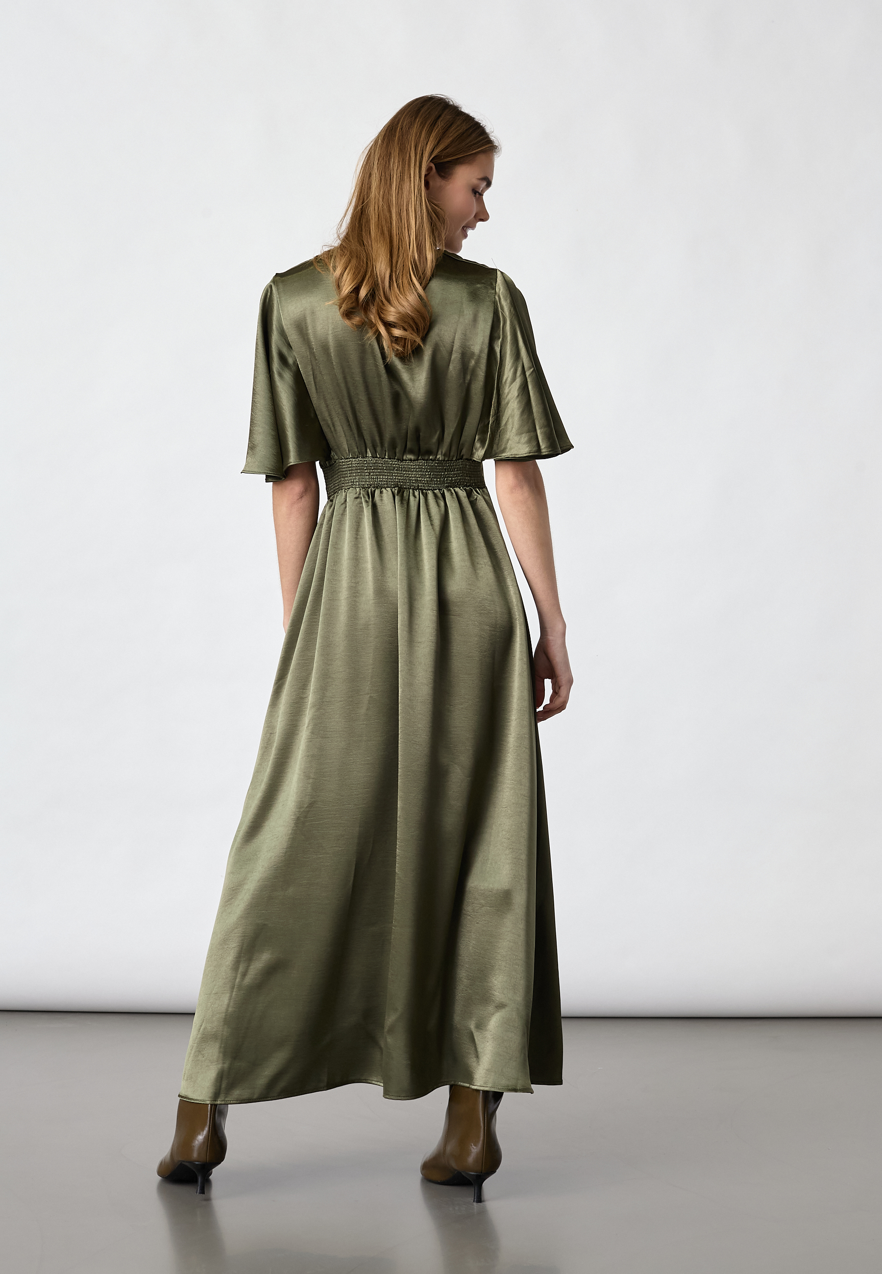 GISELA-DR16 is an elegant, long dress in a smooth, shiny quality. The dress features a flattering V-neckline with a wrap effect, short batwing sleeves, and a wide waistband at the waist, creating a beautiful silhouette. The model is wearing a size S.
