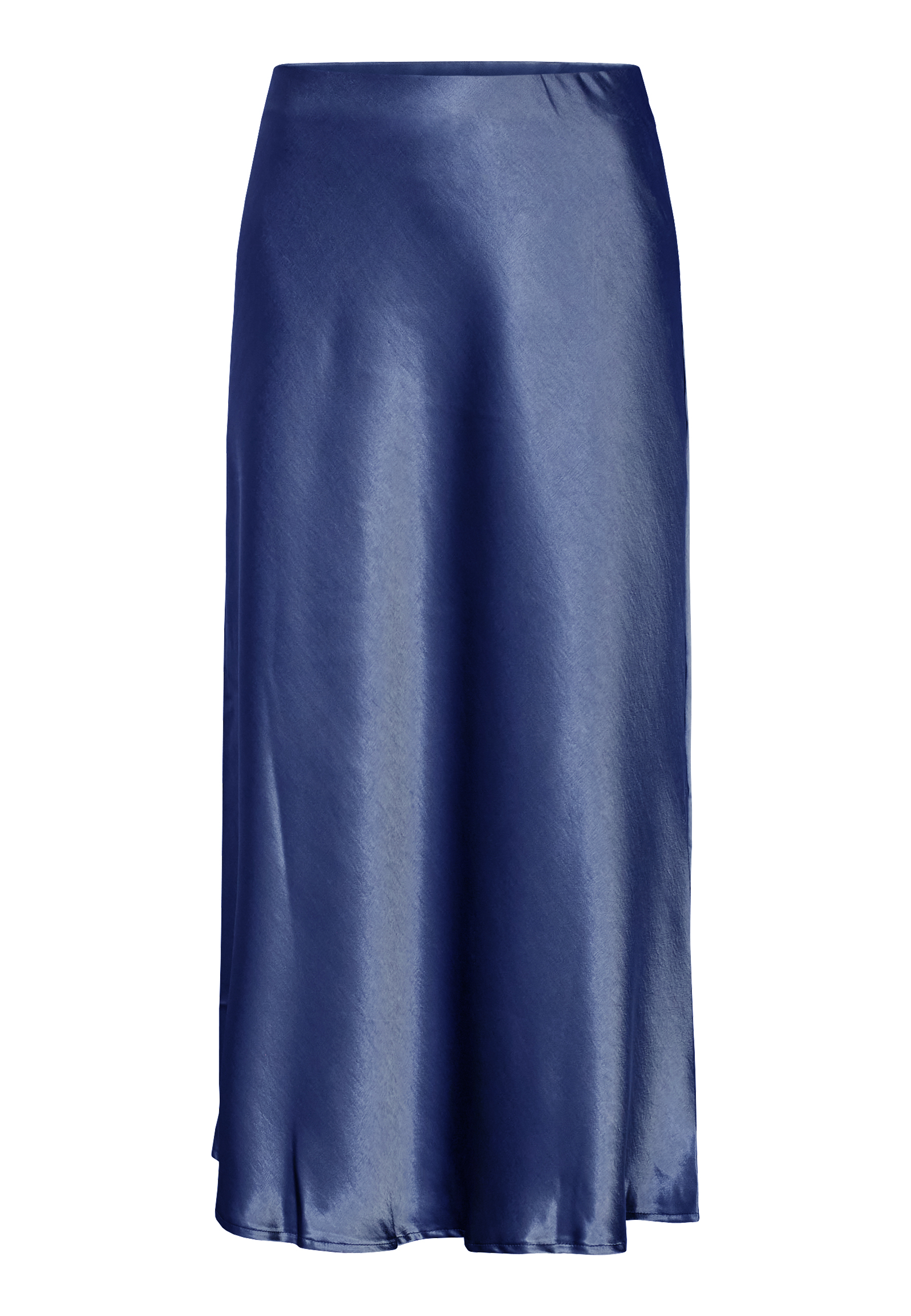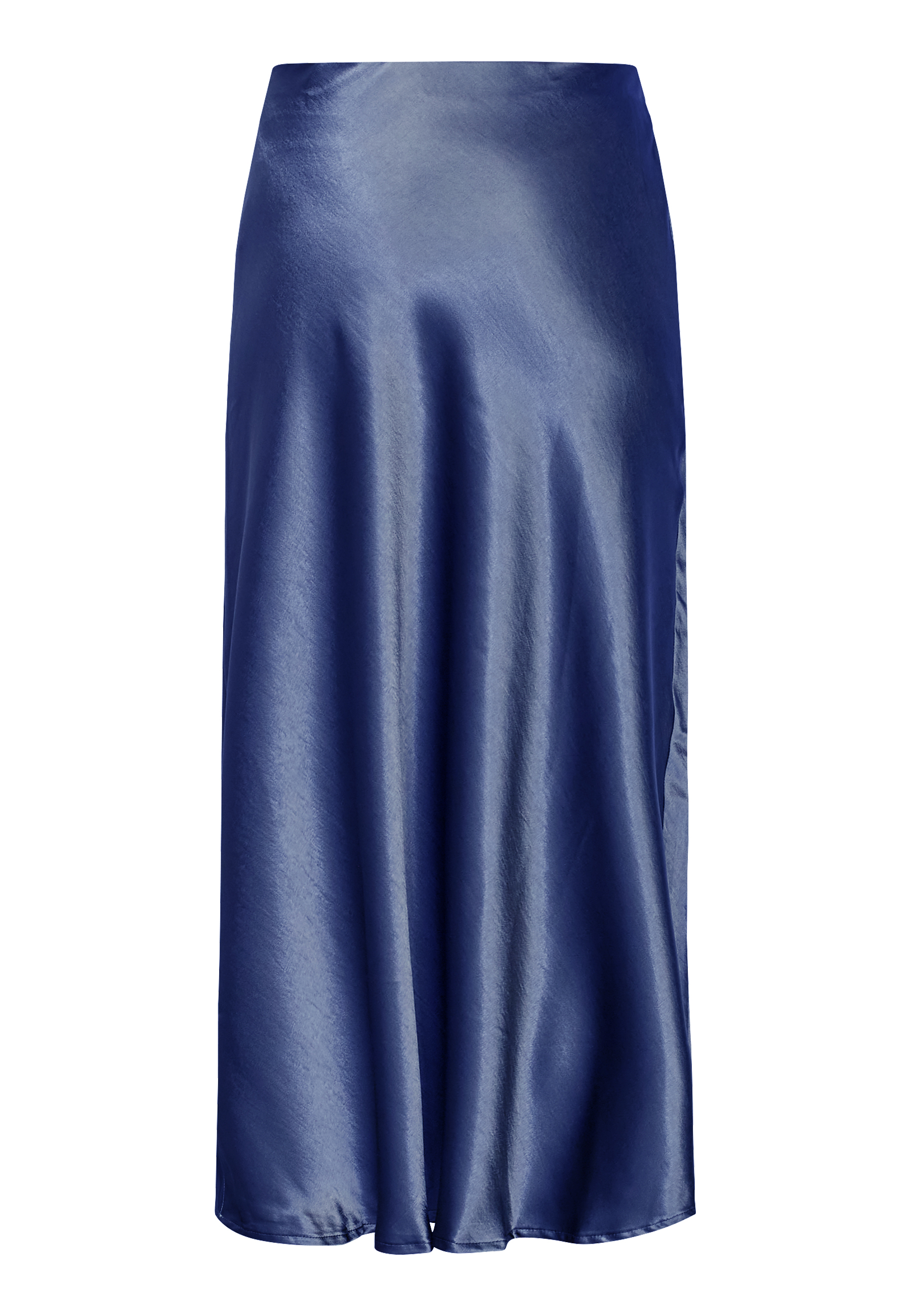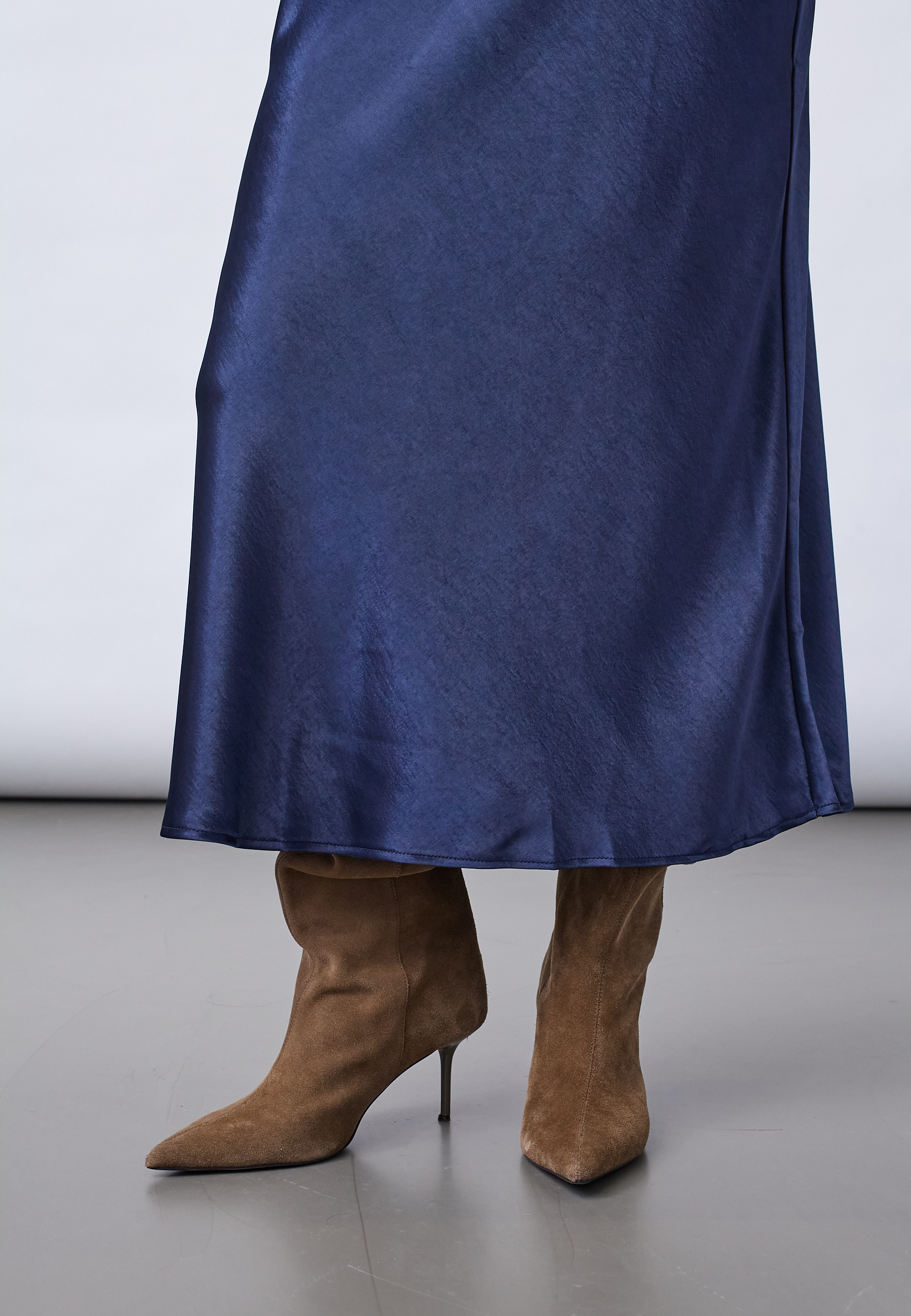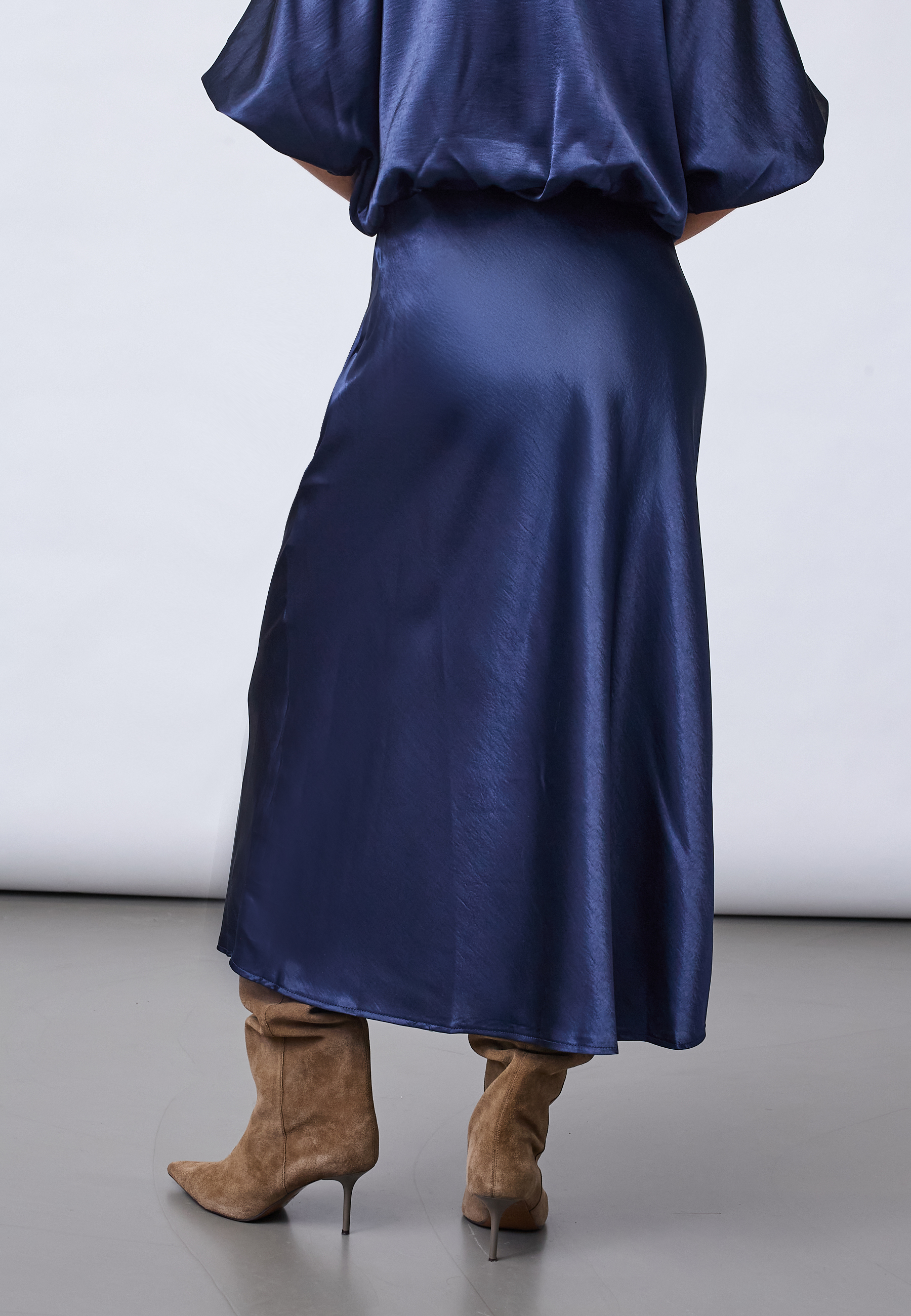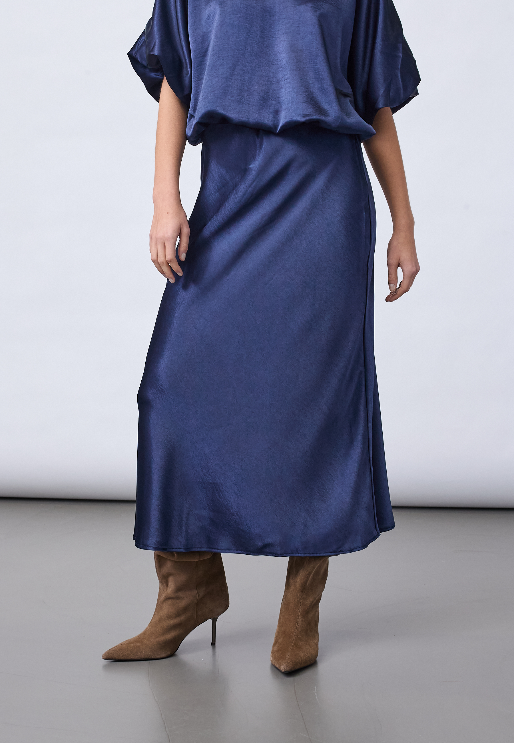 N.GEWO-SK4 is a satin midi-skirt features a flattering A-line cut, elegantly highlighting the figure. Model wears size S.