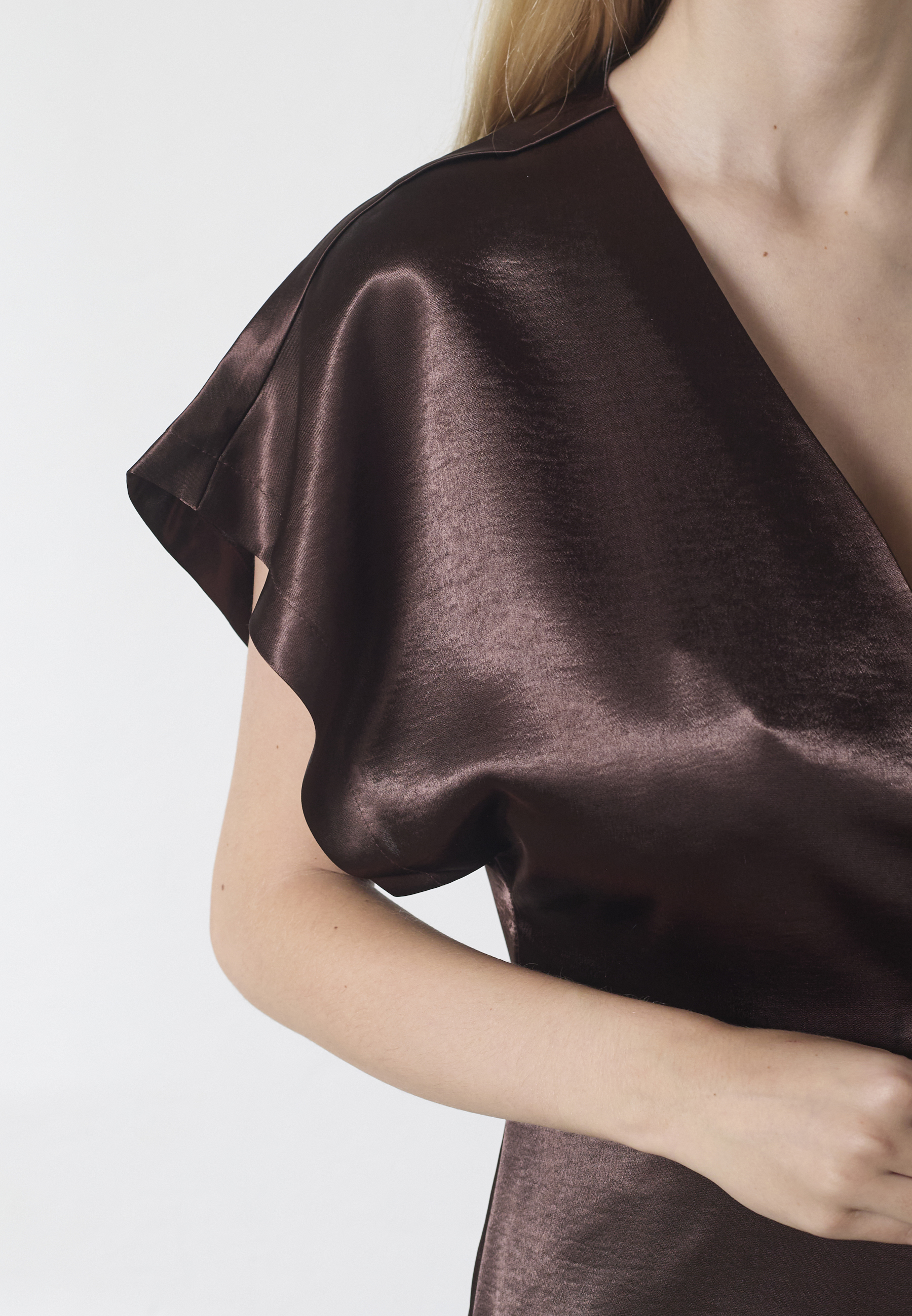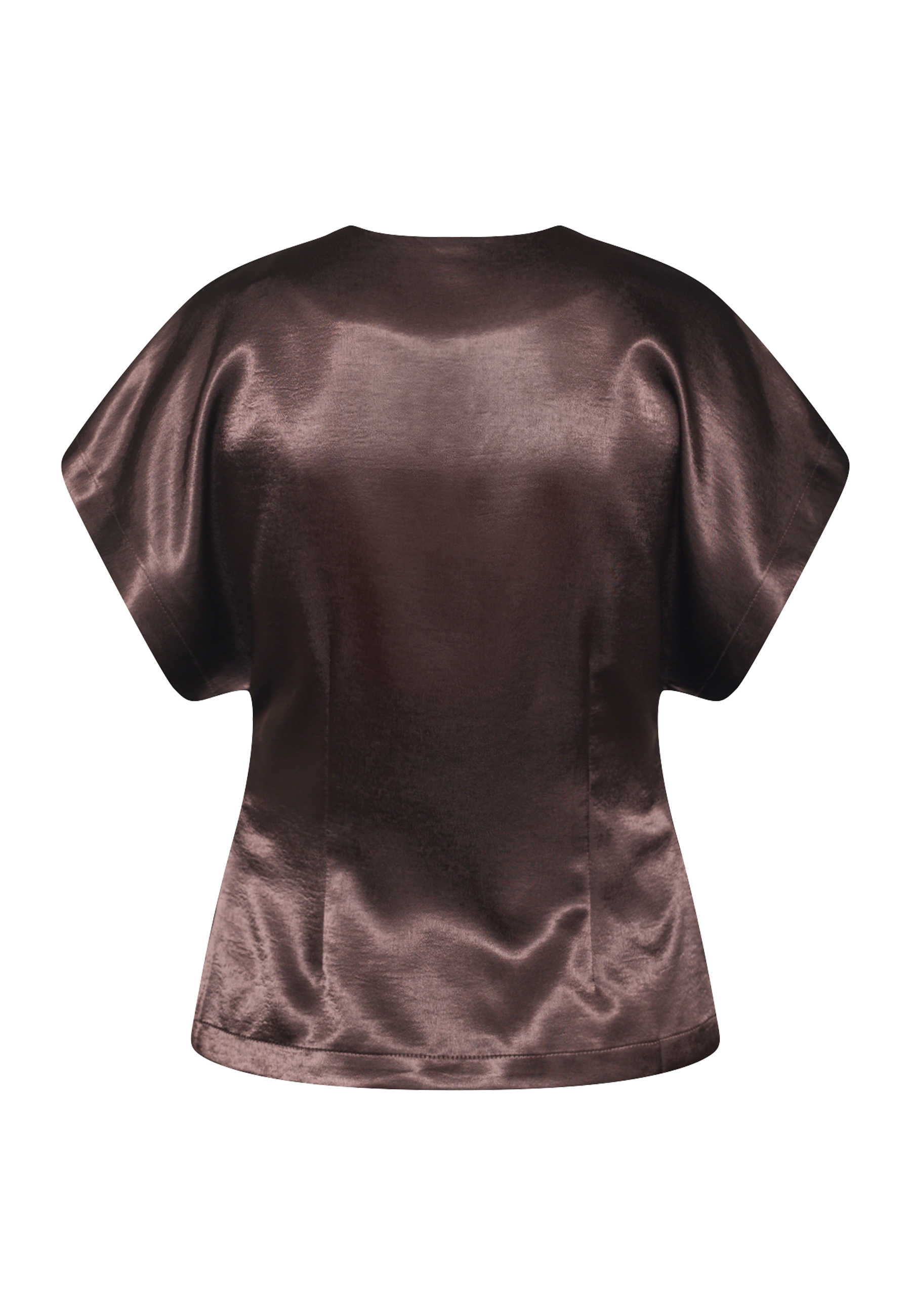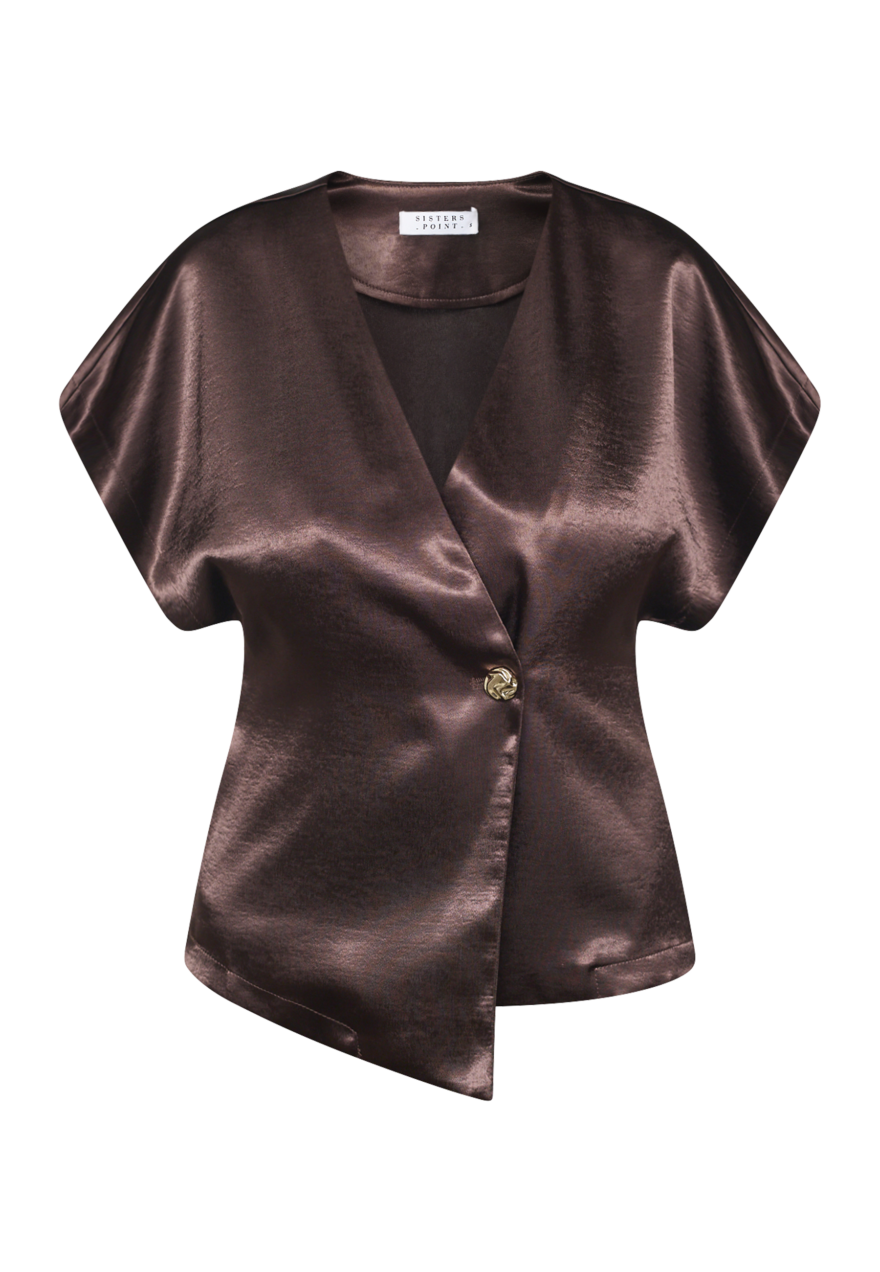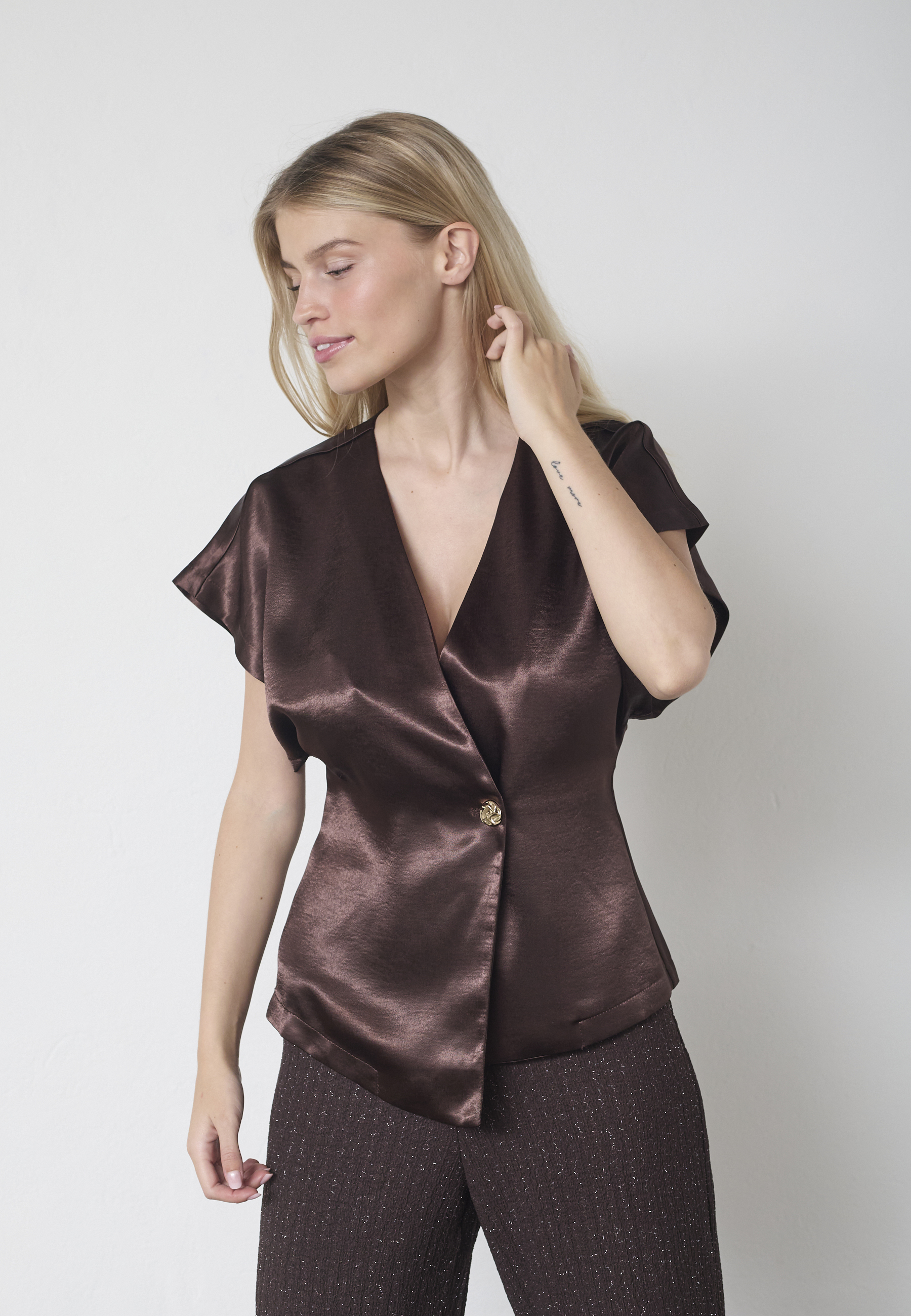 GEVELA-VE4 is a short-sleeved top with a deep v-neck and an asymmetrical side closure with a single gold button. The top has slightly defined shoulders and a fitted silhouette. The model is wearing a size S