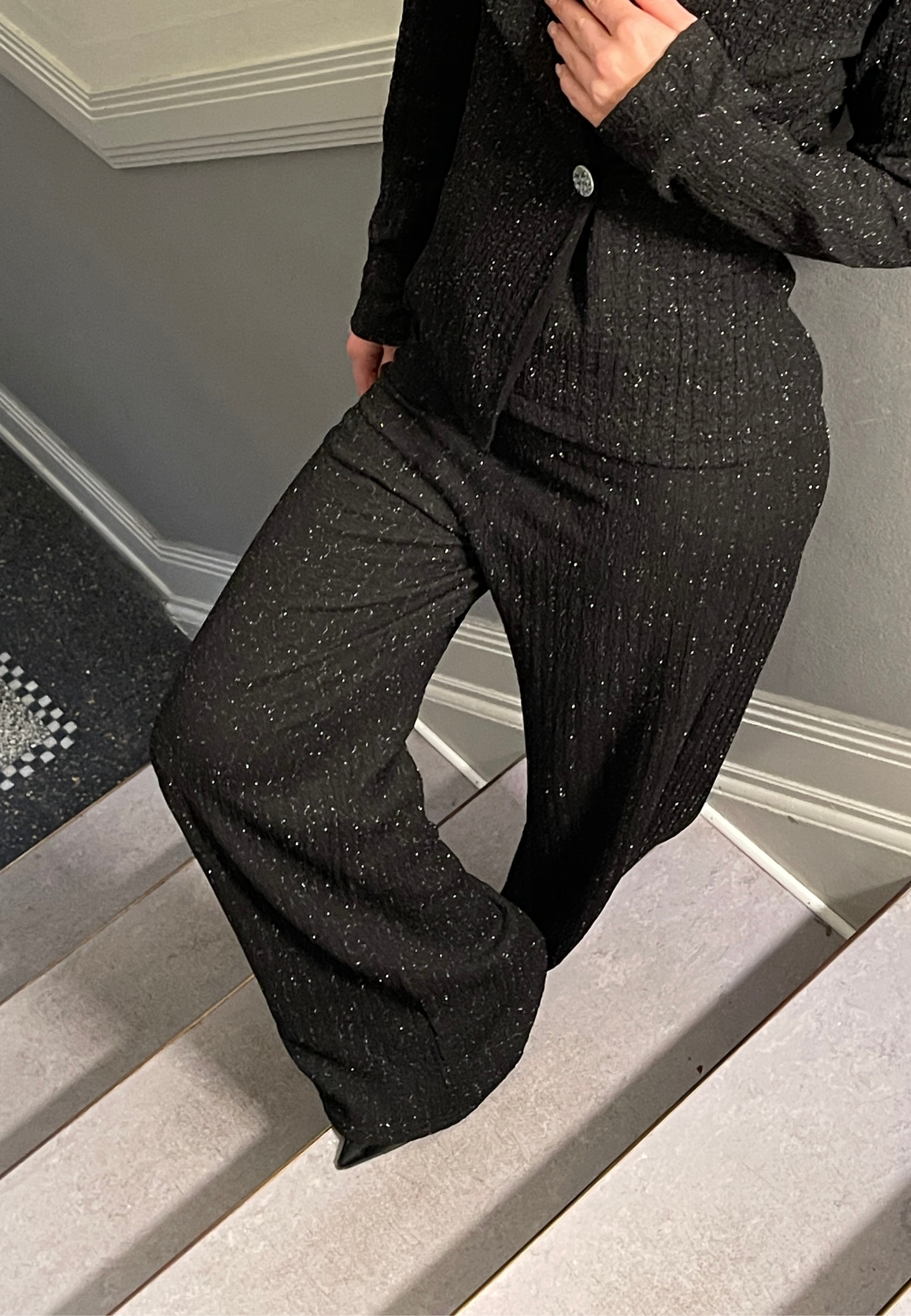 GLUT-PA19 is a high-waisted wide-leg trousers in a structured quality. The fabric is decorated with shiny threads and has a comfortable, loose fit. The model is wearing a size S