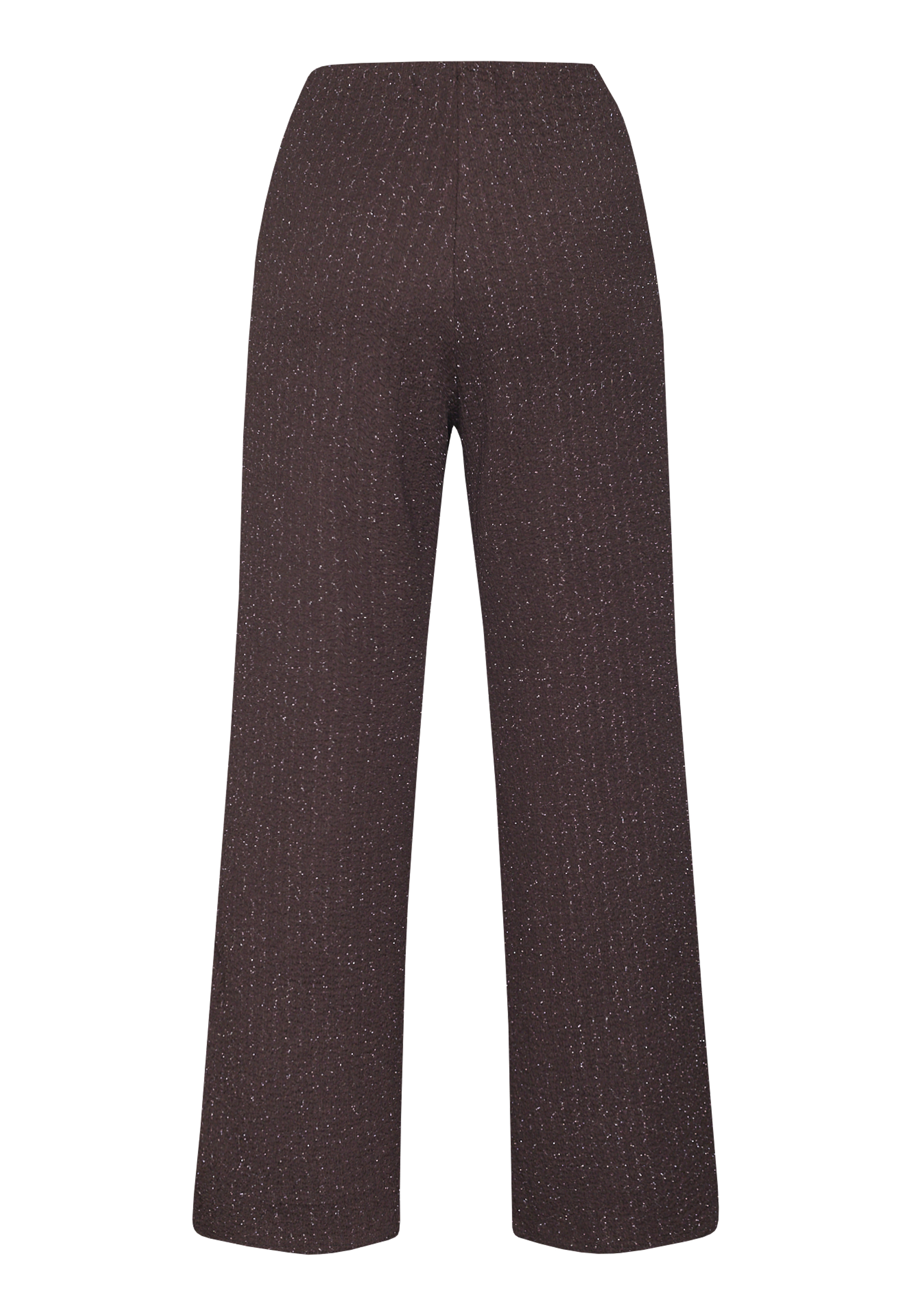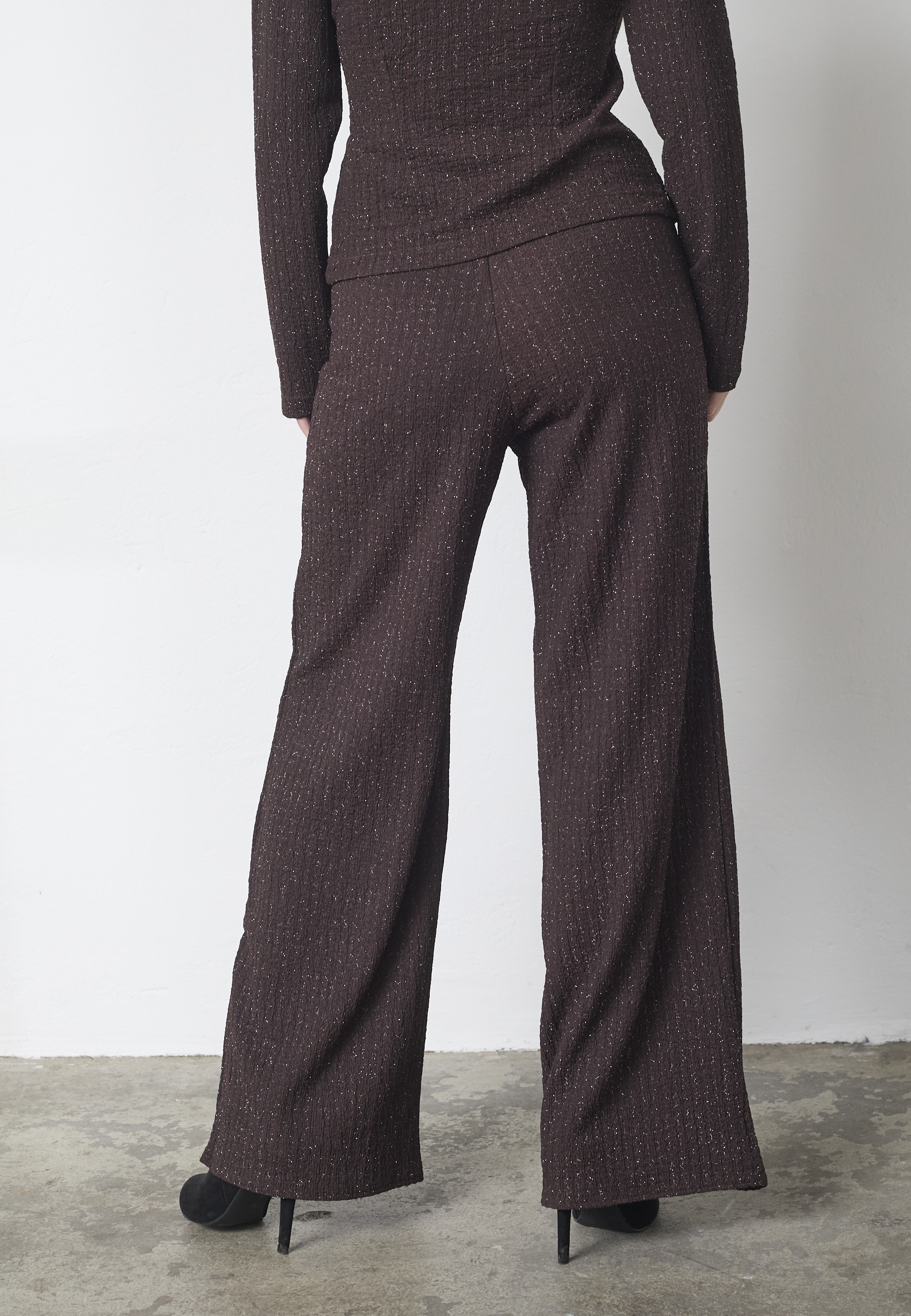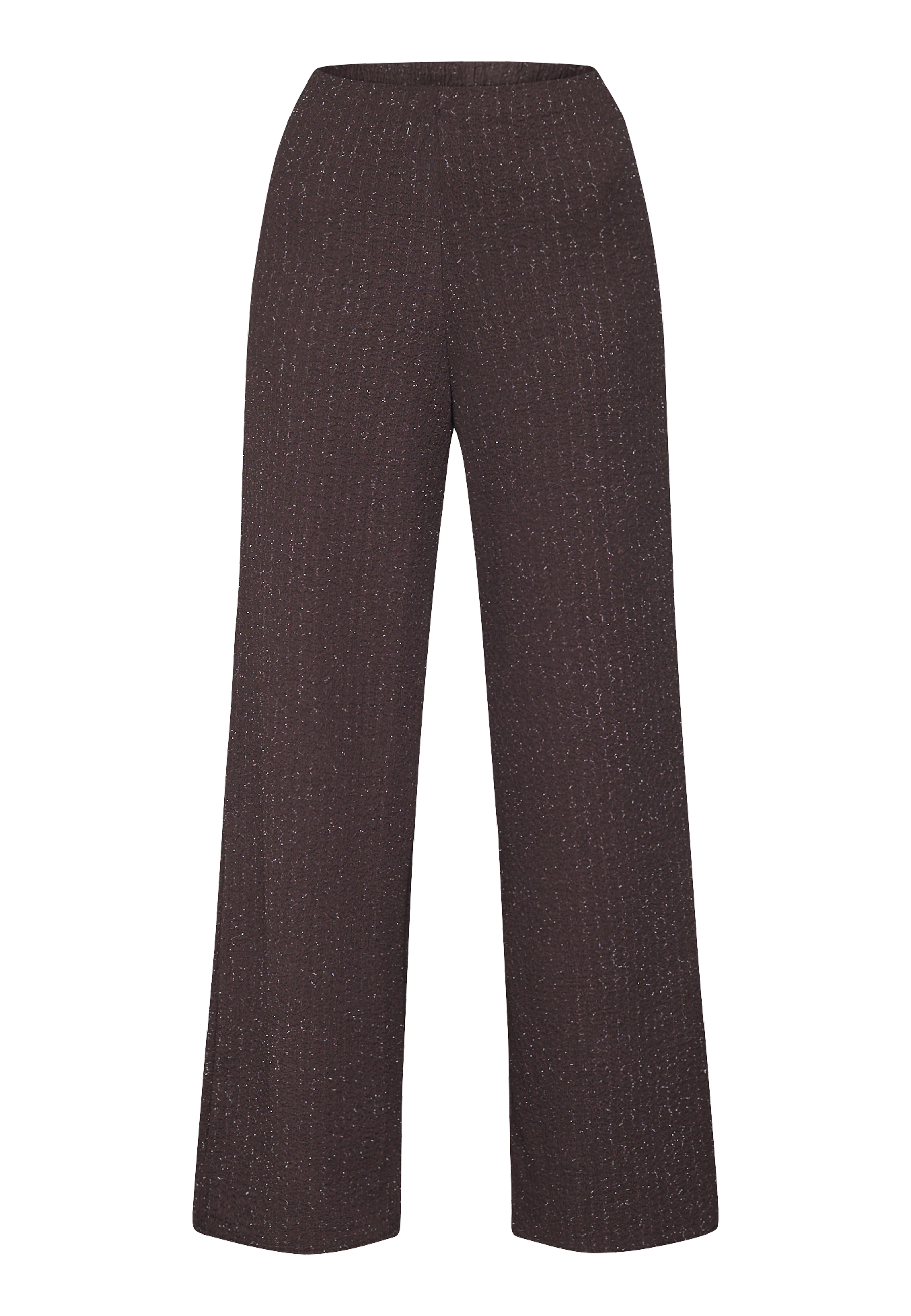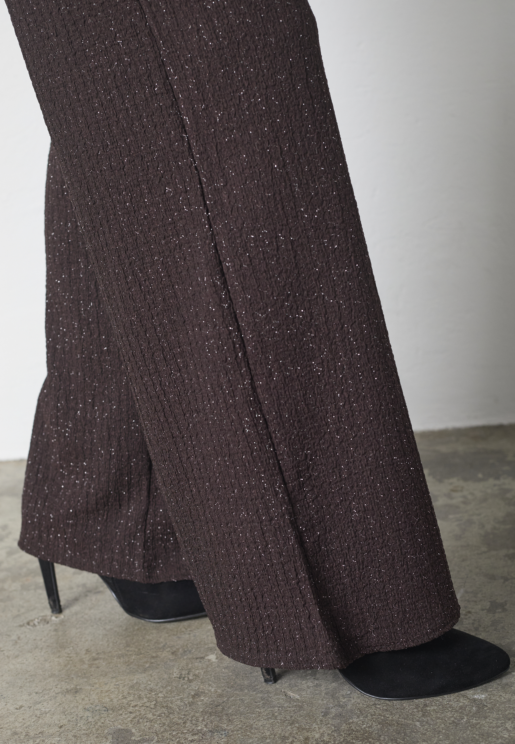 GLUT-PA19 is a high-waisted wide-leg trousers in a structured quality. The fabric is decorated with shiny threads and has a comfortable, loose fit. The model is wearing a size S