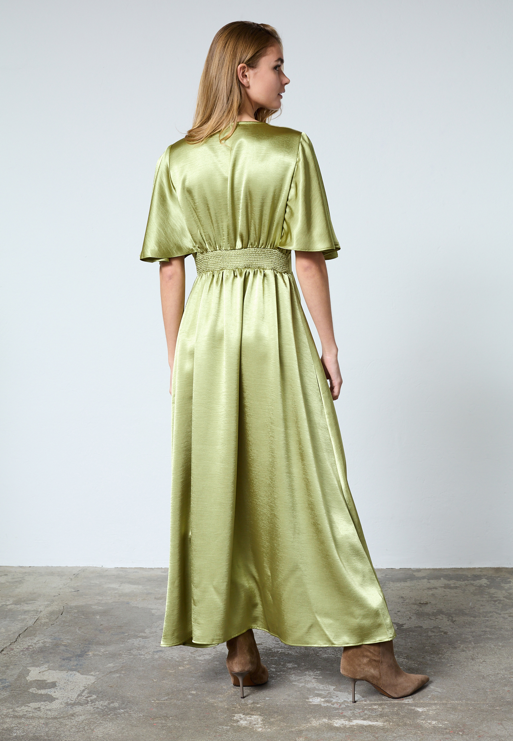 GISELA-DR16 is an elegant, long dress in a smooth, shiny quality. The dress features a flattering V-neckline with a wrap effect, short batwing sleeves, and a wide waistband at the waist, creating a beautiful silhouette. The model is wearing a size S.