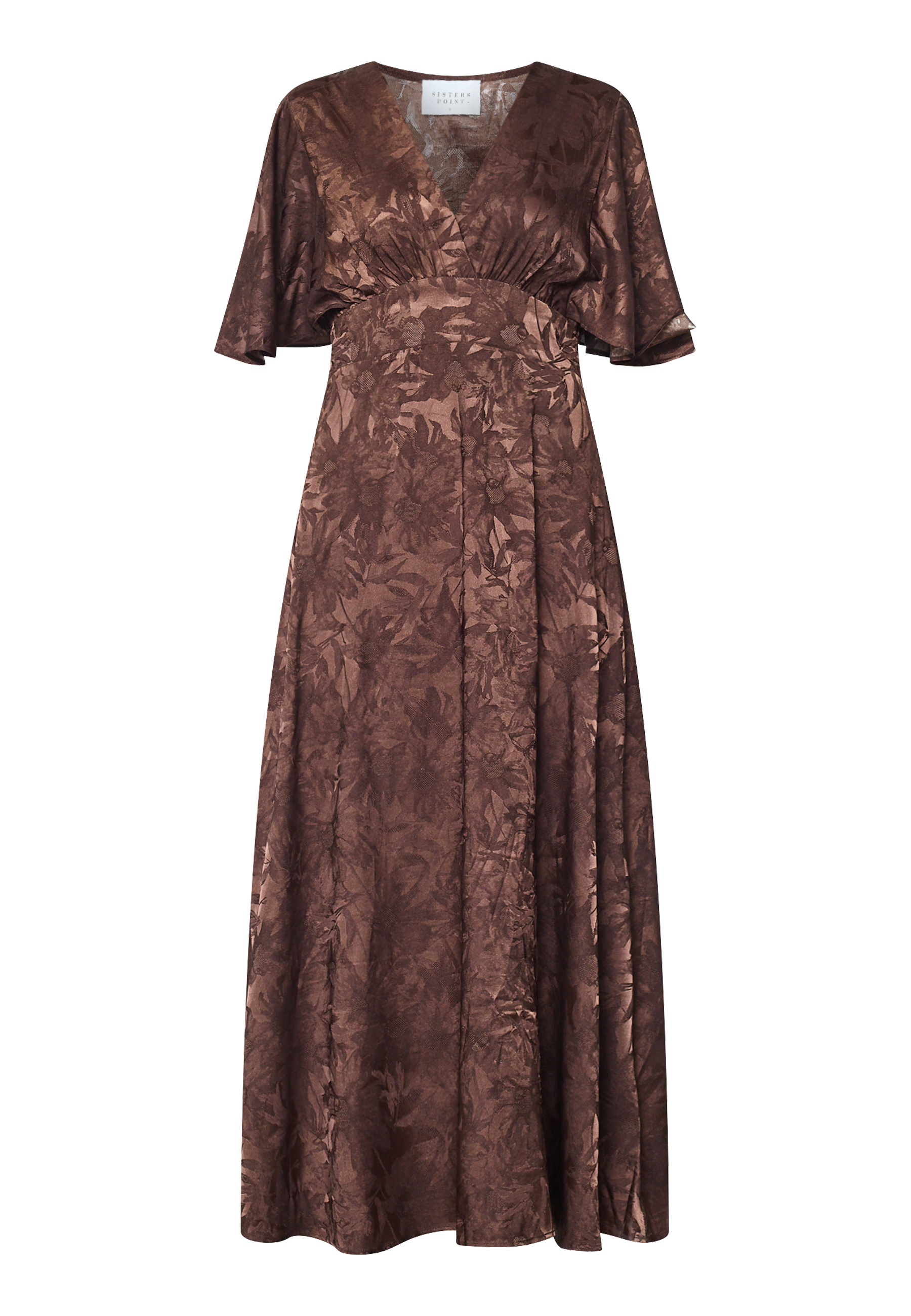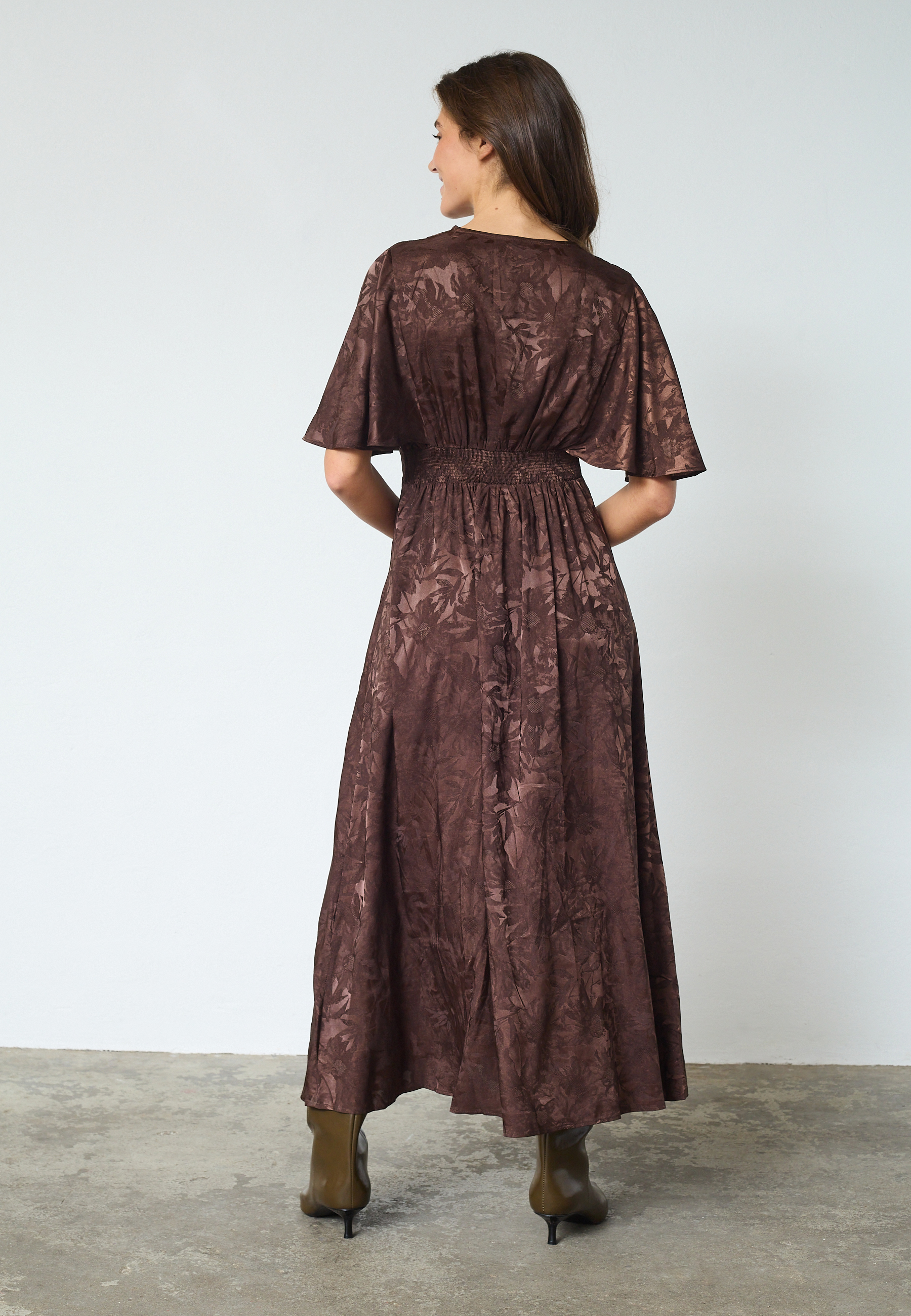 GISELA-DR23 is a long dress with a V-neckline and short wide sleeves. It has a pattern with floral motifs and a slim waist that accentuates the silhouette. The model is wearing a size S and is 175 cm tall.
