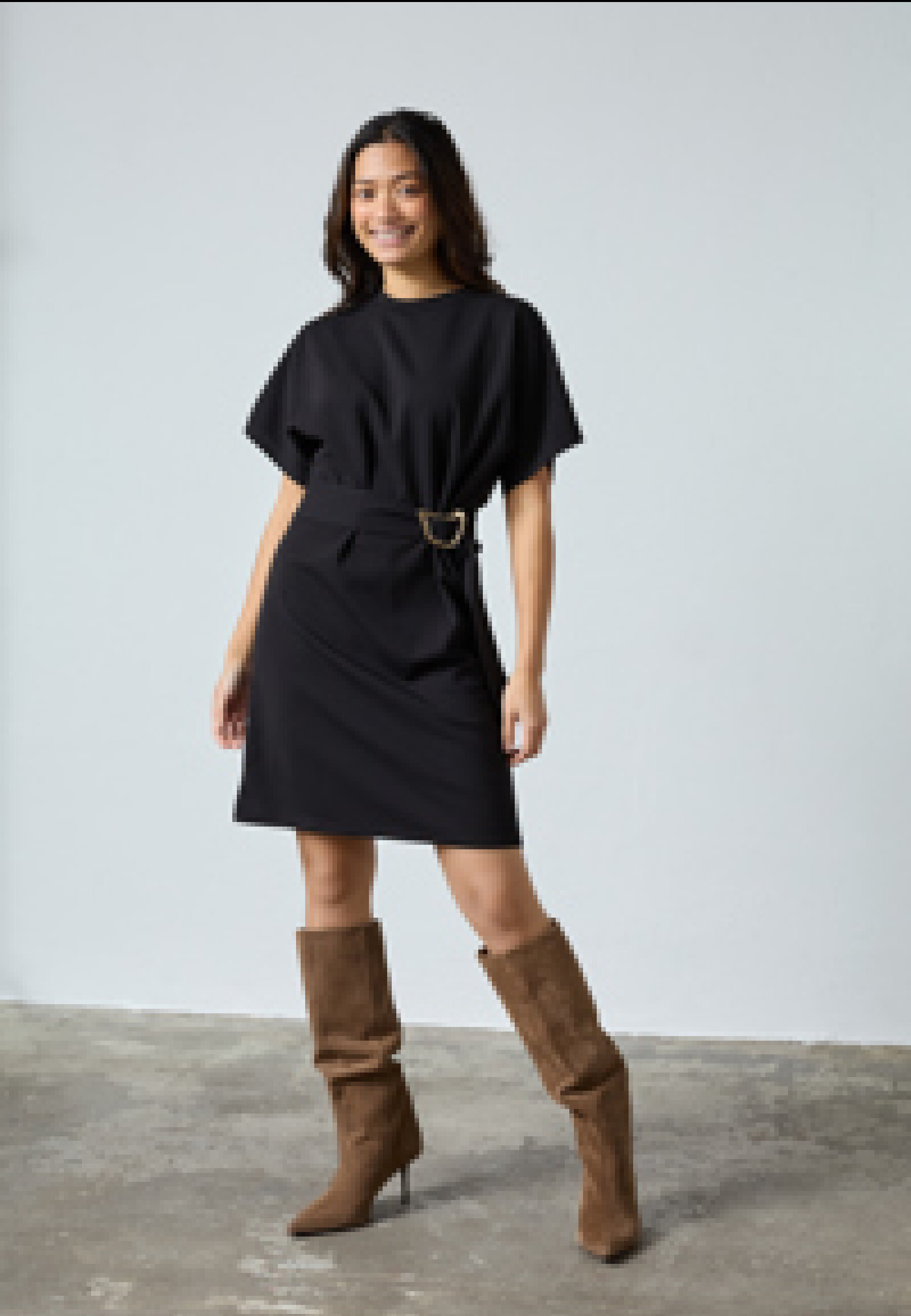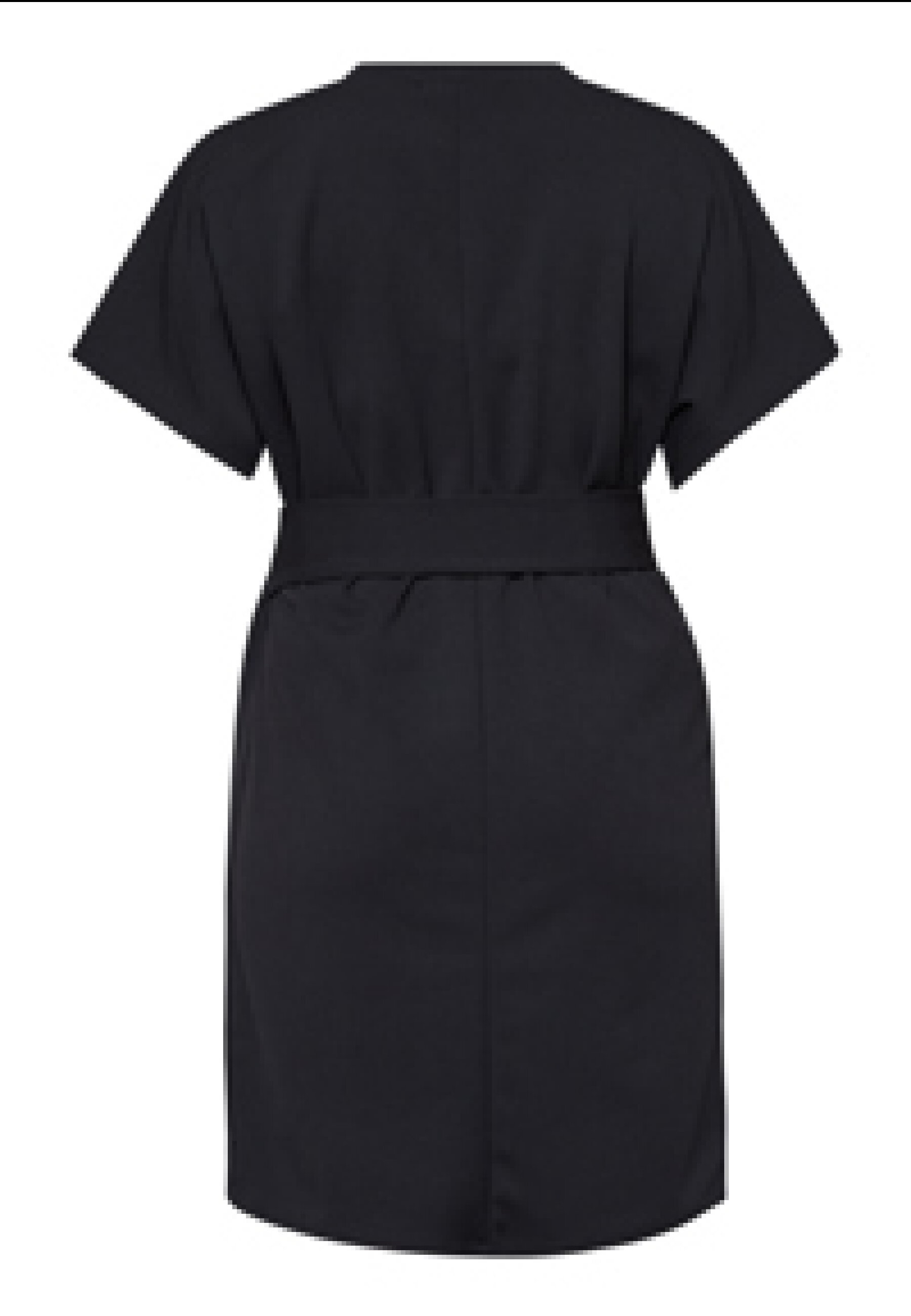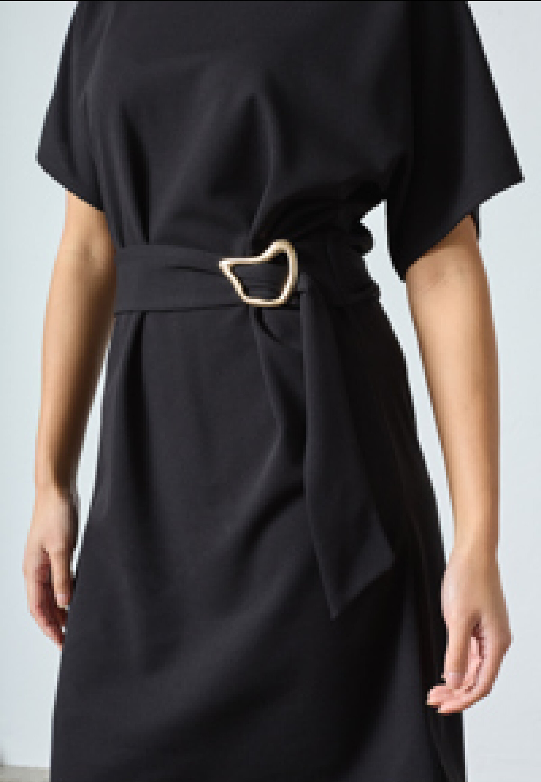 GELIA-DR2 is a short dress with short, batwing sleeves and a round neckline. It has a loose fit that is adjusted with a belt with a buckle. The model is wearing a size S and is 175 cm tall.