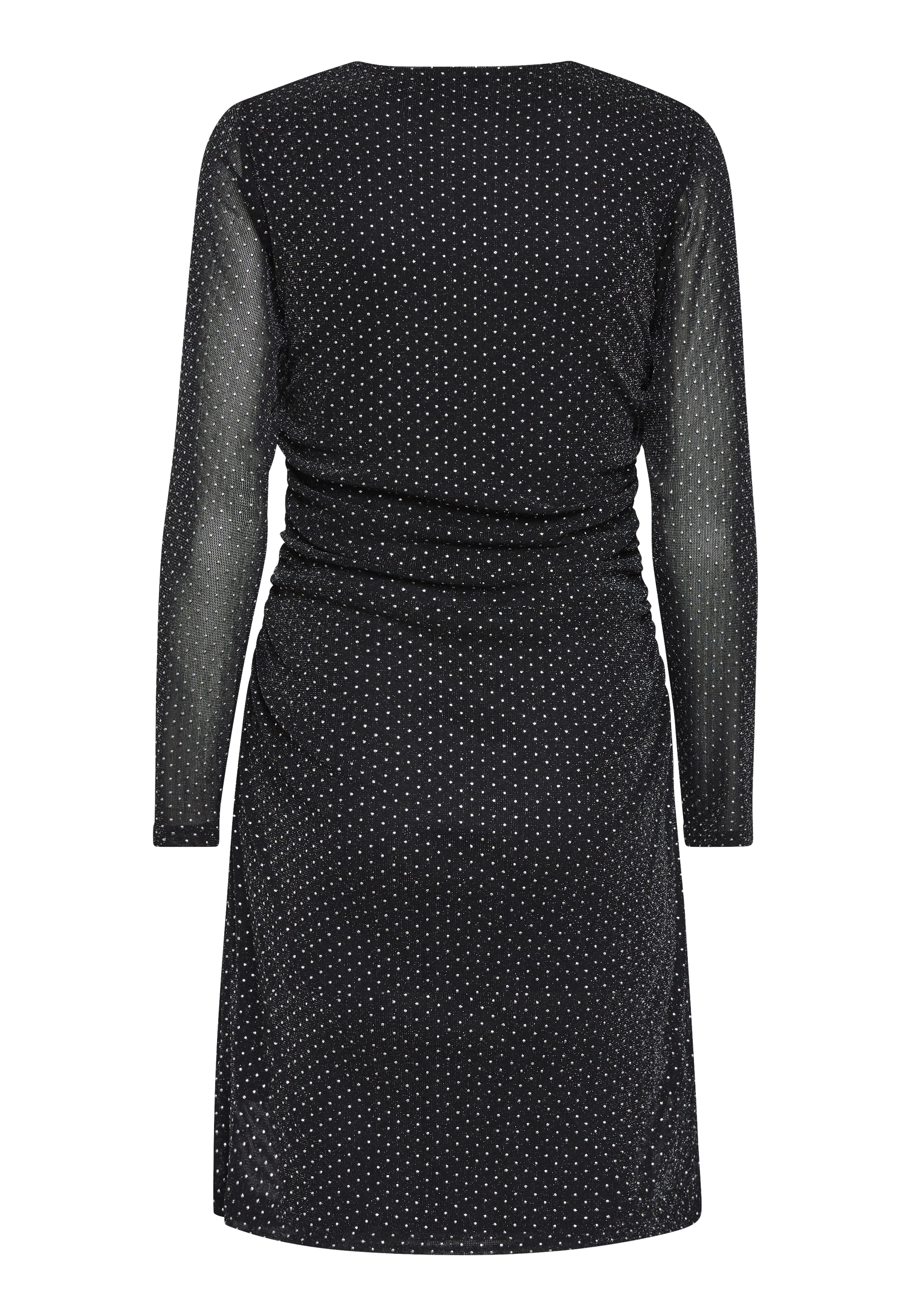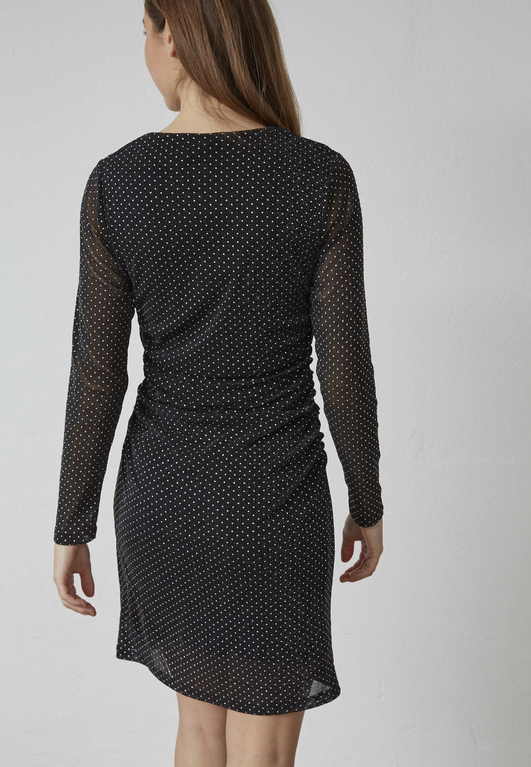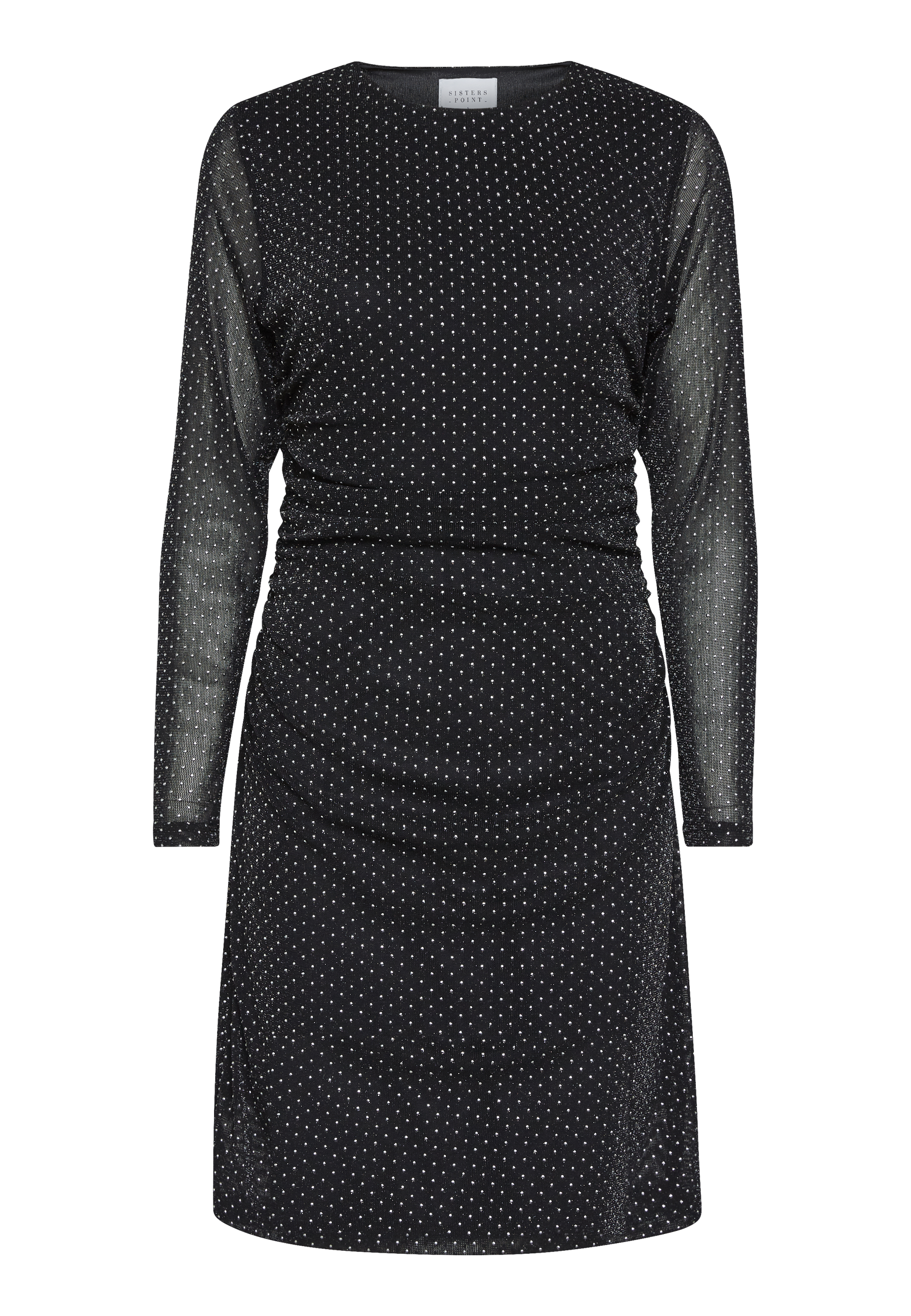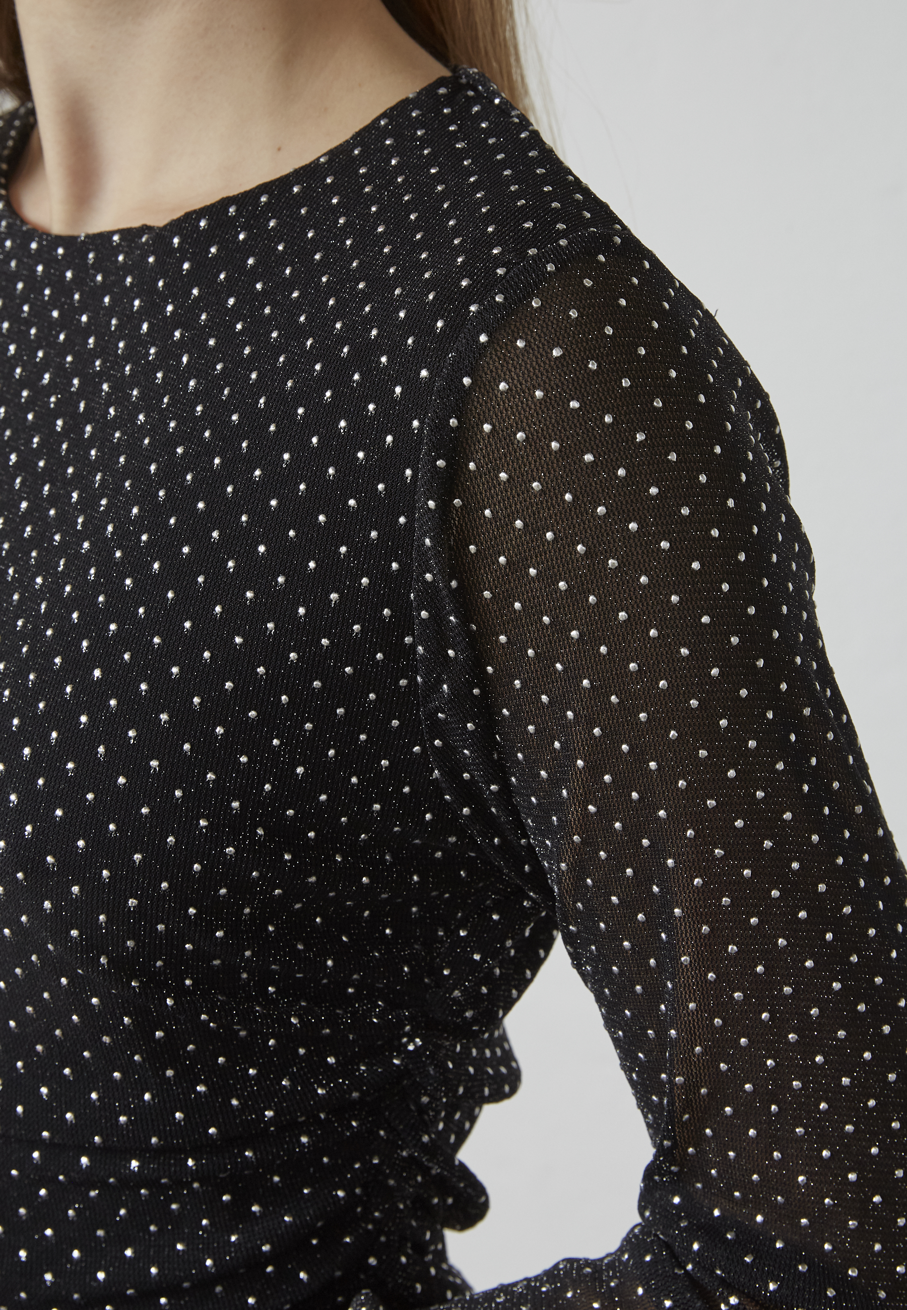 ESME-S.LS1 is a short mesh dress with a sewn-on petticoat, with transparent long sleeves. The dress has a ruched waist and is detailed with printed rubber dots. The model is wearing a size S and is 175 cm tall.