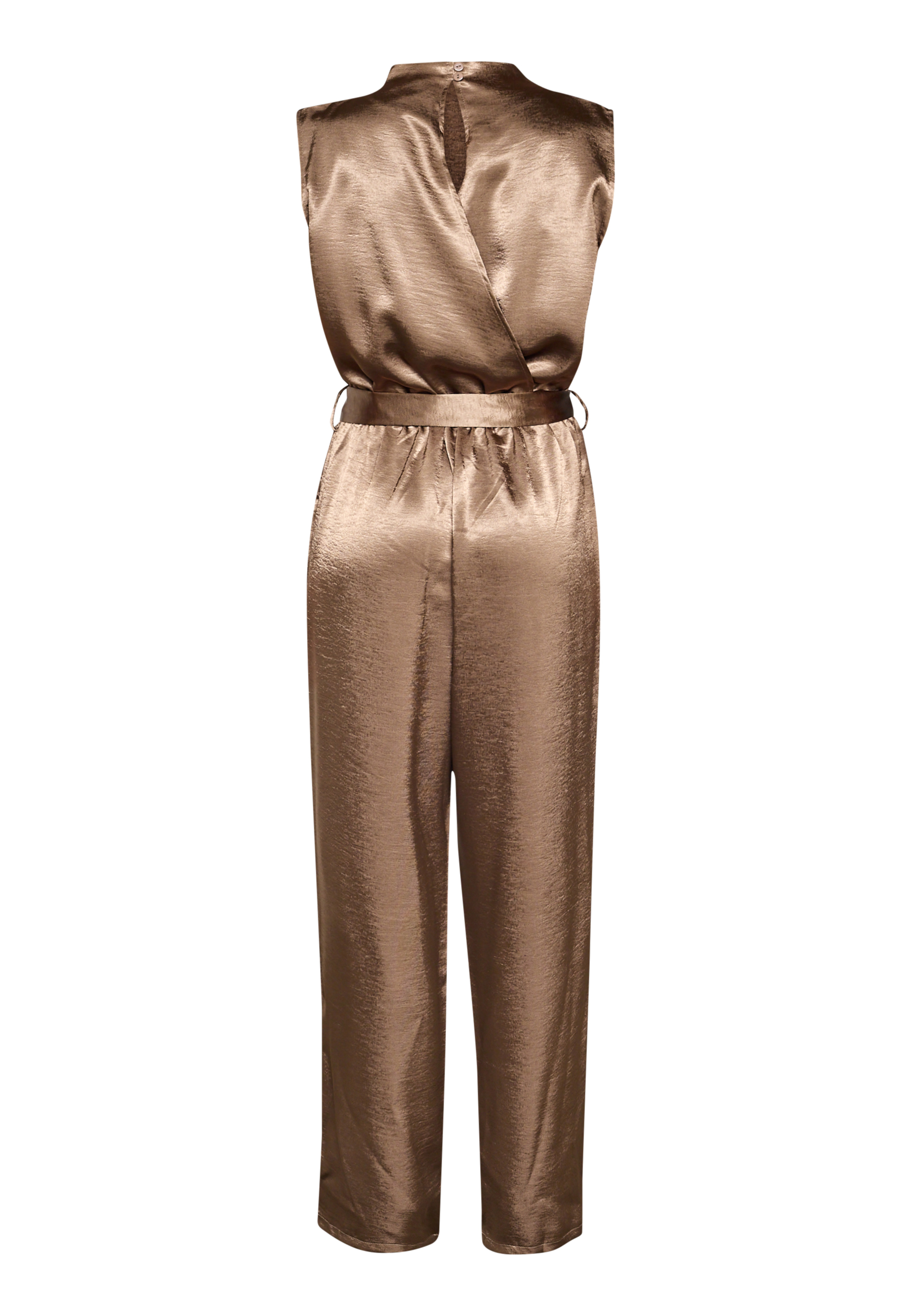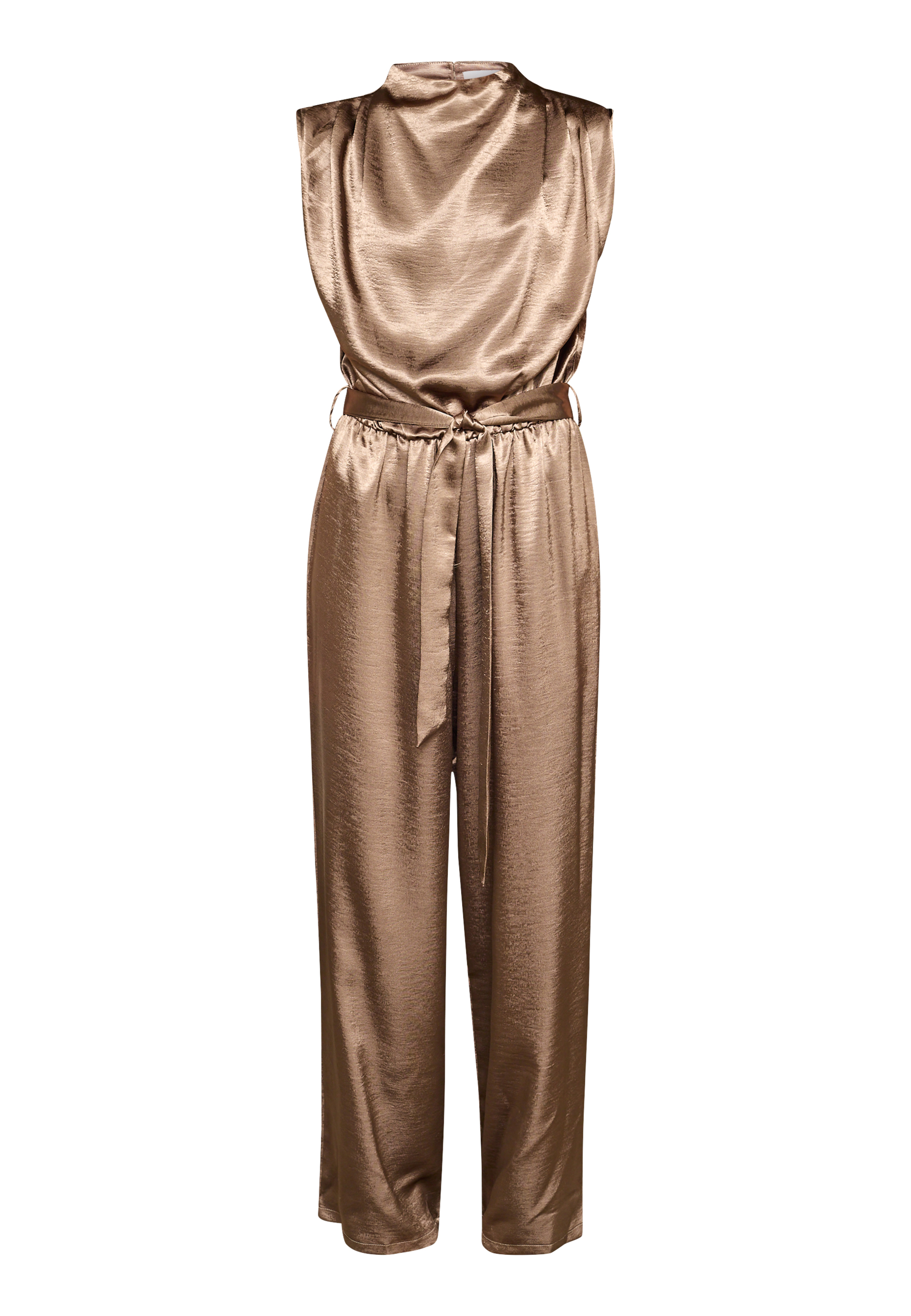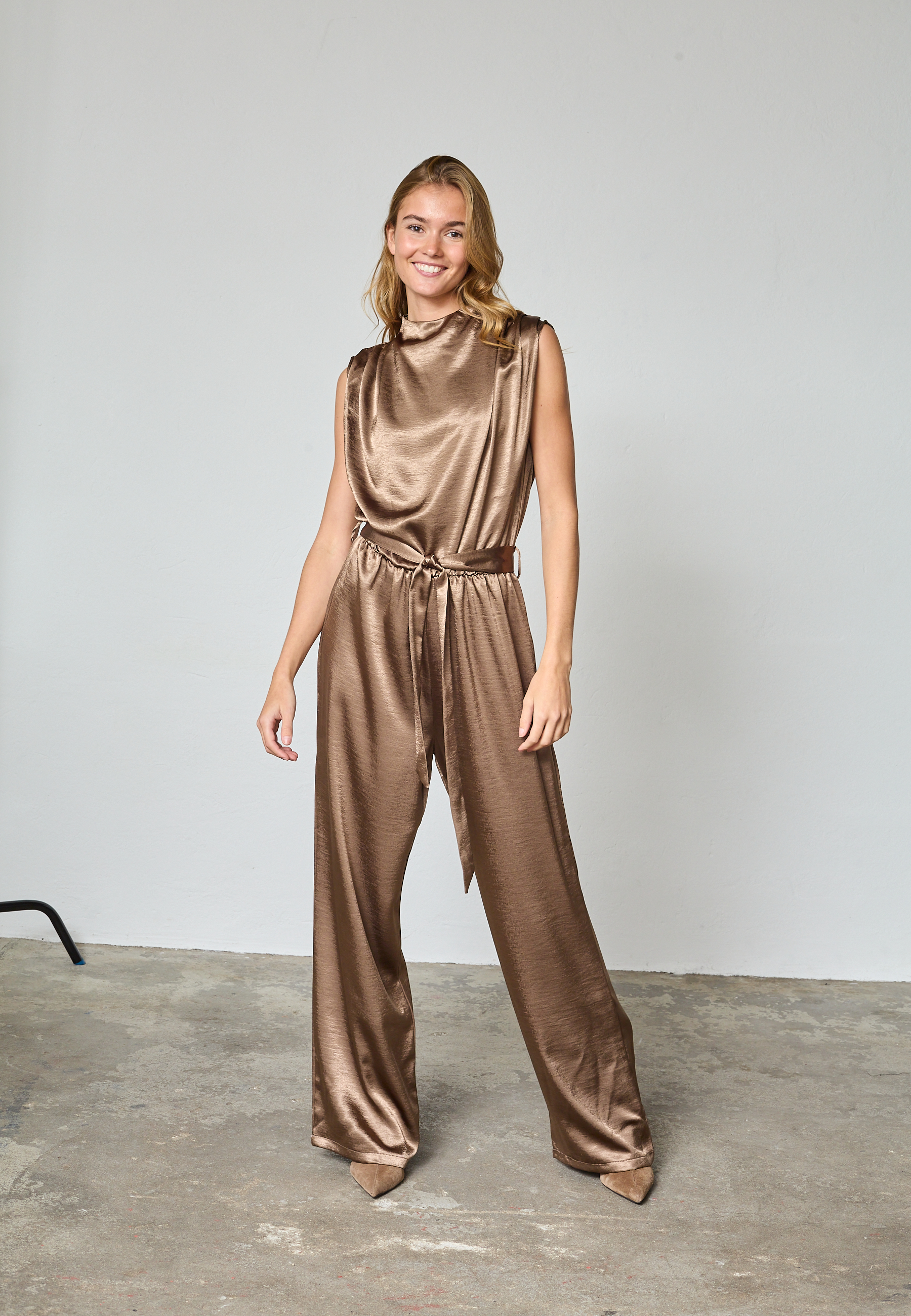 GUTO-JU5 is an elegant satin jumpsuit without sleeves. It has a detachable tie around the waist and a beautiful neckline in the jerk. The model has a size S on.